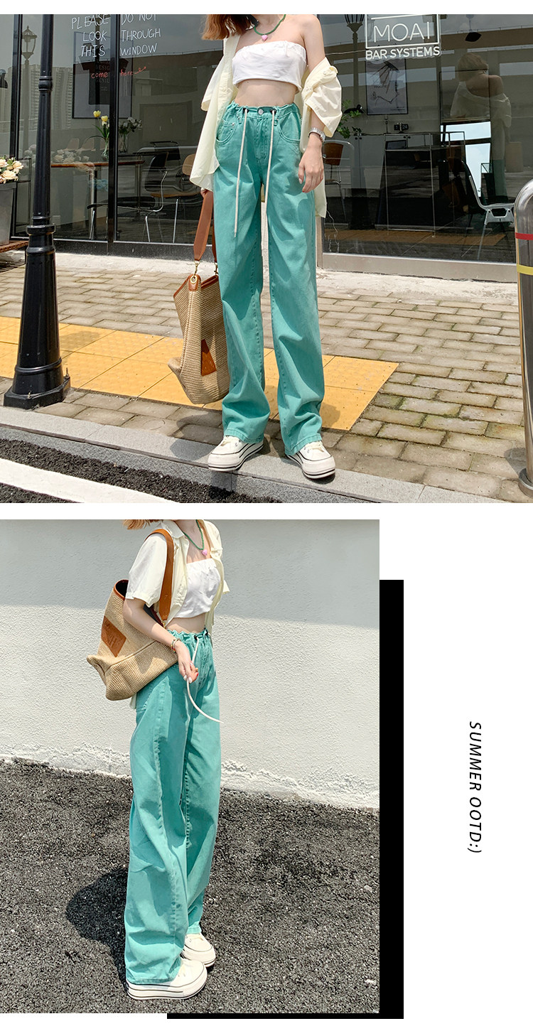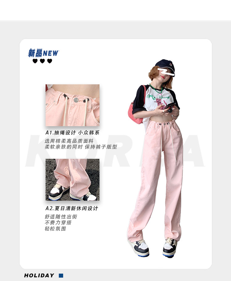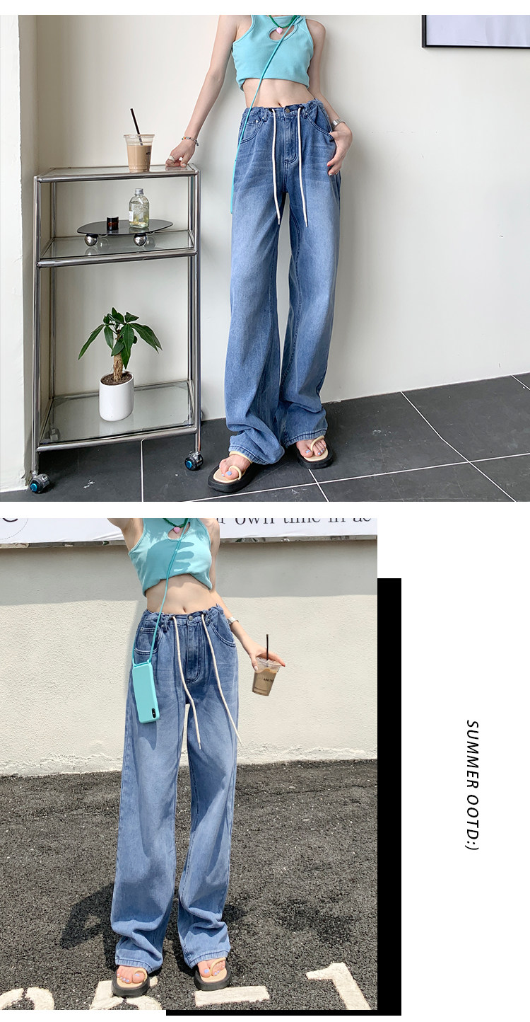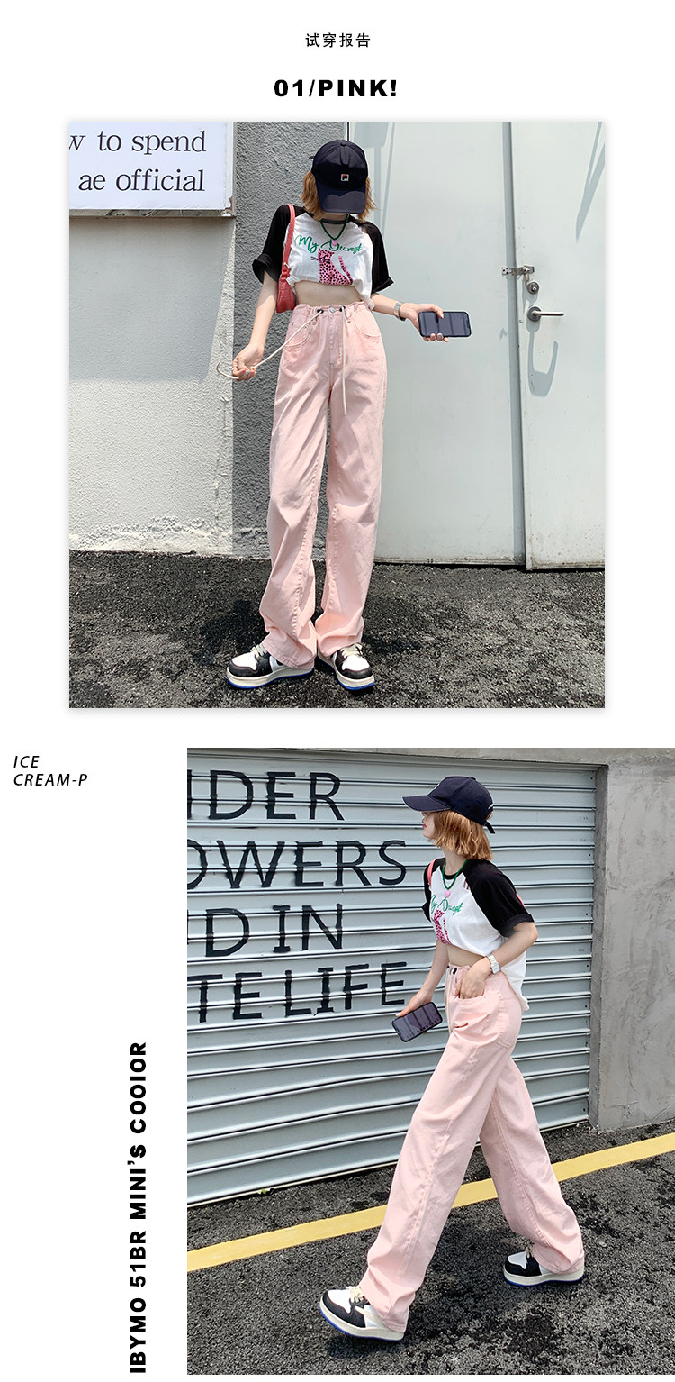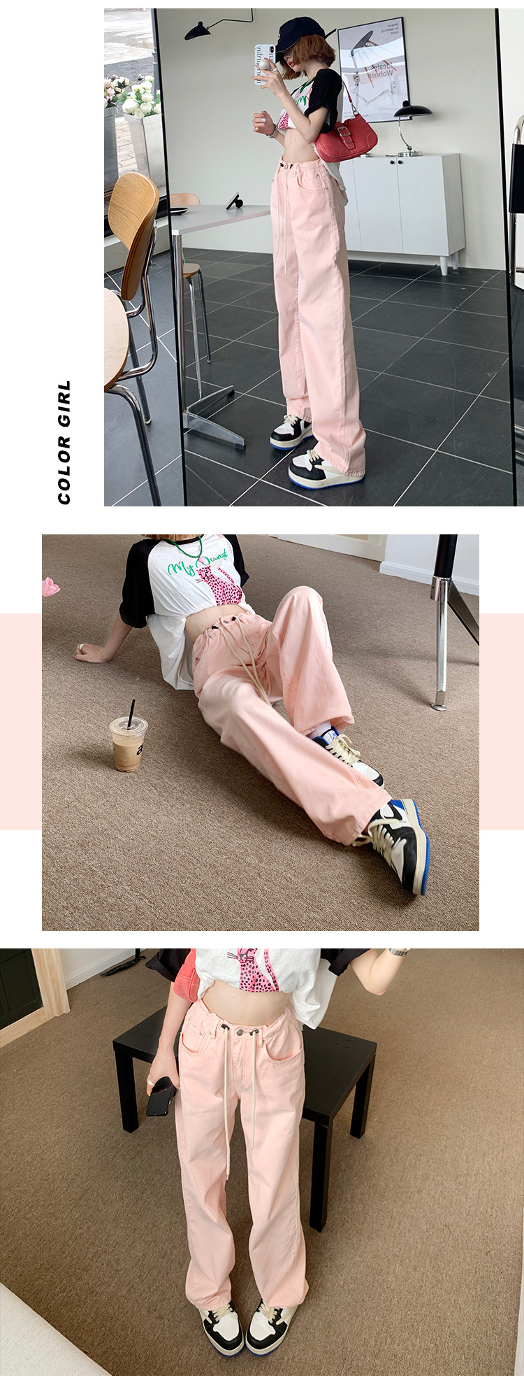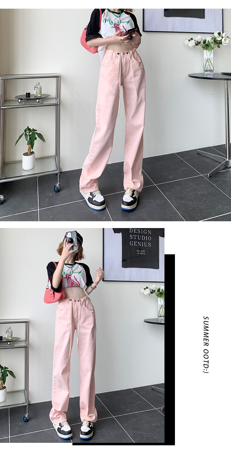 粉色抽繩高腰牛仔褲女2023年新款夏季寬鬆緊腰小眾休閒闊腿拖地褲