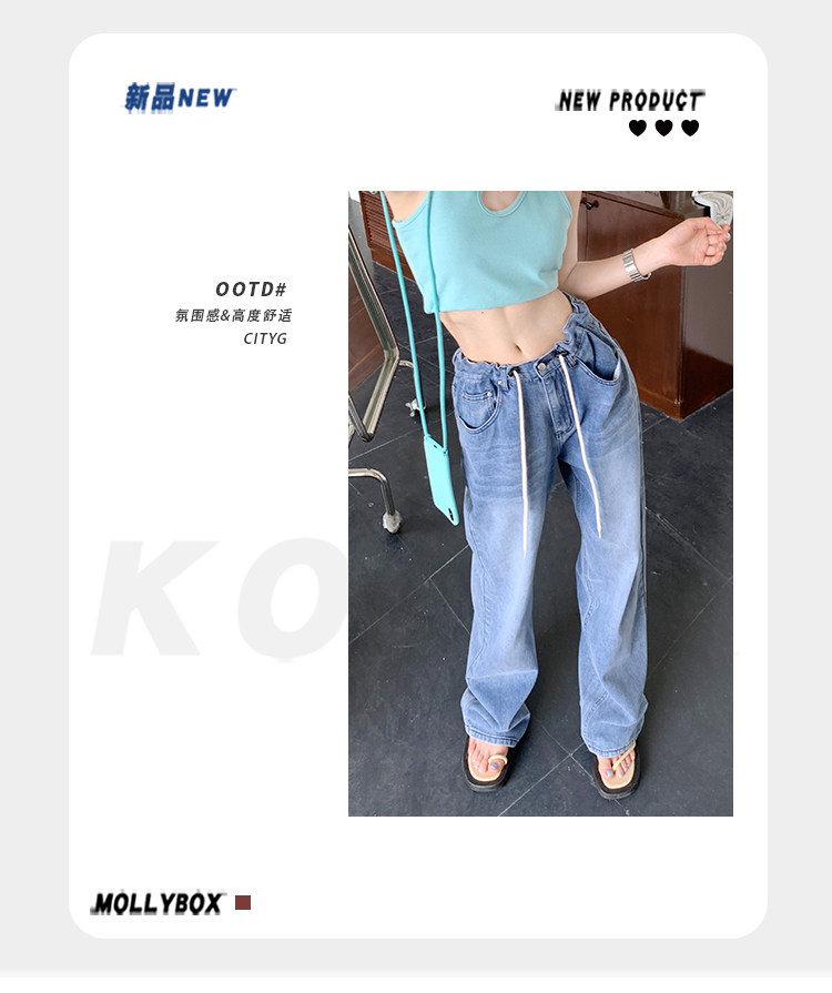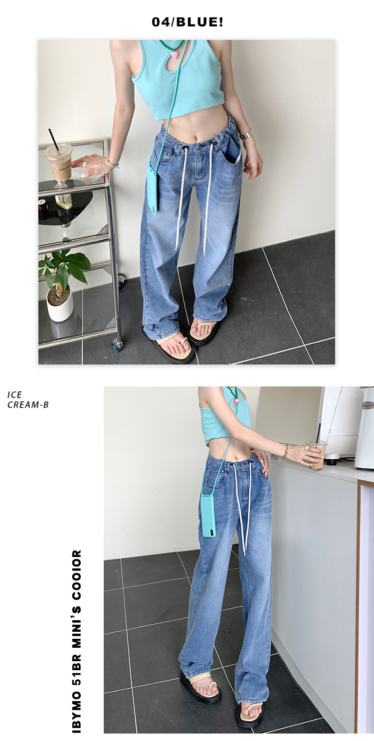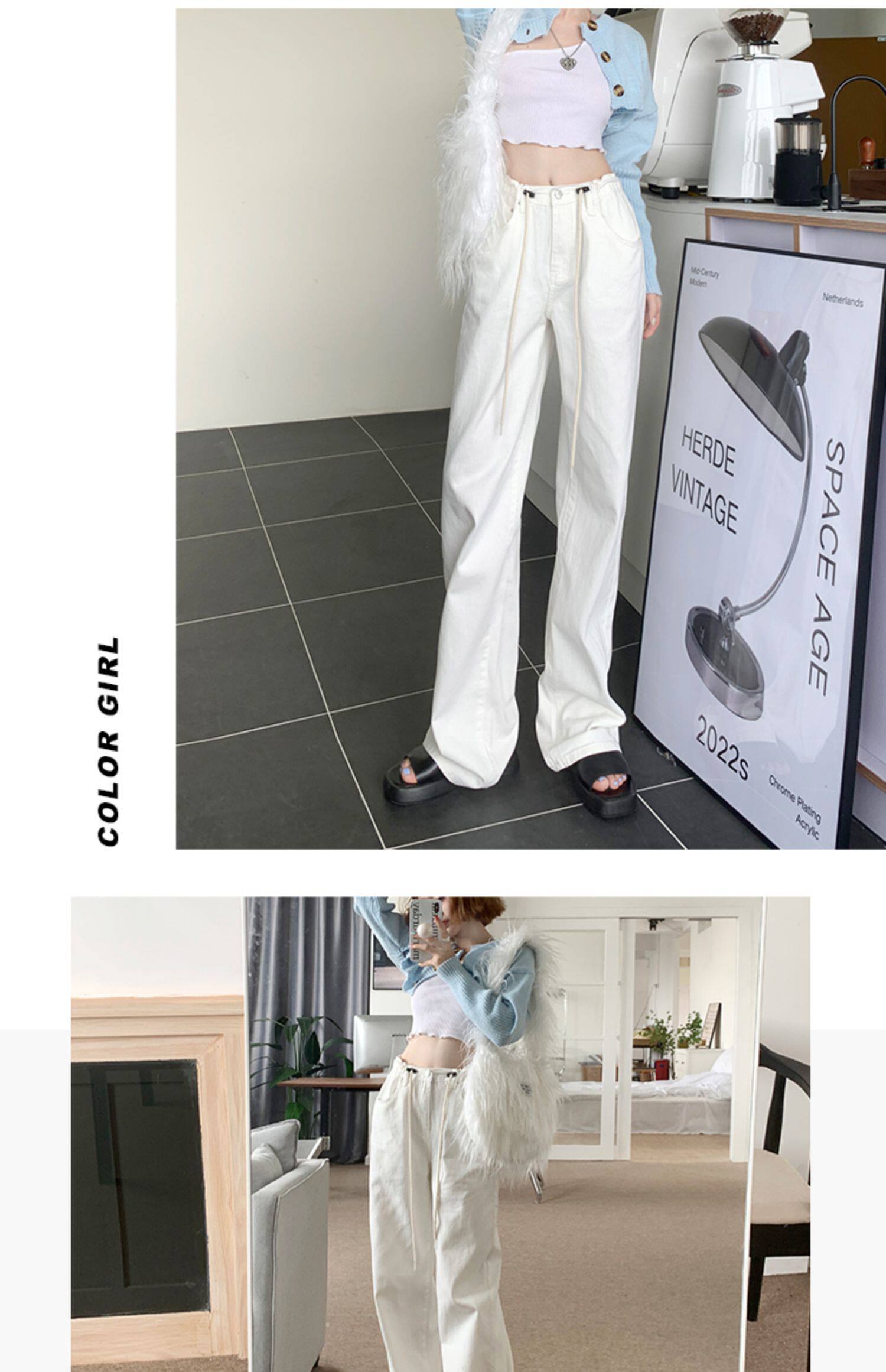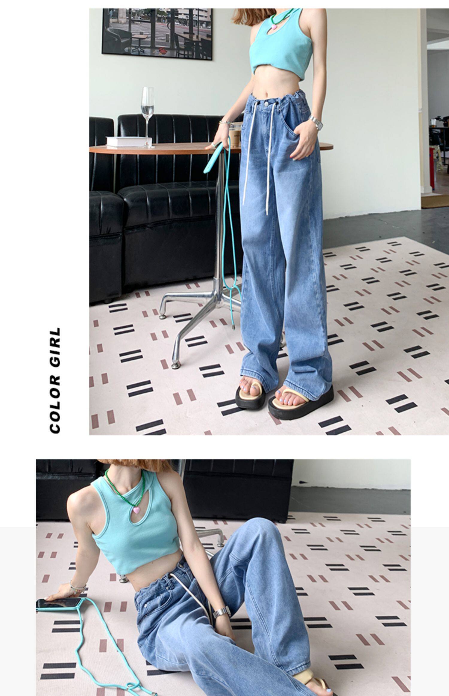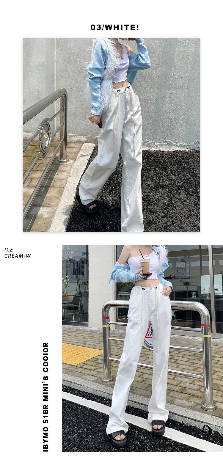 粉色抽繩高腰牛仔褲女2023年新款夏季寬鬆緊腰小眾休閒闊腿拖地褲