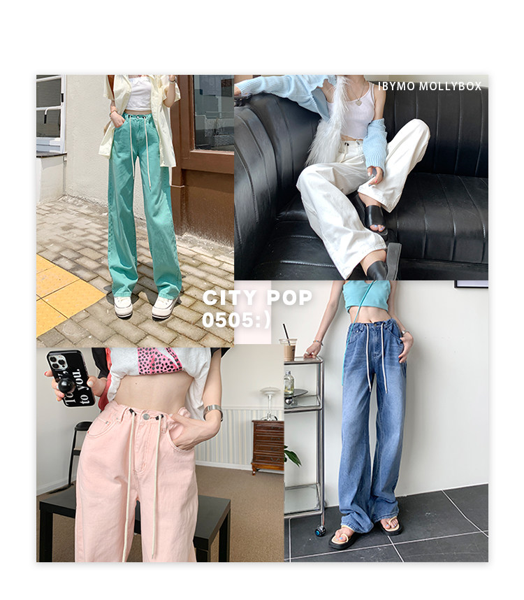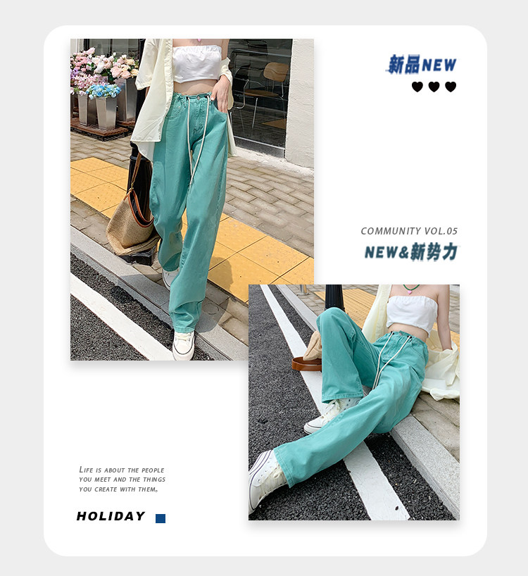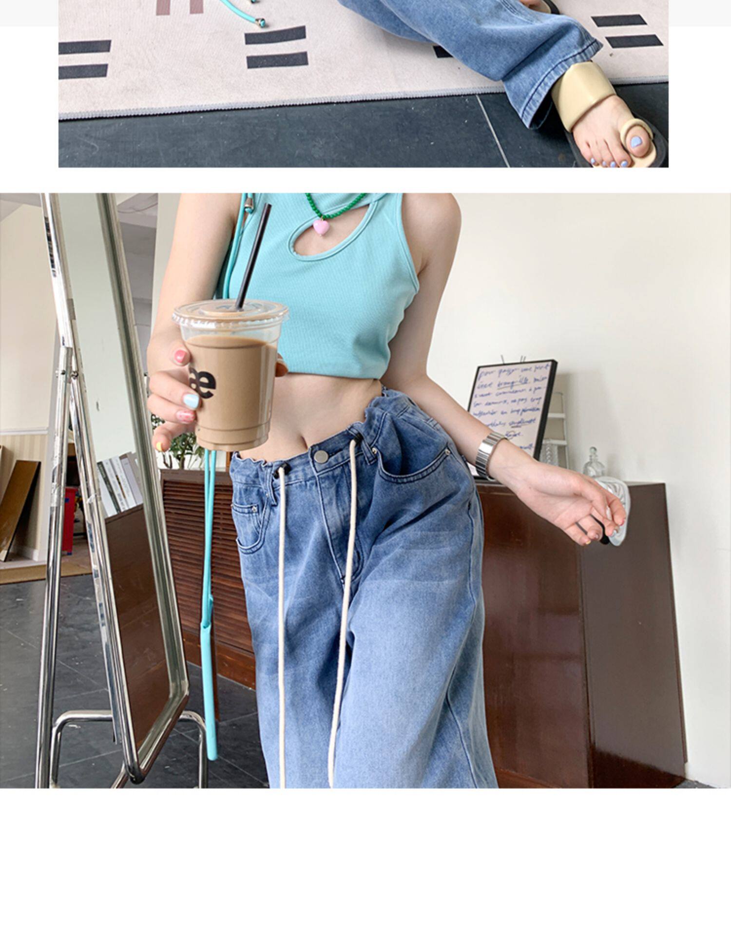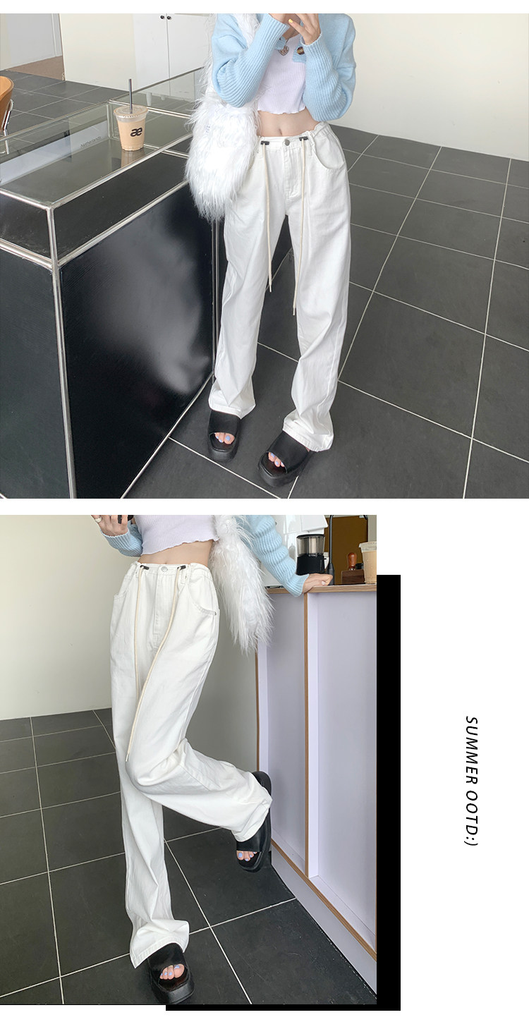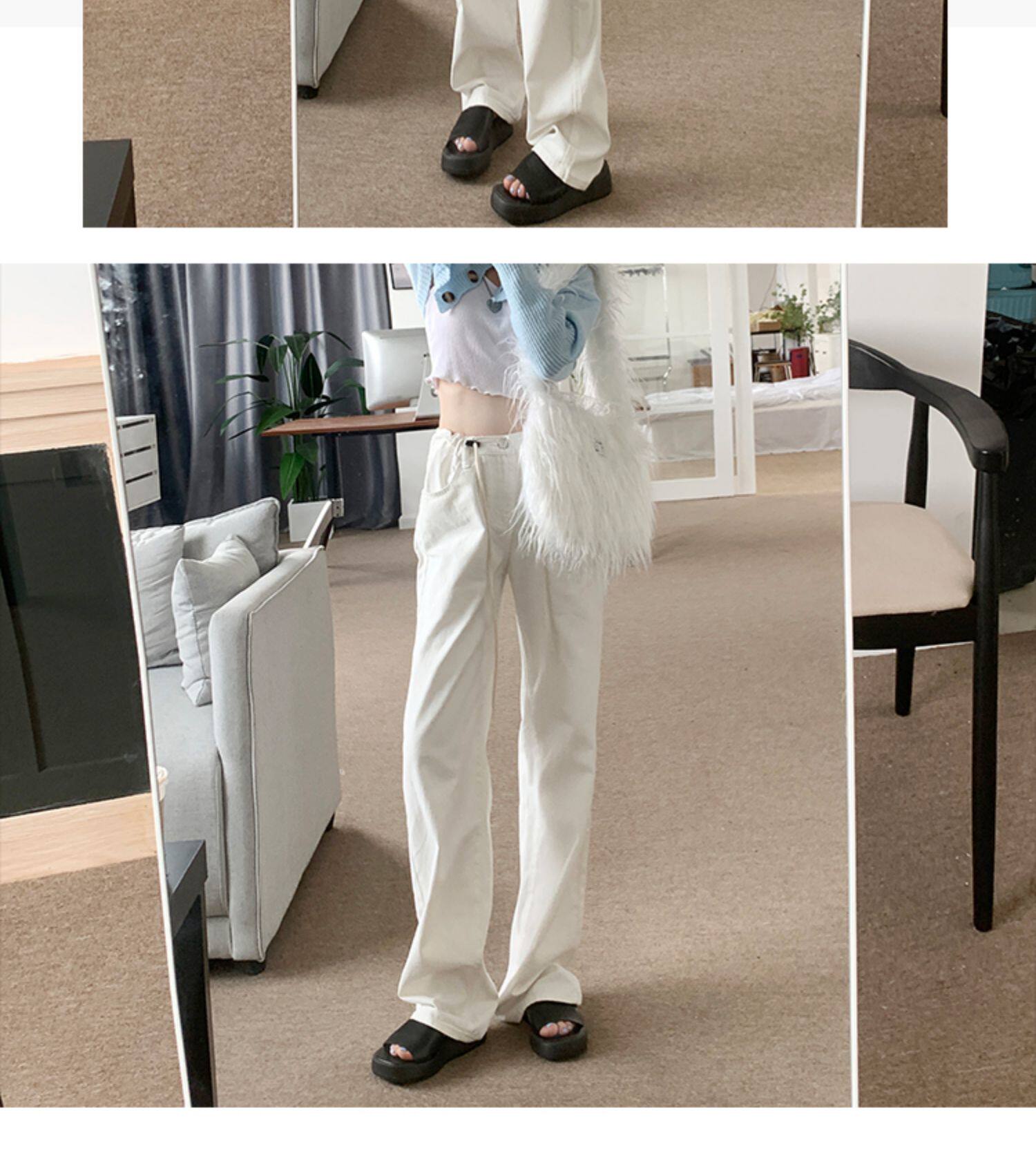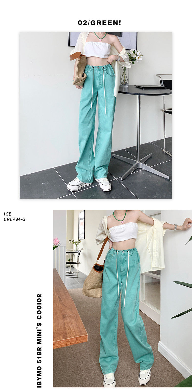 粉色抽繩高腰牛仔褲女2023年新款夏季寬鬆緊腰小眾休閒闊腿拖地褲