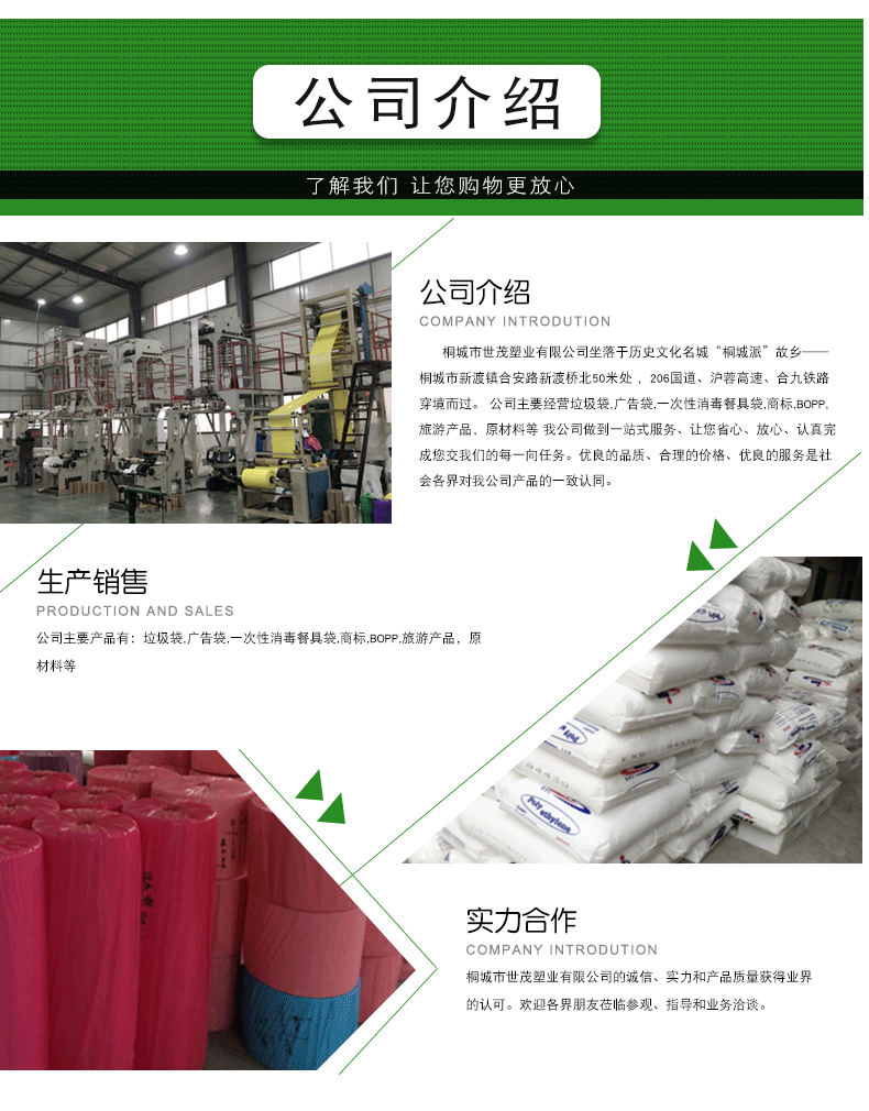 桐城市世茂塑业有限公司坐落于历史文化名城“桐城派”故乡——桐城市新渡镇合安路新渡桥北50米处 ,206国道、沪蓉高速、合九铁路穿境而过,合肥、安庆机场近在咫尺,万里长江涛声可闻,交通运输极为便捷。 公司主要经营垃圾袋,广告袋,一次性消毒餐具袋,商标,BOPP,旅游产品,原材料等 我公司做到一站式服务、让您省心、放心、认真完成您交我们的每一向任务。优良的品质、合理的价格、优质的服务是社会各界对我公司产品的一致认同。