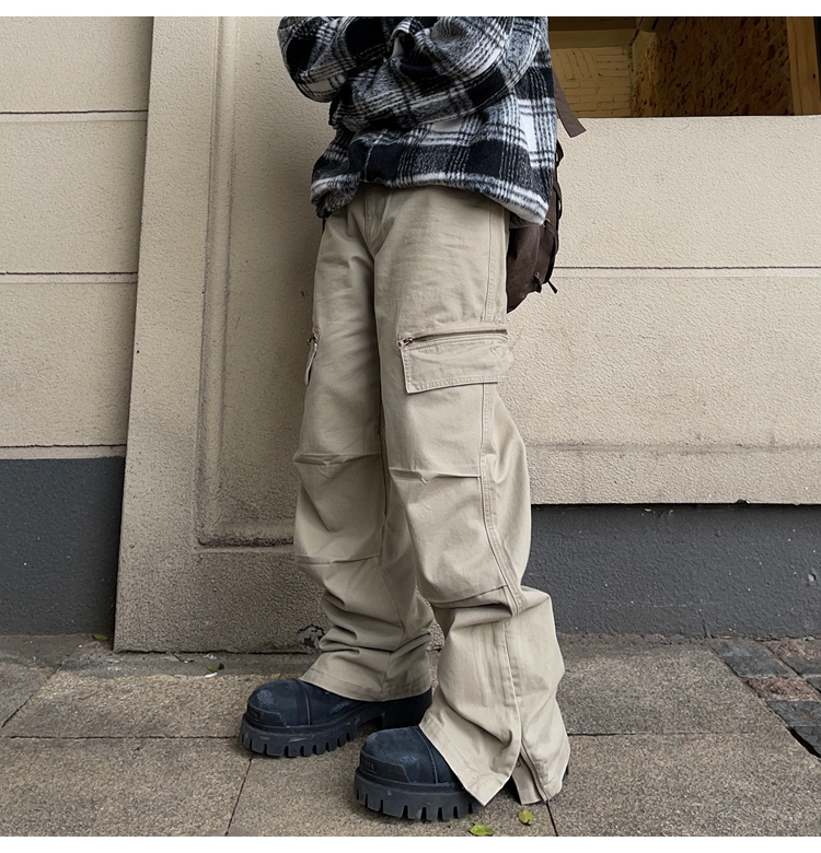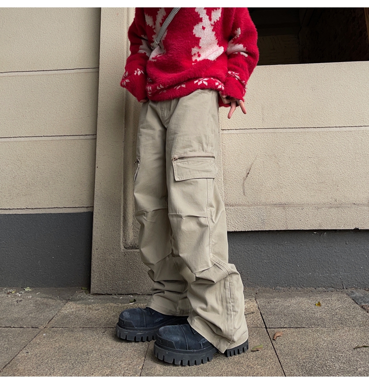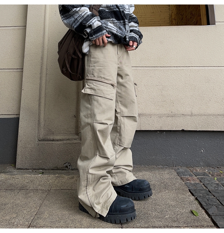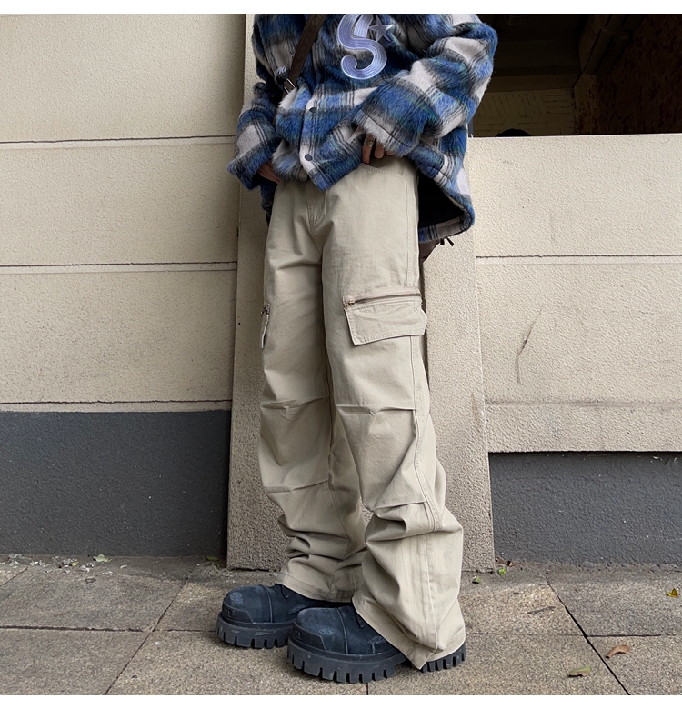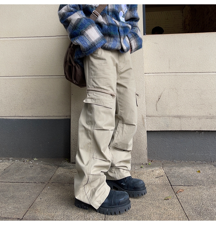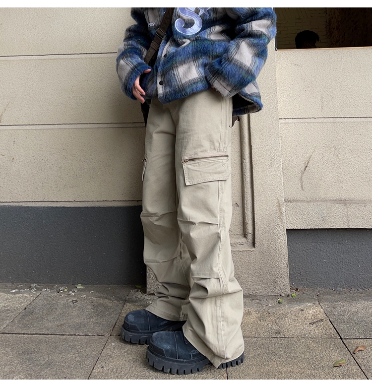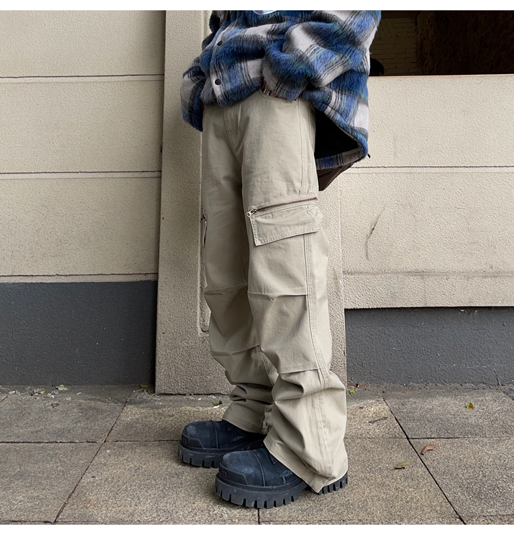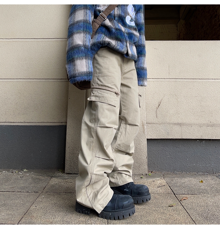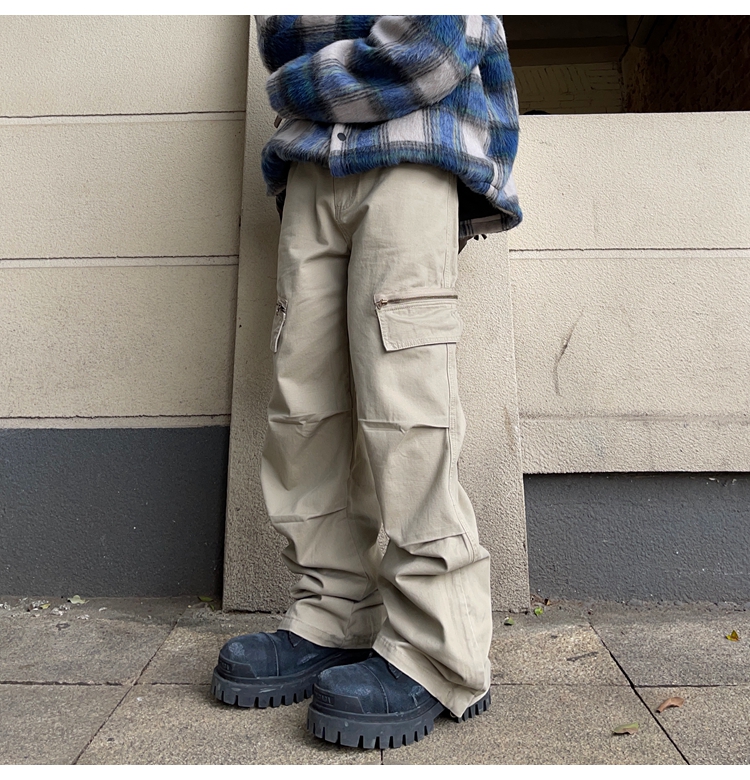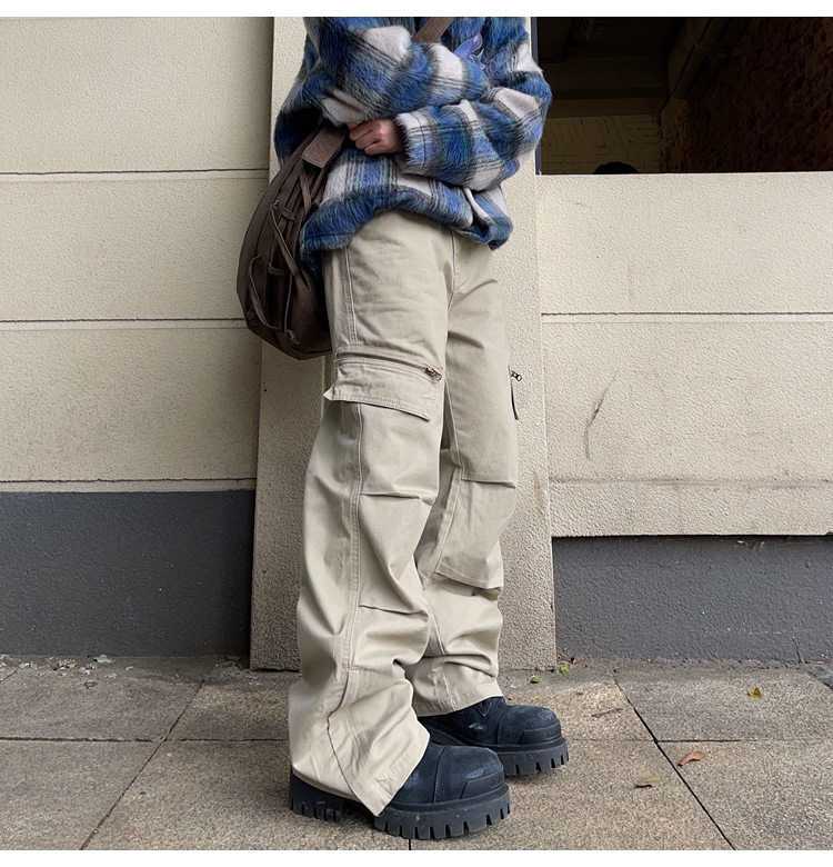 FATEEGG美式復古拉鍊多口袋工裝褲男卡其色高街寬鬆直筒休閒長褲