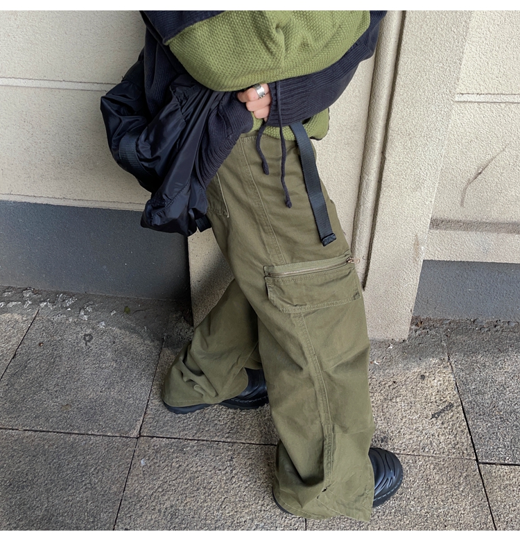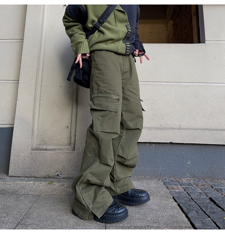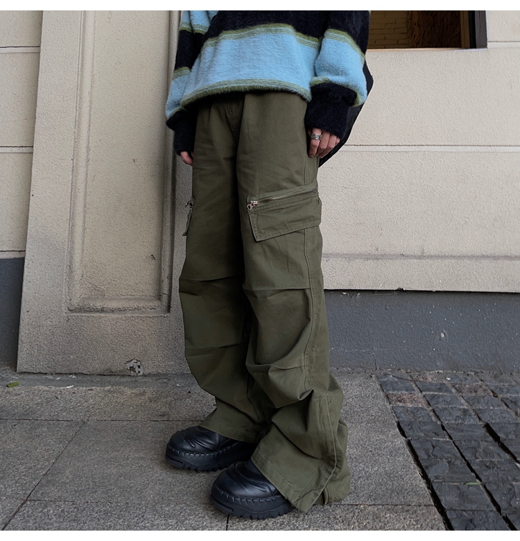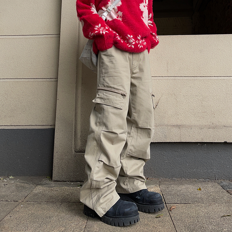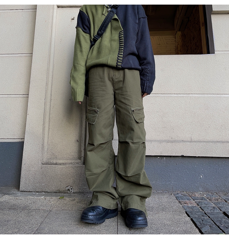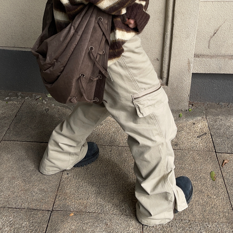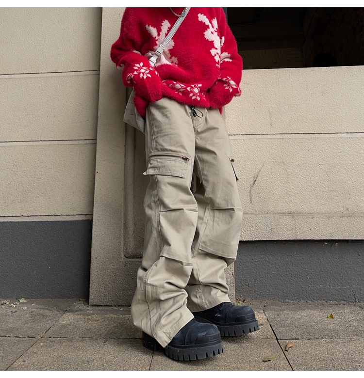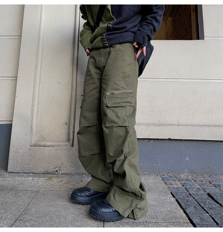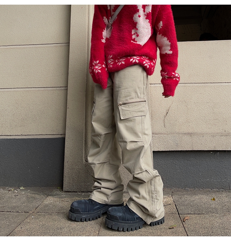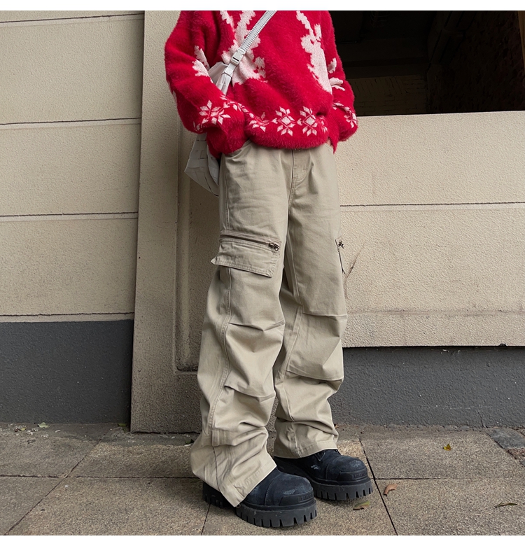 FATEEGG美式復古拉鍊多口袋工裝褲男卡其色高街寬鬆直筒休閒長褲