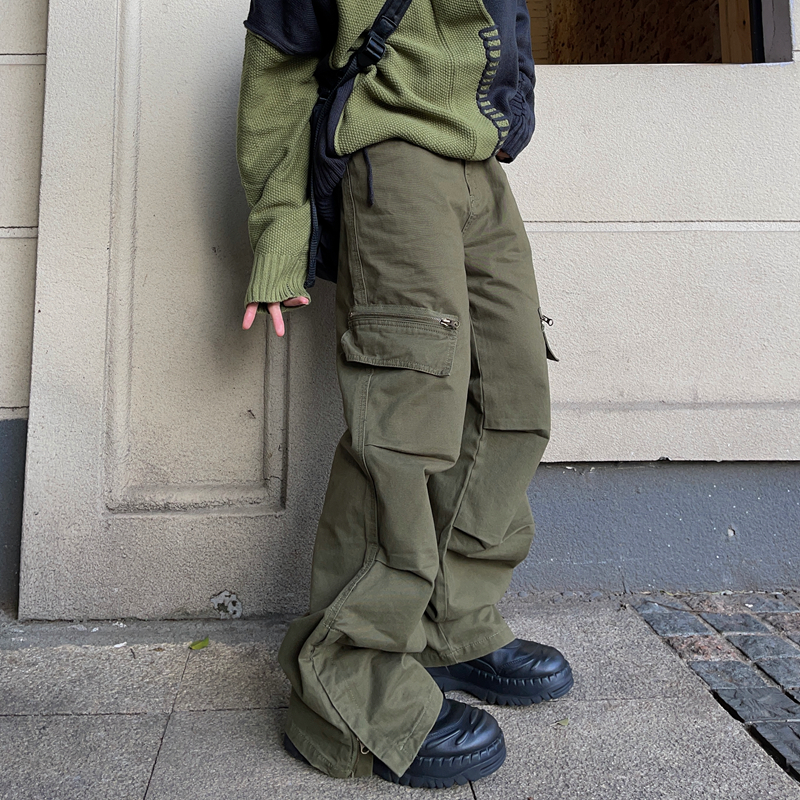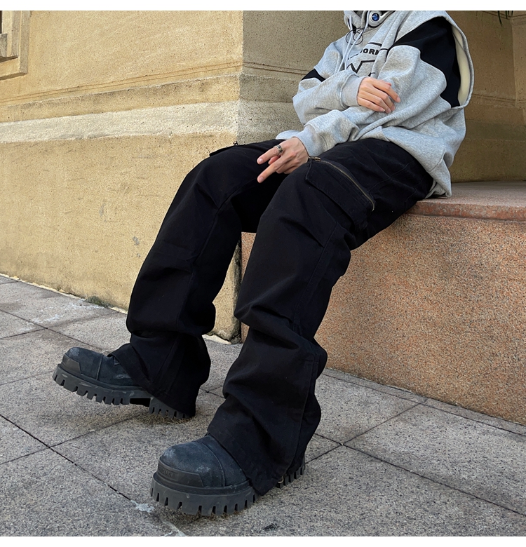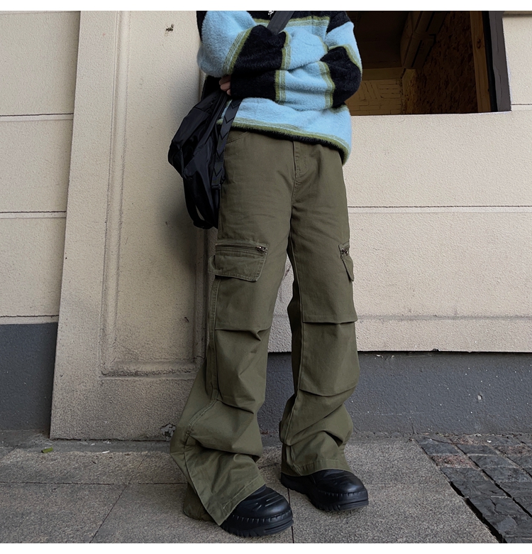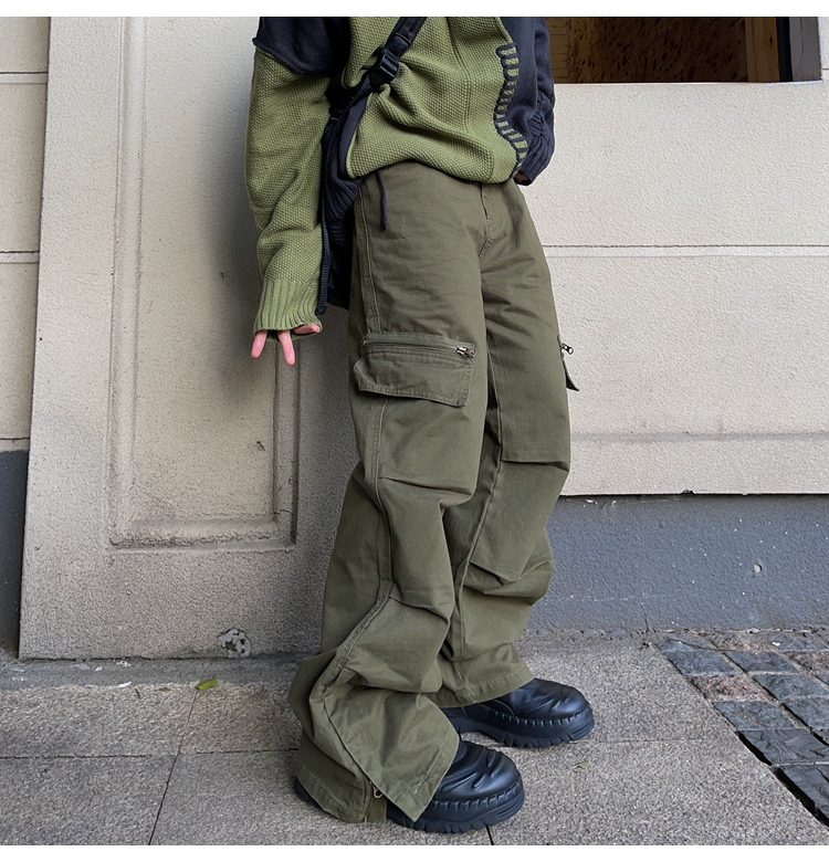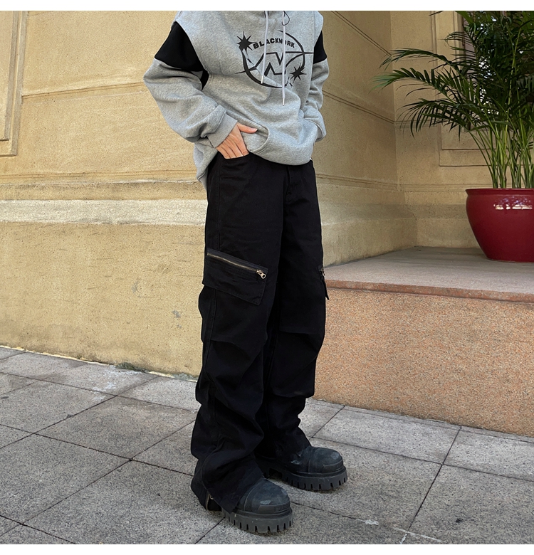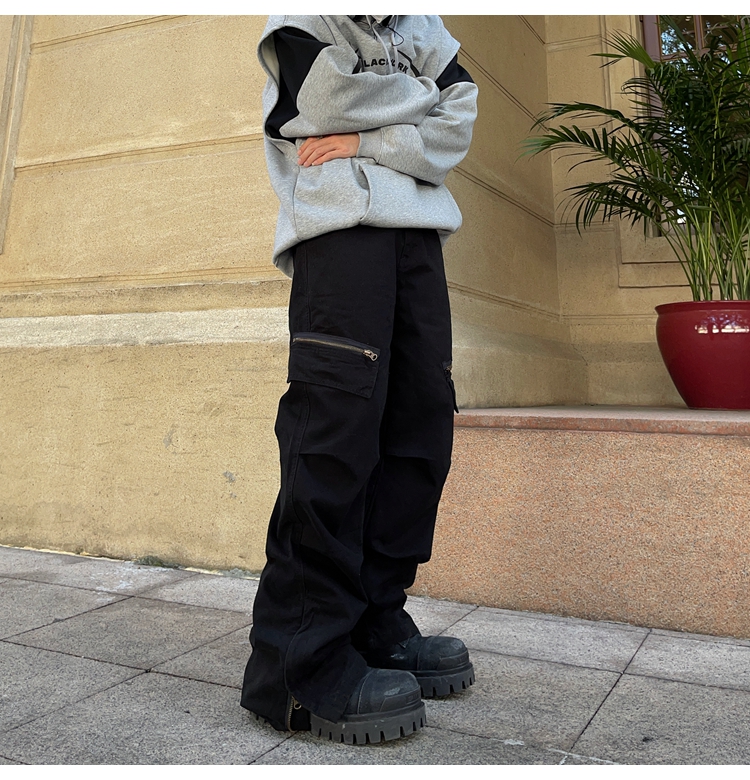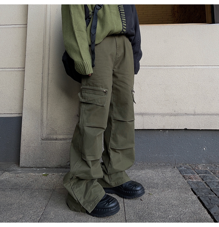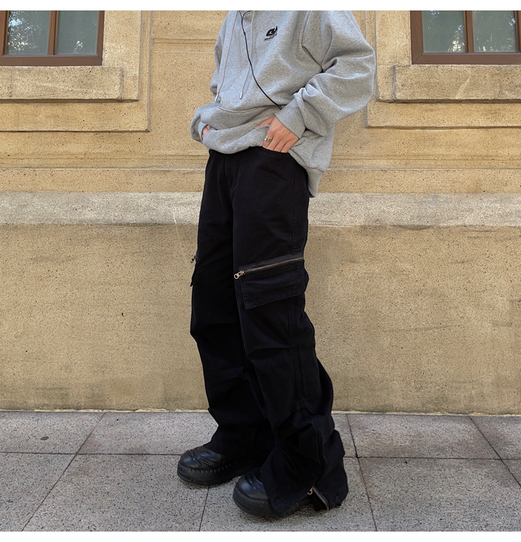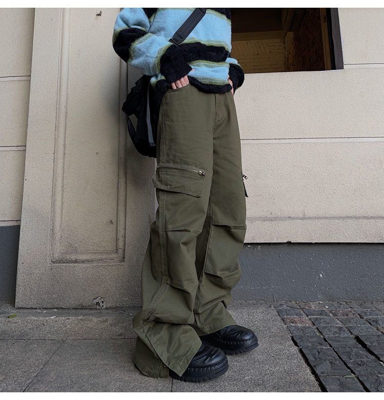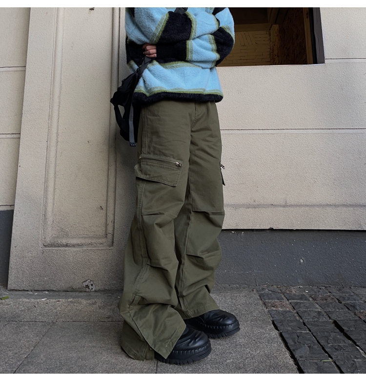 FATEEGG美式復古拉鍊多口袋工裝褲男卡其色高街寬鬆直筒休閒長褲