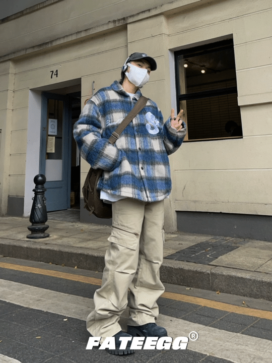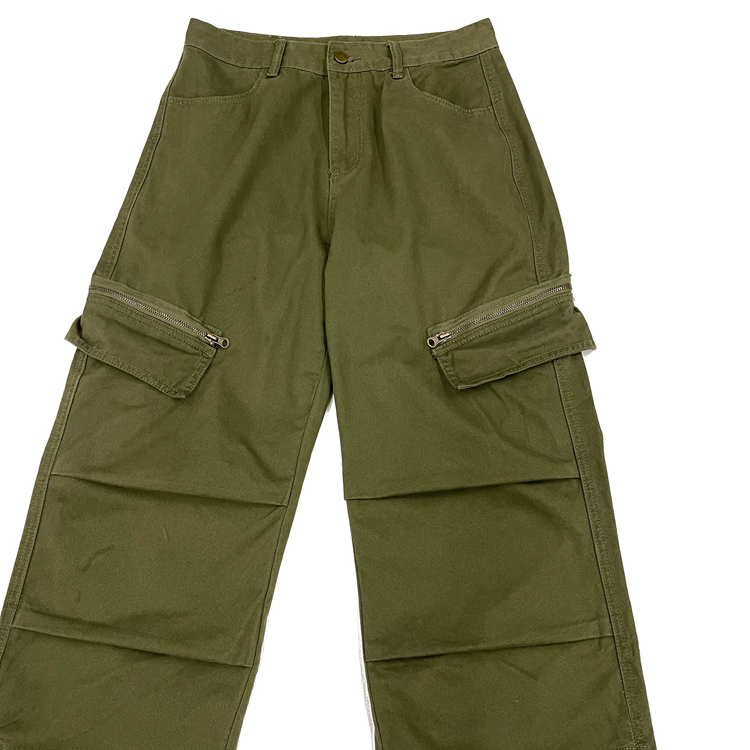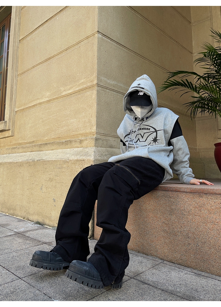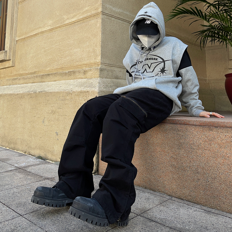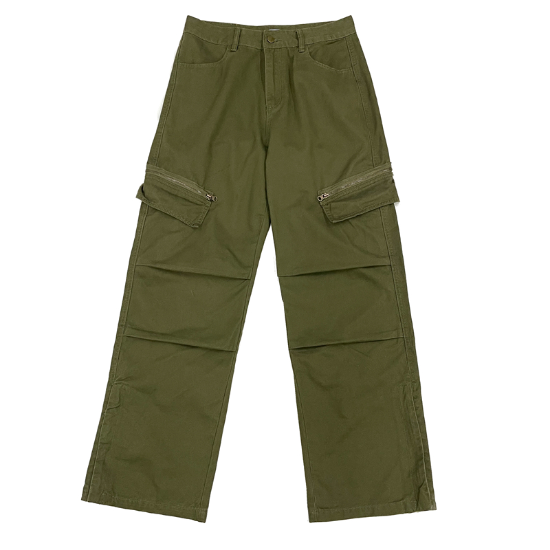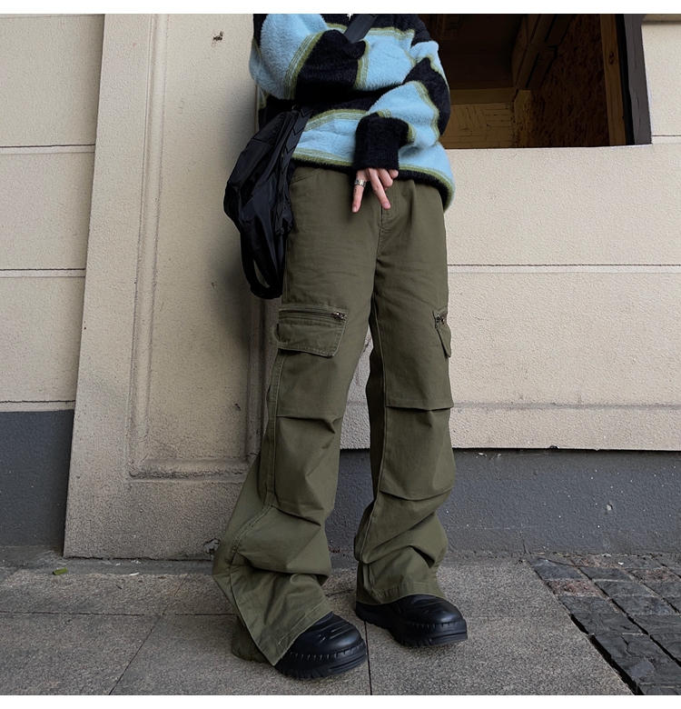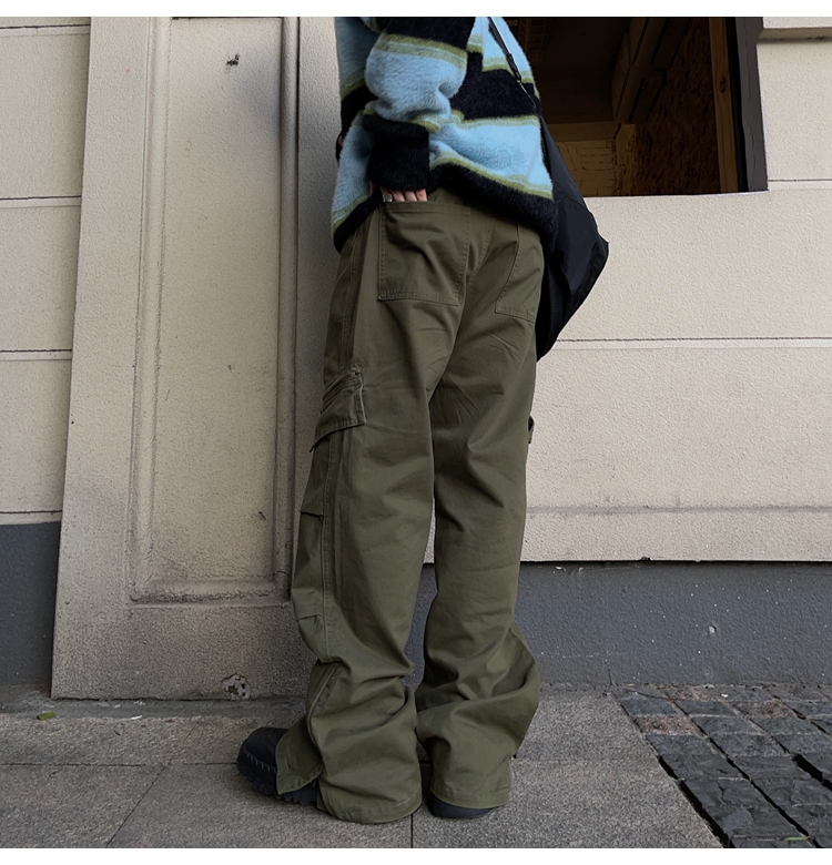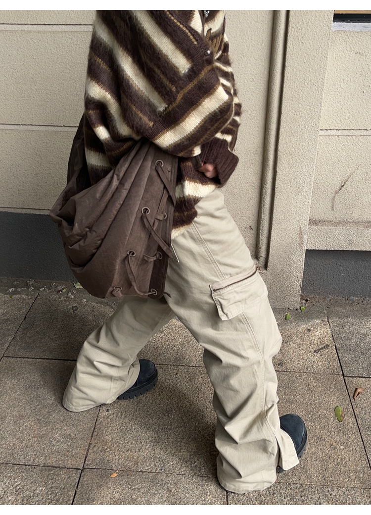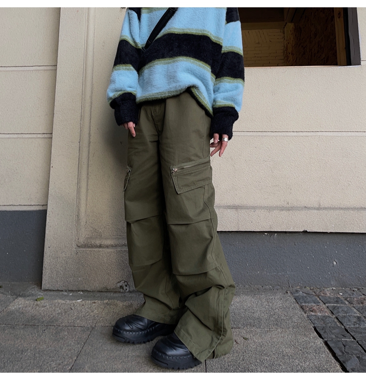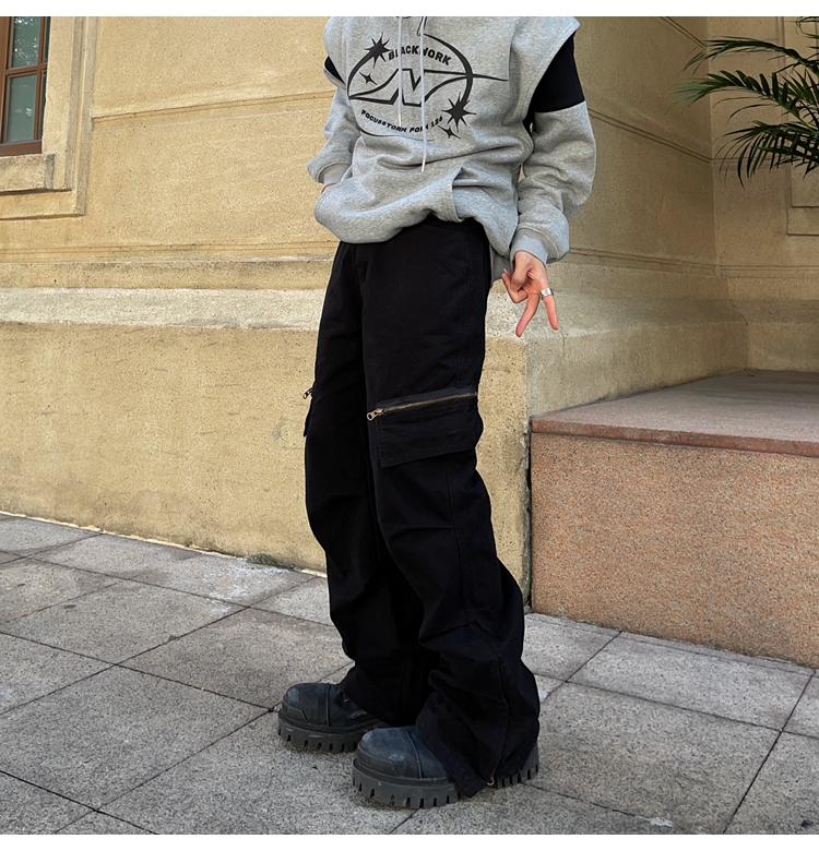 FATEEGG美式復古拉鍊多口袋工裝褲男卡其色高街寬鬆直筒休閒長褲