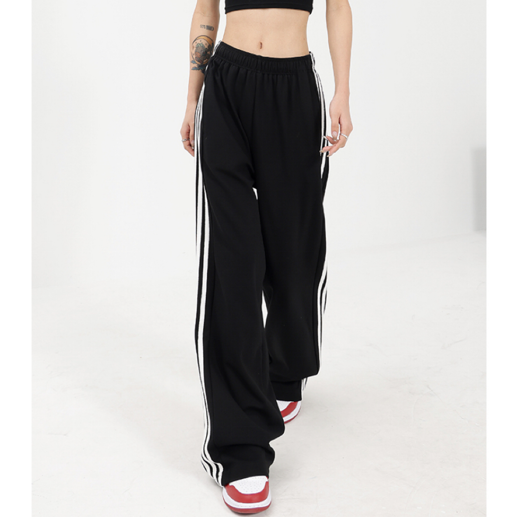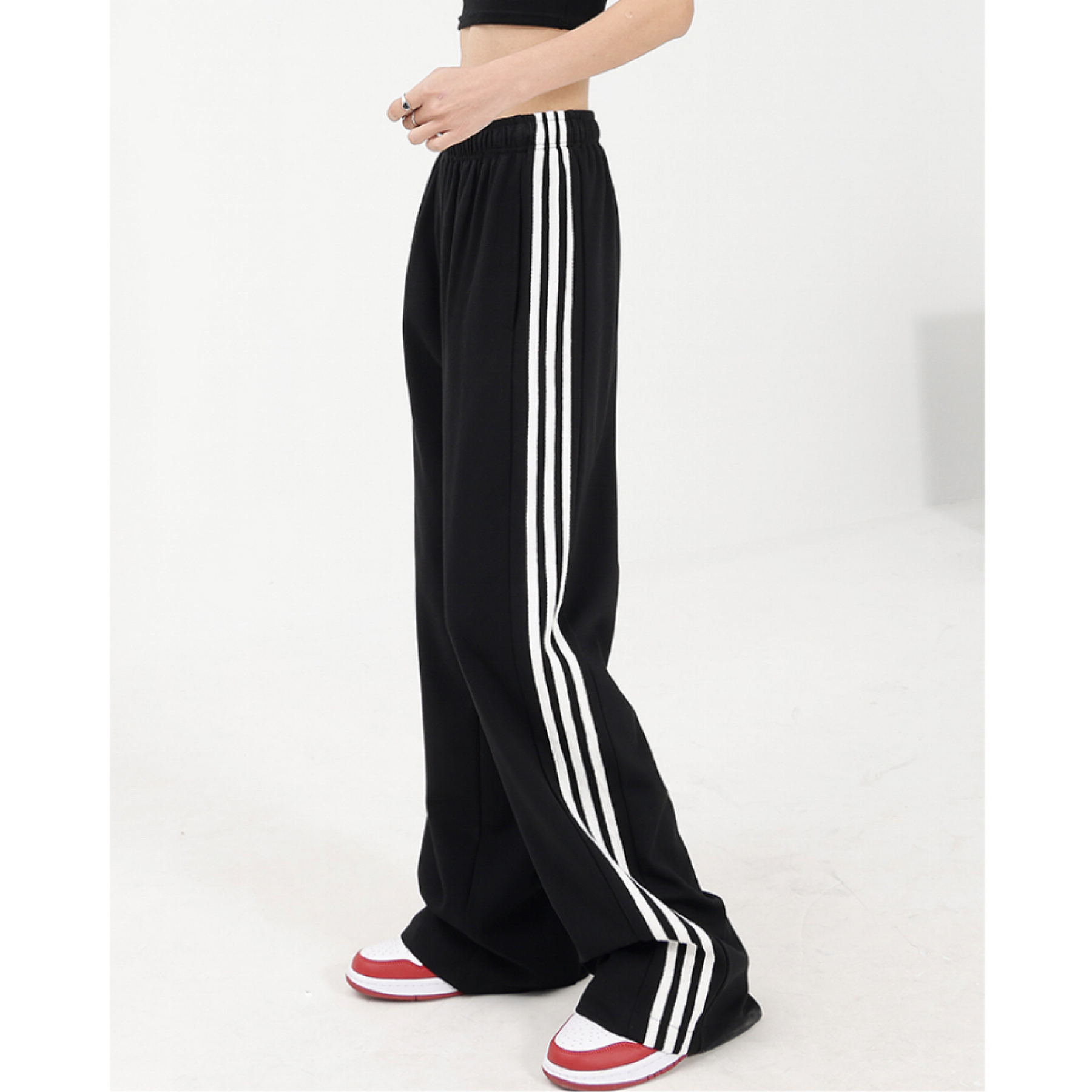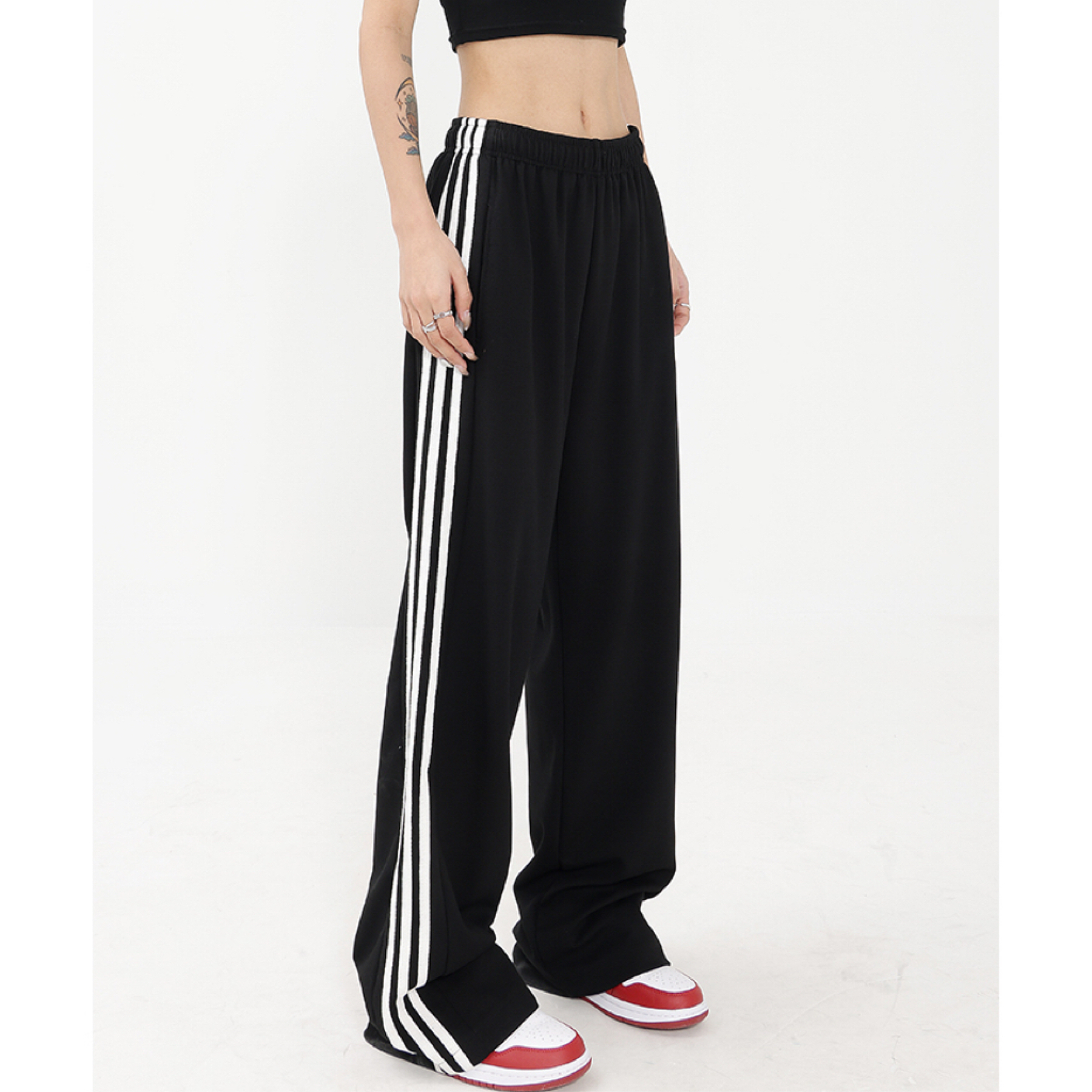 美式黑色直筒運動褲女早秋新款衛褲百搭條紋長褲闊腿顯瘦休閒褲子