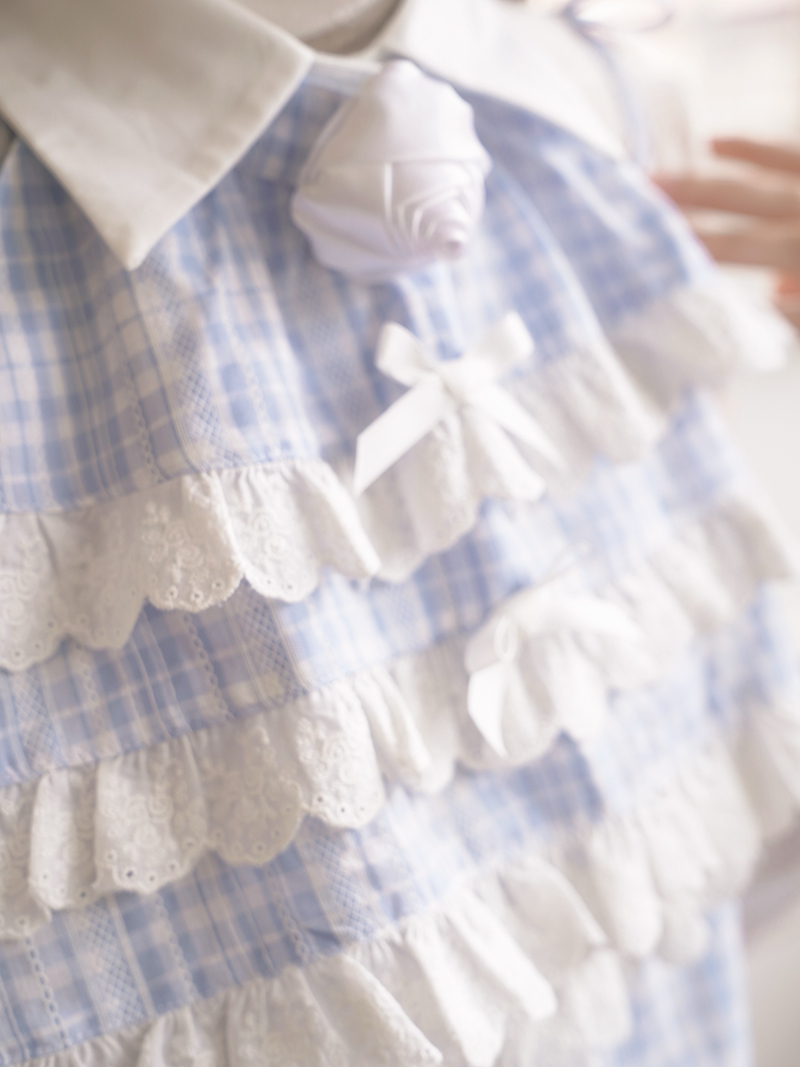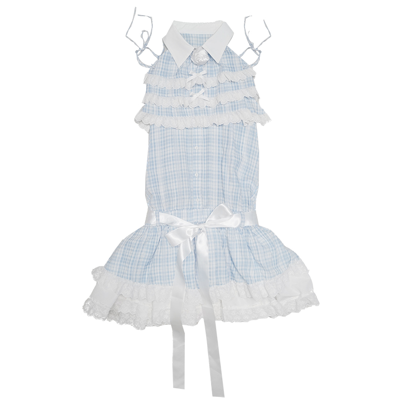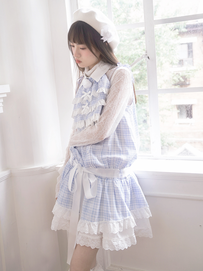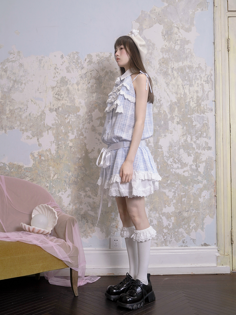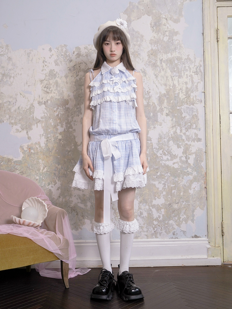 daytoday日常研究所 天使之心藍色格子提花花邊低腰無袖洋裝