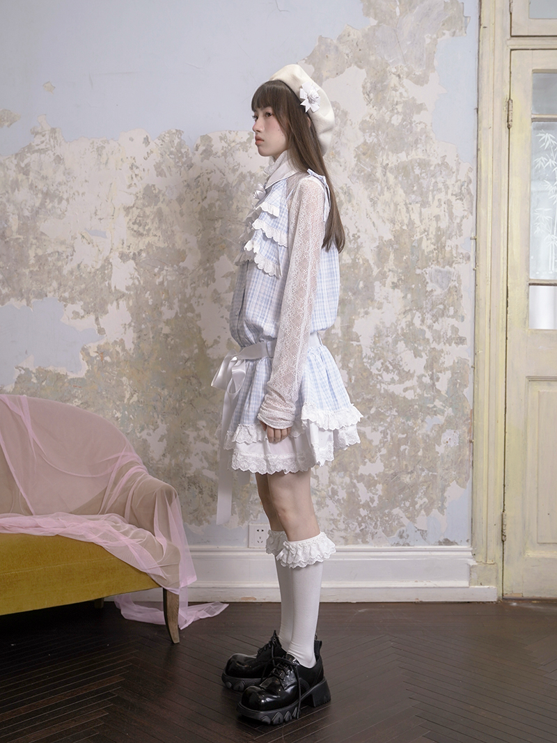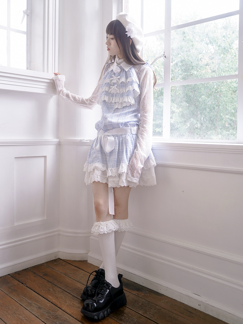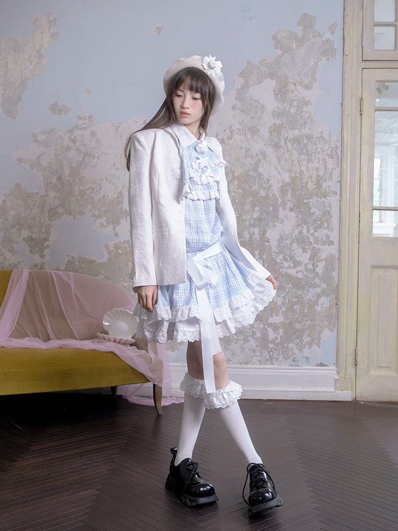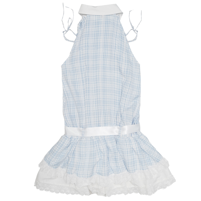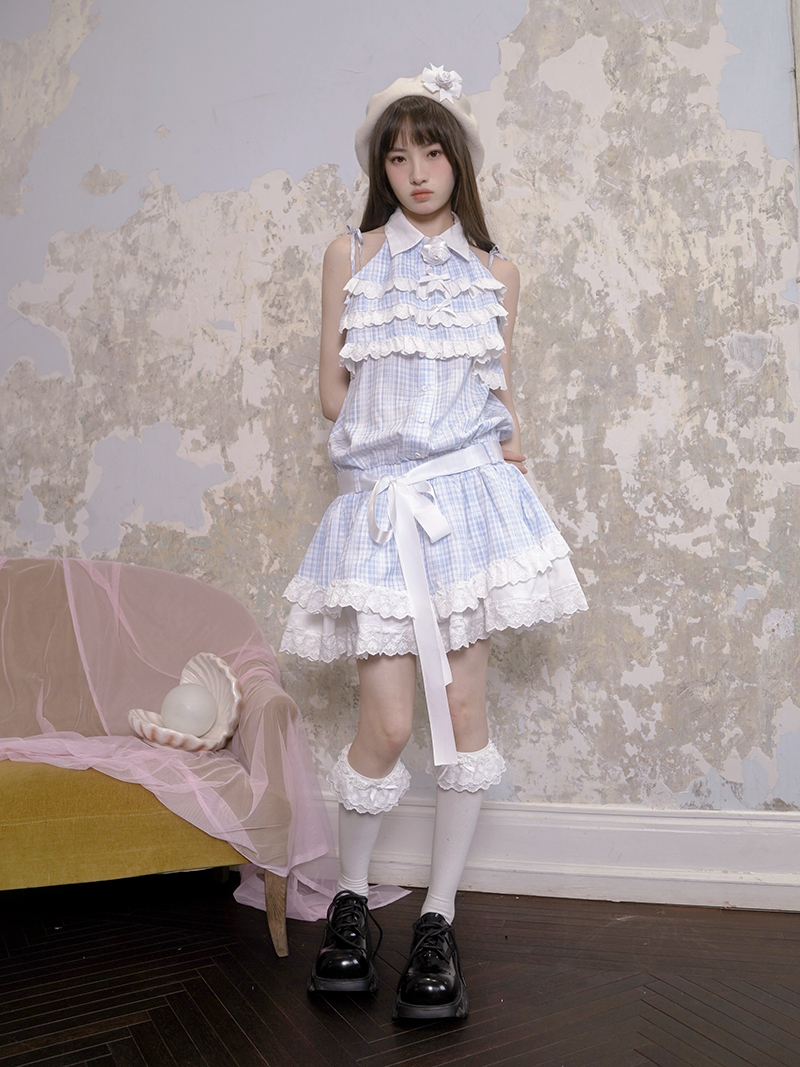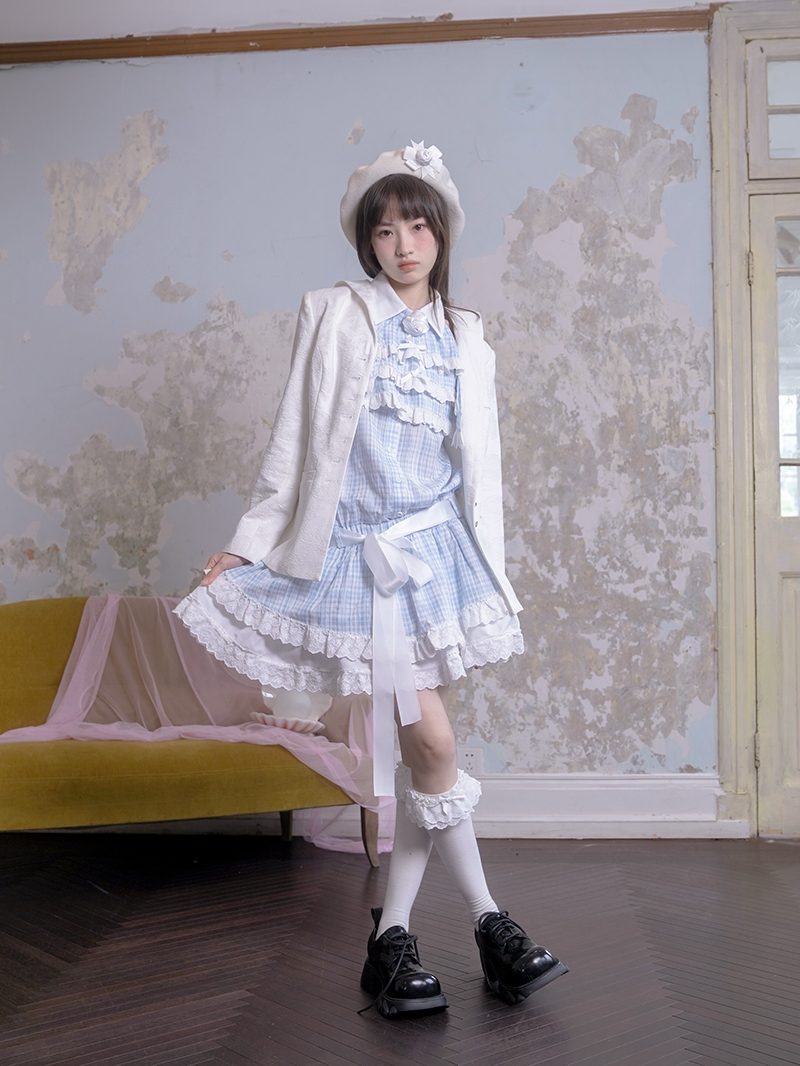 daytoday日常研究所 天使之心藍色格子提花花邊低腰無袖洋裝