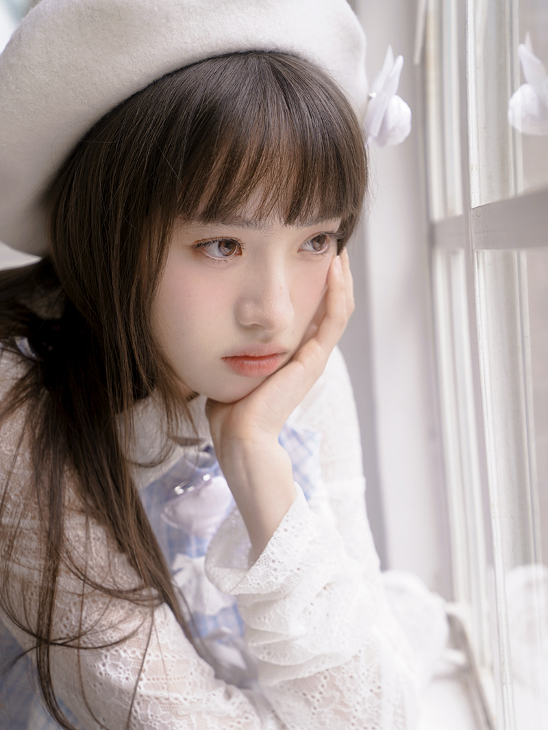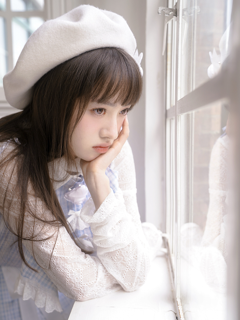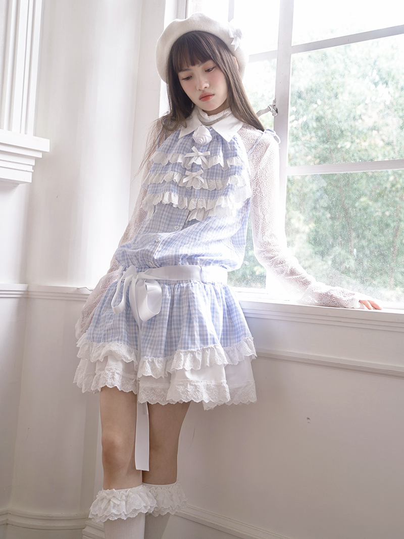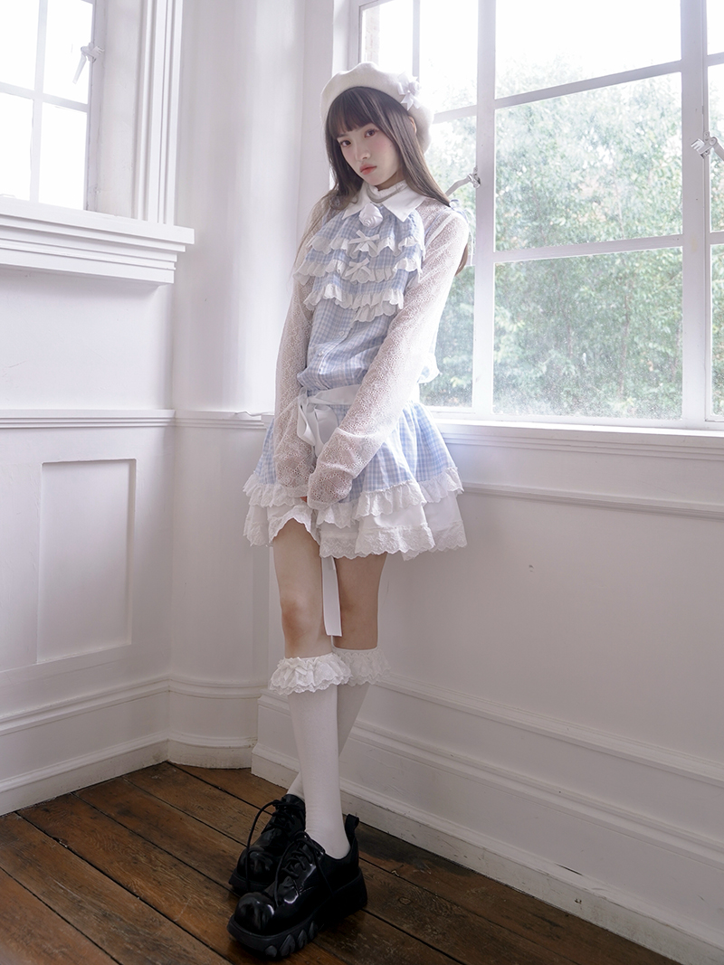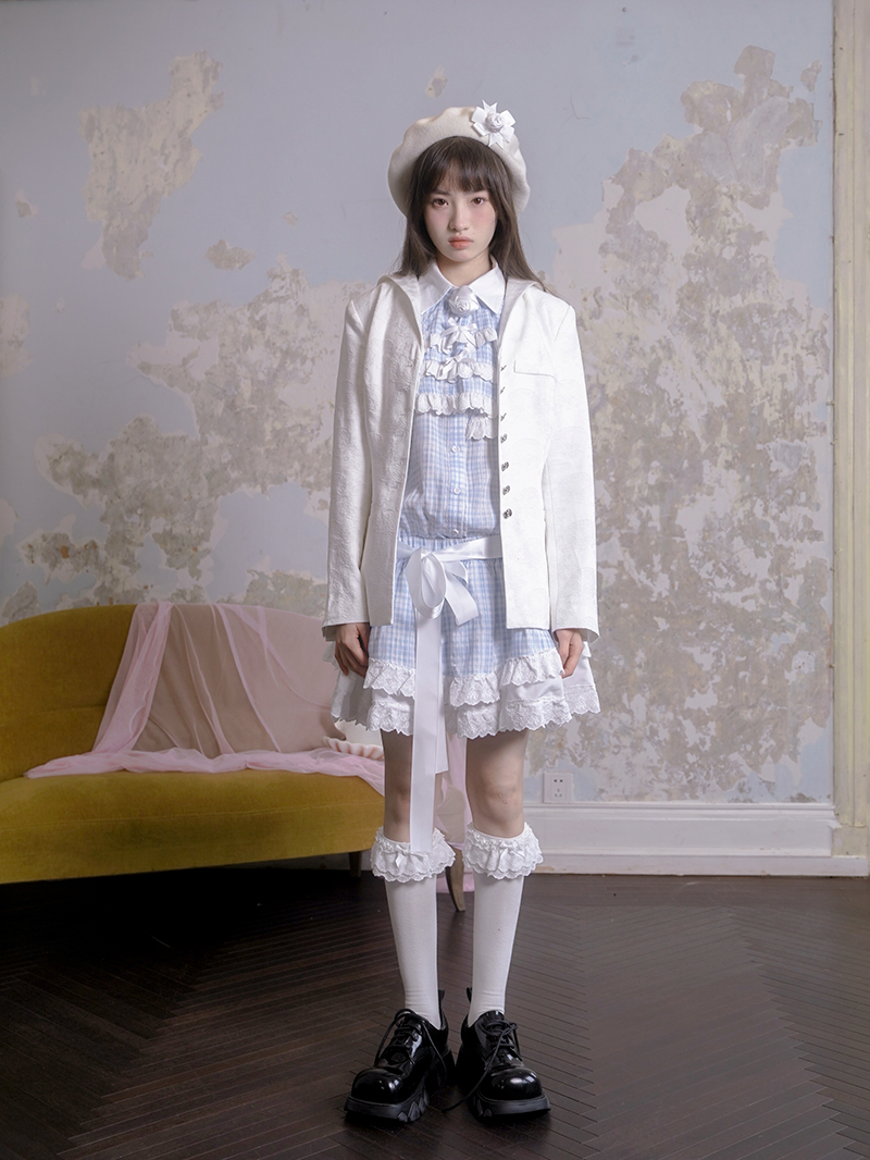daytoday日常研究所 天使之心藍色格子提花花邊低腰無袖洋裝