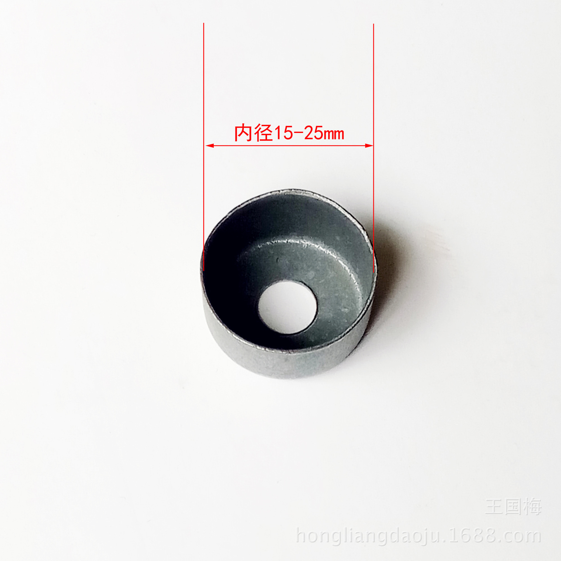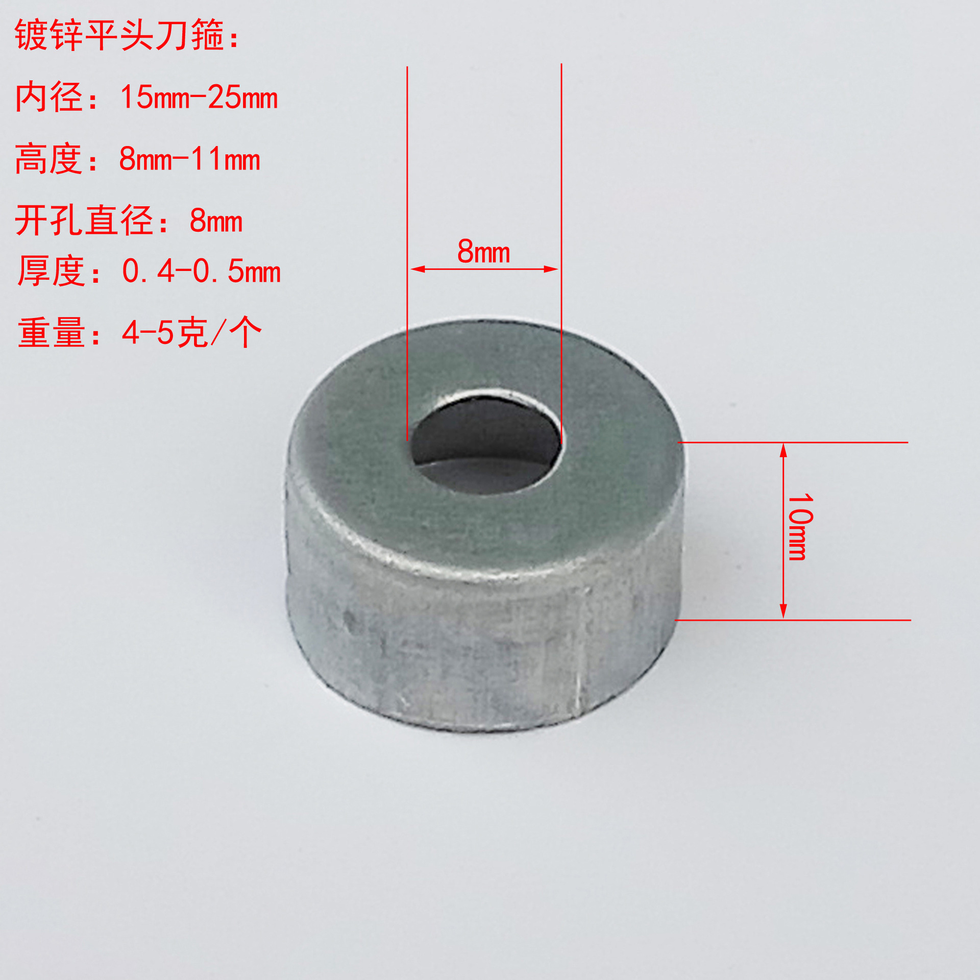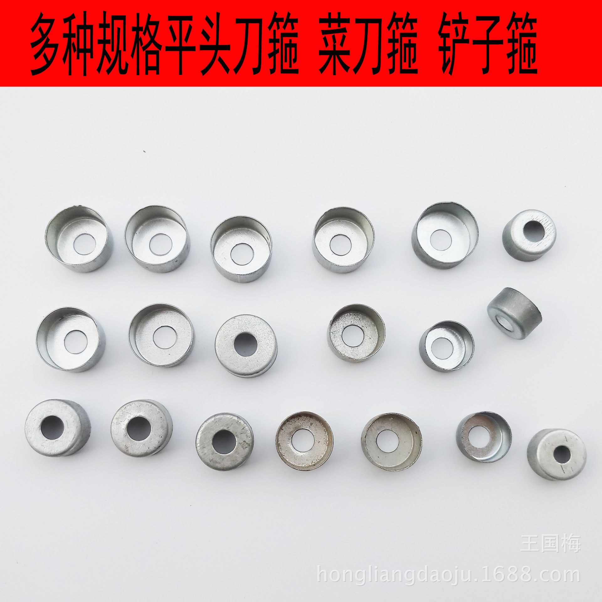 刀箍为薄铁皮经冲床几道工序的冲压,再表面镀锌,长久使用不生锈!内径尺寸有:15mm,16mm,17mm,18mm,19mm,20mm,21mm,22mm,23mm24mm 25mm 客户根据自己木柄的大小自由选择!