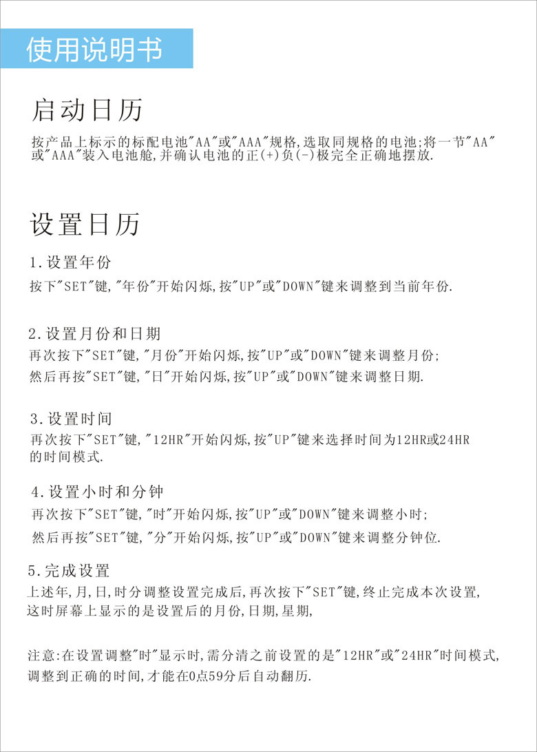 1.按照机芯上电池位置提示装入一节5号电池(请注意正(+)、负(-)极准确)。