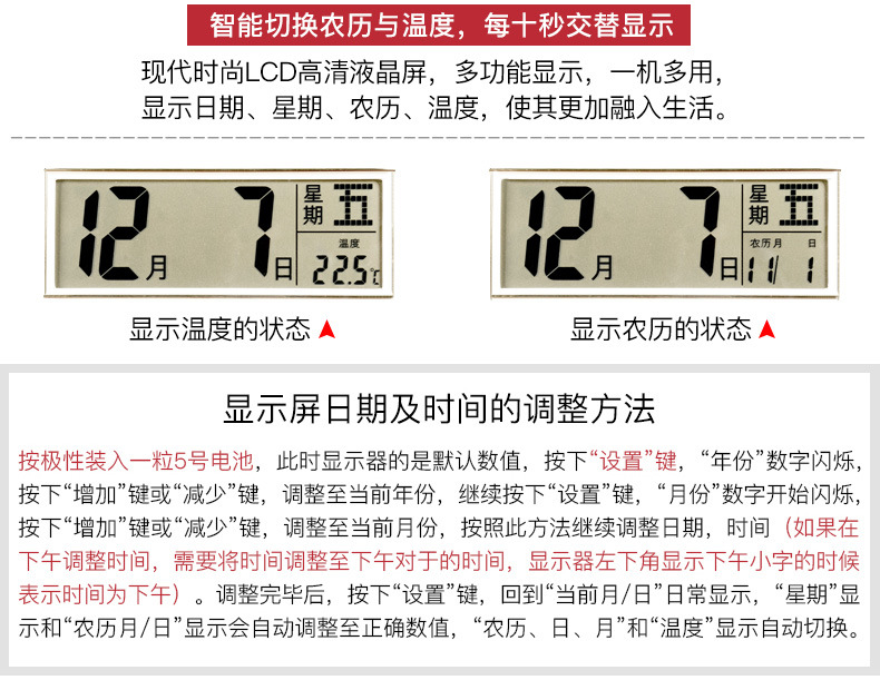 功能:(中文版)月、日、农历、星期、温度交替显示;