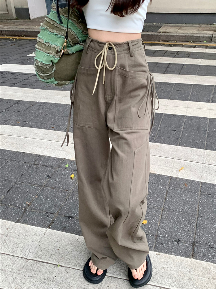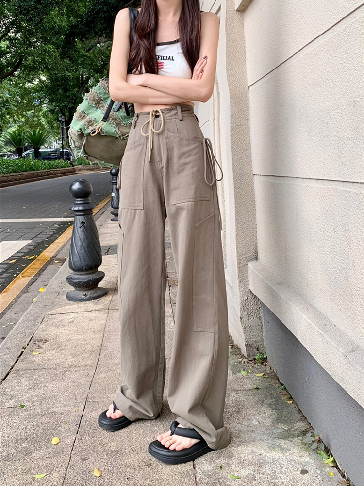 美式復古hiphop工裝褲女夏季高街設計感寬鬆窄版闊腿休閒運動褲子