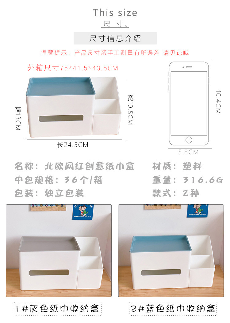 颜色 1#灰色纸巾收纳盒,2#蓝色纸巾收纳盒,1#灰色纸巾盒,2#藏蓝纸巾盒,3#灰色纸巾盒(送贴纸),4#藏蓝纸巾盒(送贴纸),1#粉色纸巾盒,2#蓝色纸巾盒,3#绿色纸巾盒,4#湖蓝小号纸巾盒,5#粉色小号纸巾盒,6#绿色小号纸巾盒