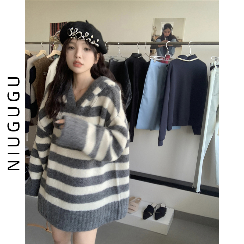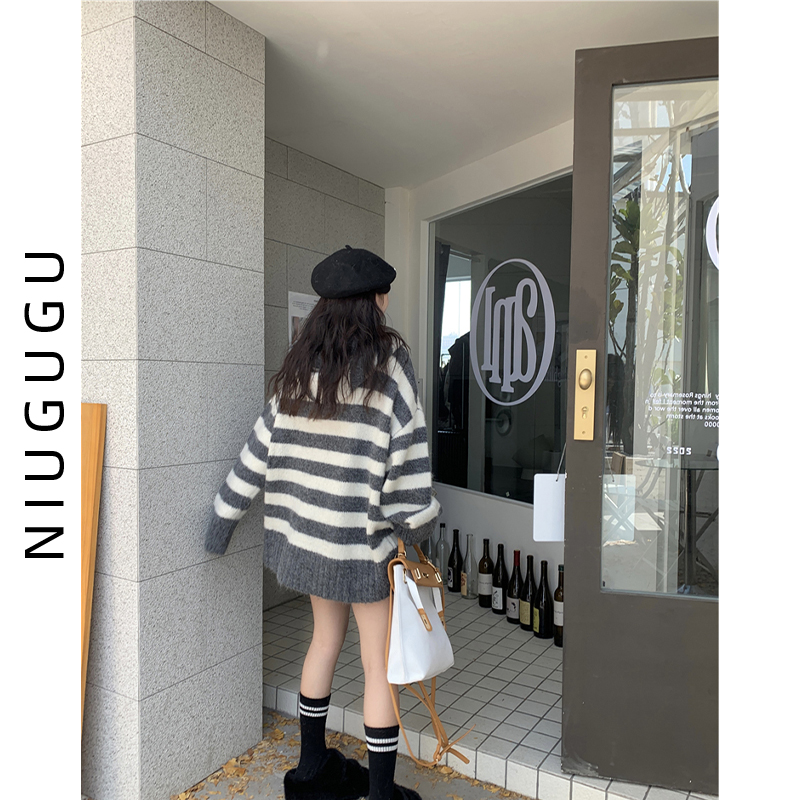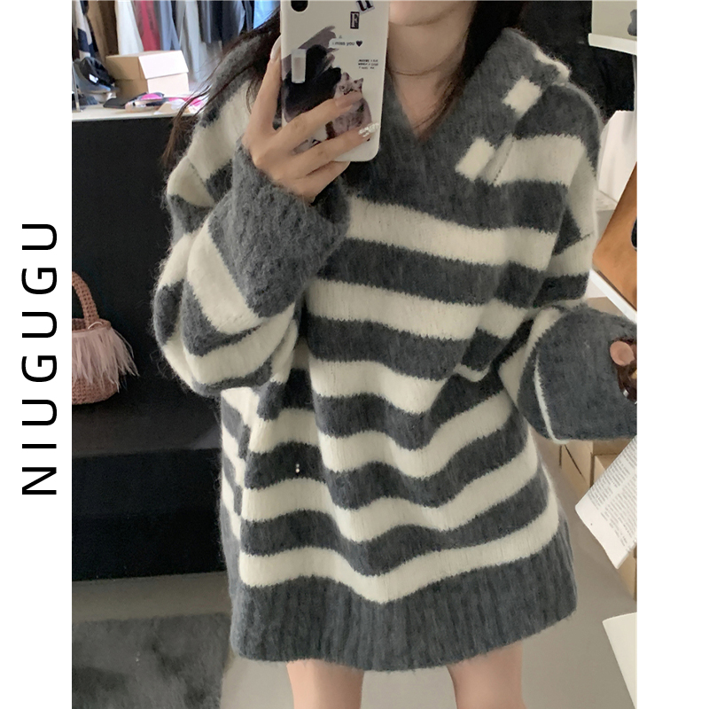 條紋撞色毛衣女春秋冬新款韓版高級感復古寬鬆慵懶風針織連帽運動衫