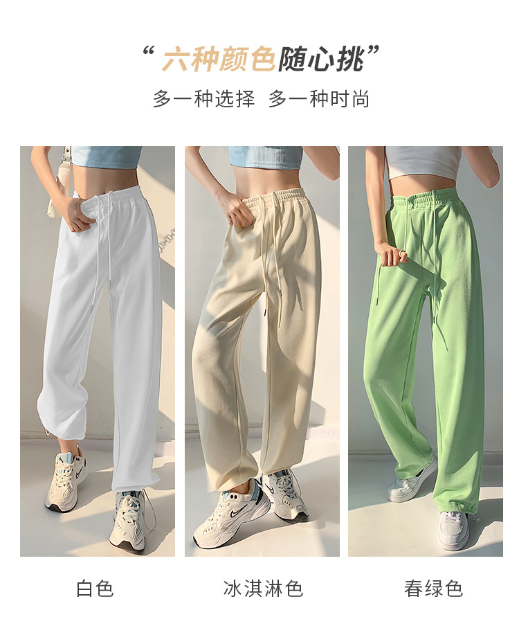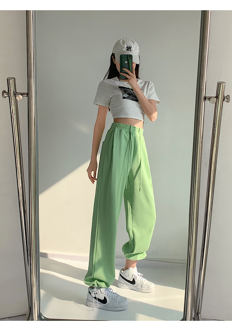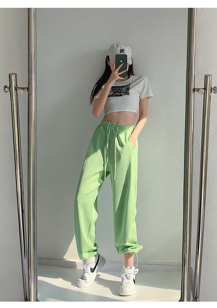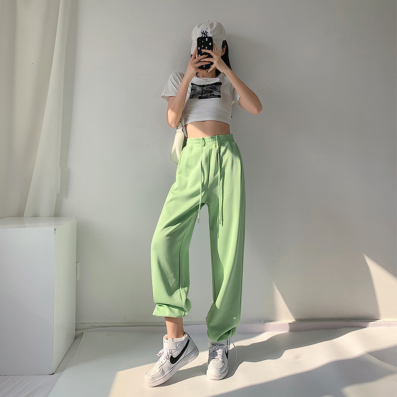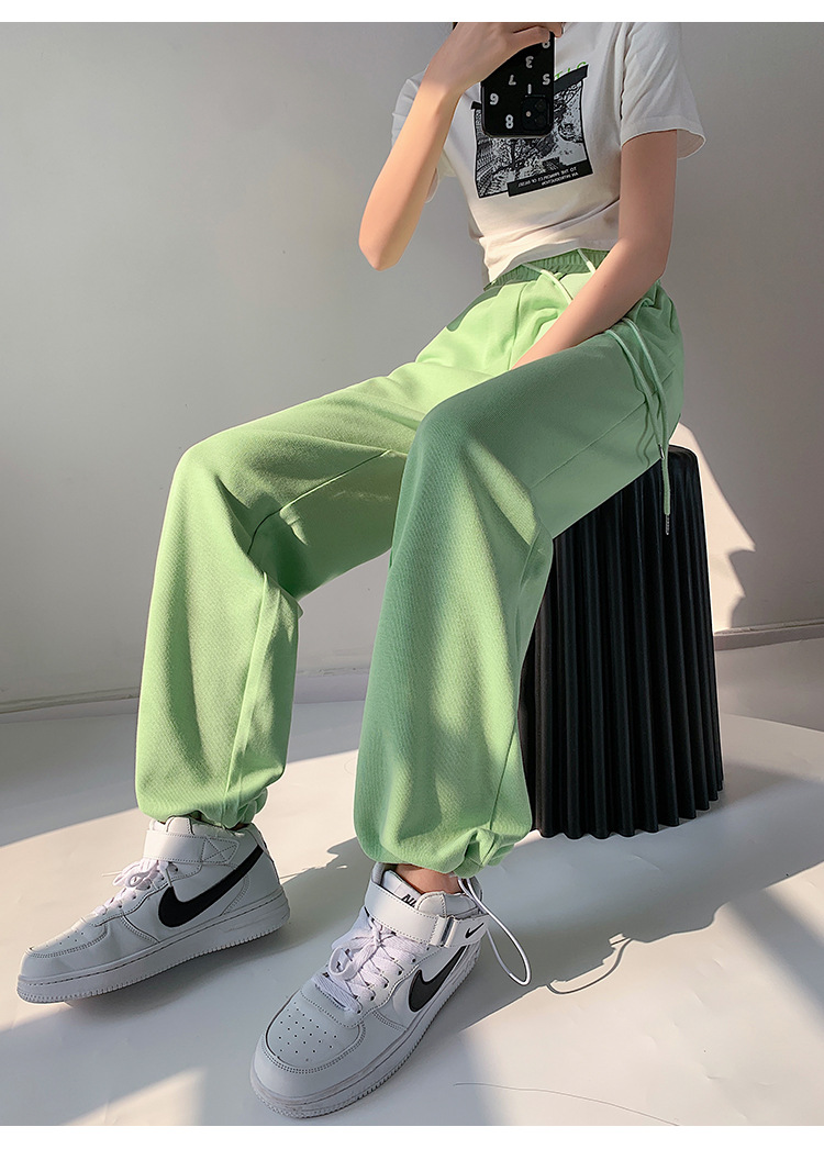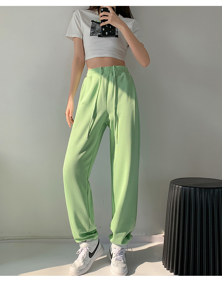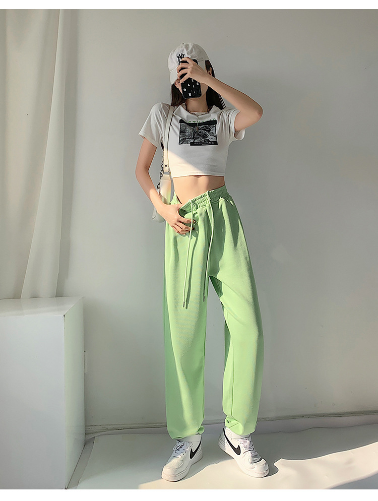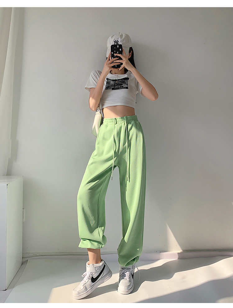 欧美舞蹈运动裤2023年女春夏绿色高腰宽松抽绳束脚裤休闲直筒卫裤
