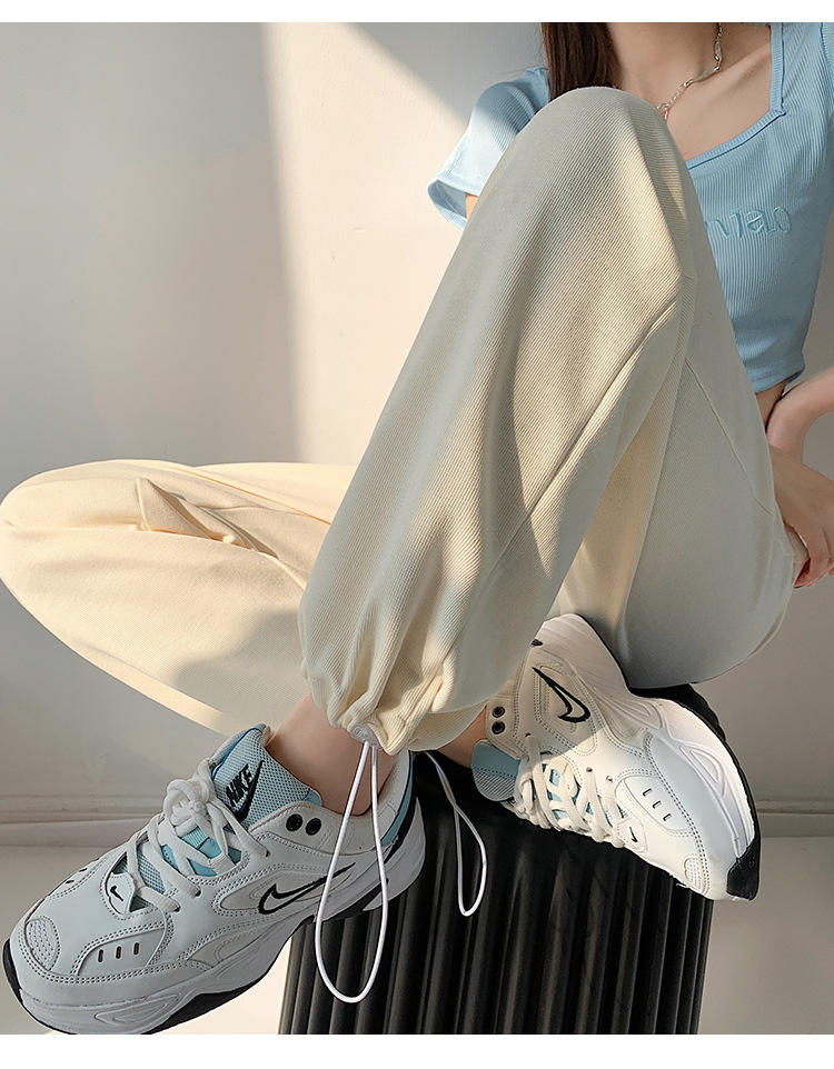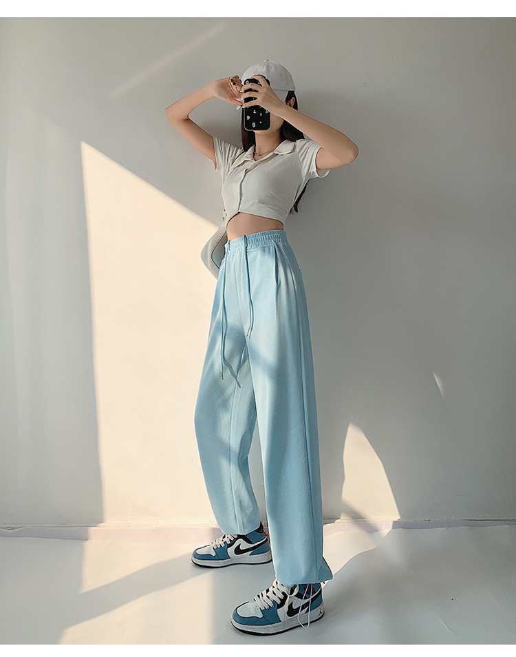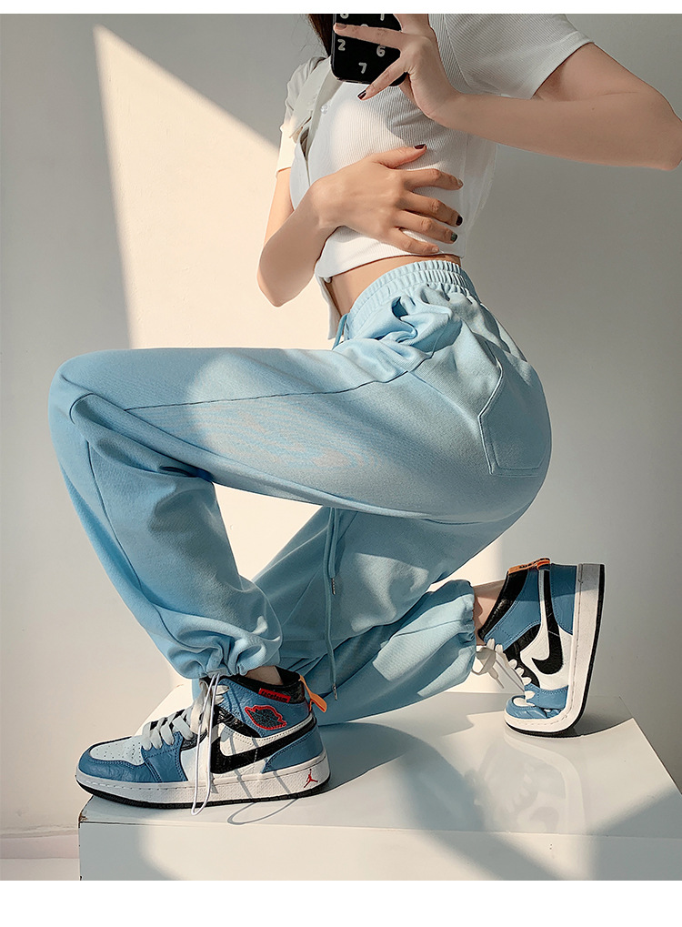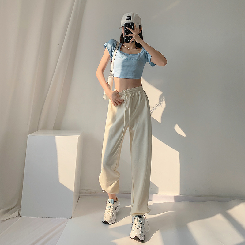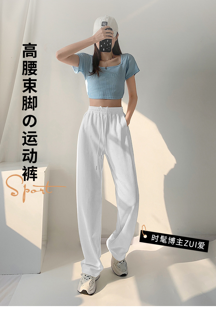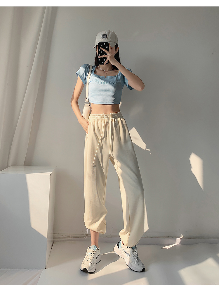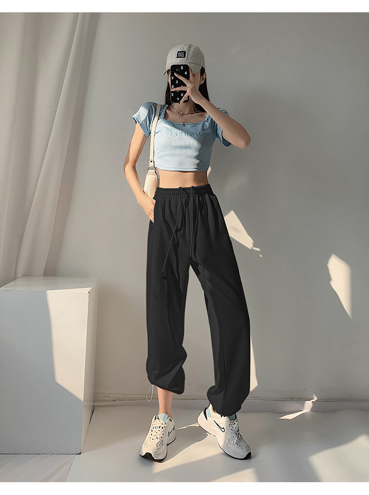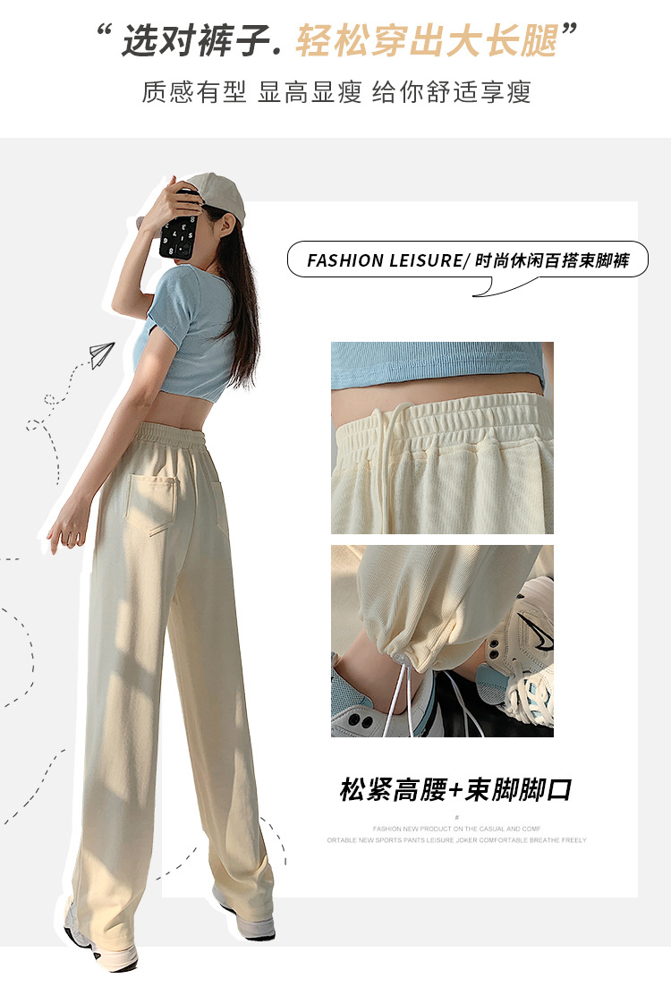 欧美舞蹈运动裤2023年女春夏绿色高腰宽松抽绳束脚裤休闲直筒卫裤