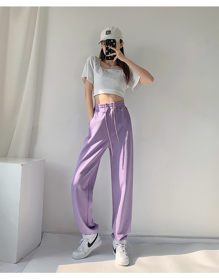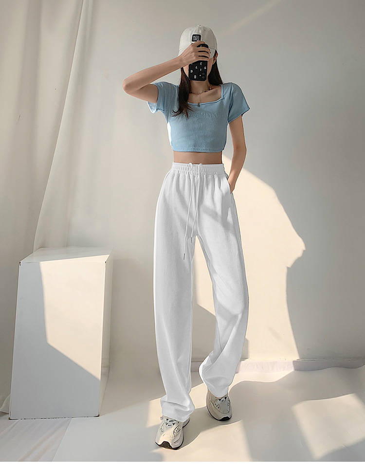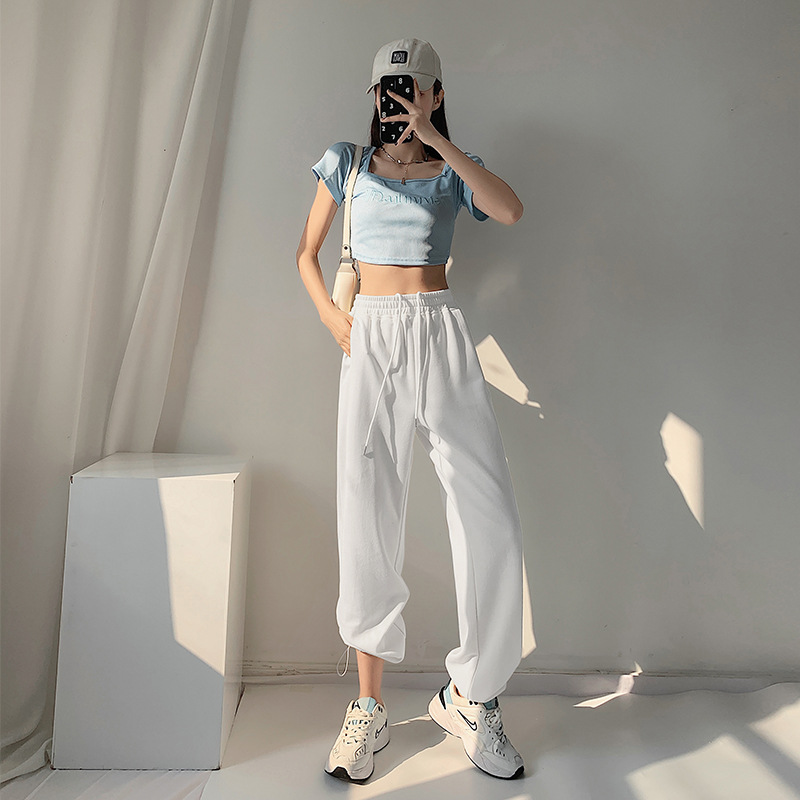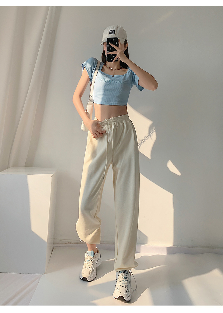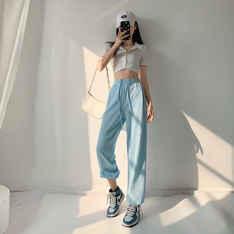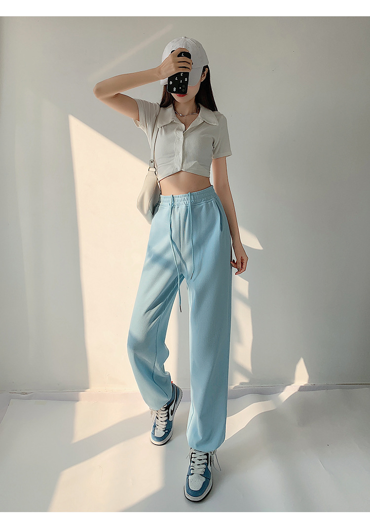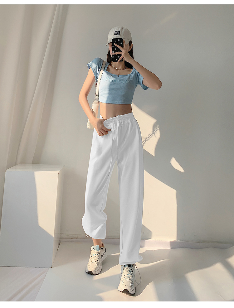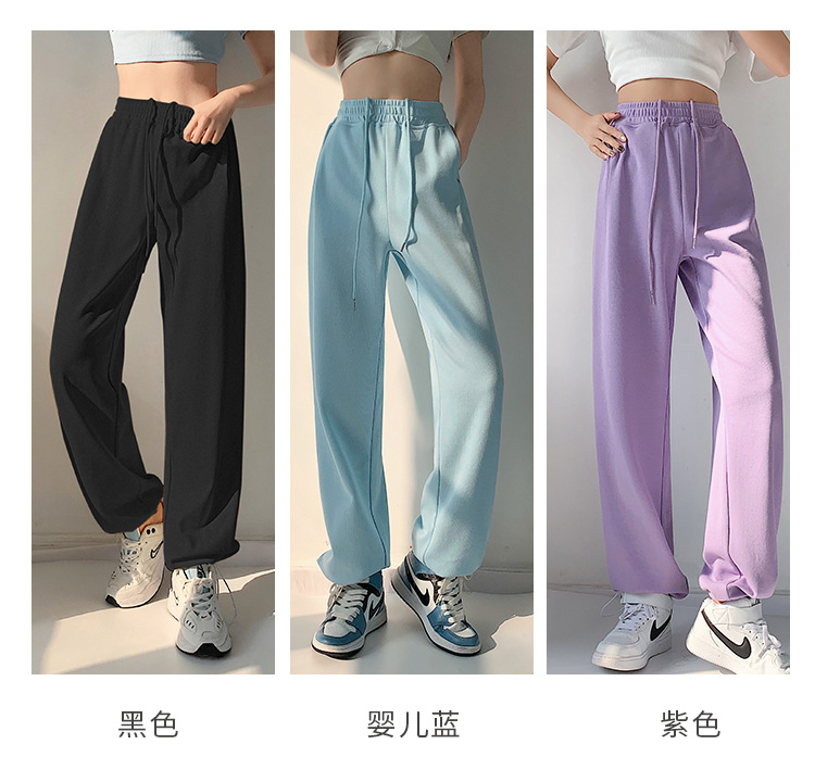 欧美舞蹈运动裤2023年女春夏绿色高腰宽松抽绳束脚裤休闲直筒卫裤