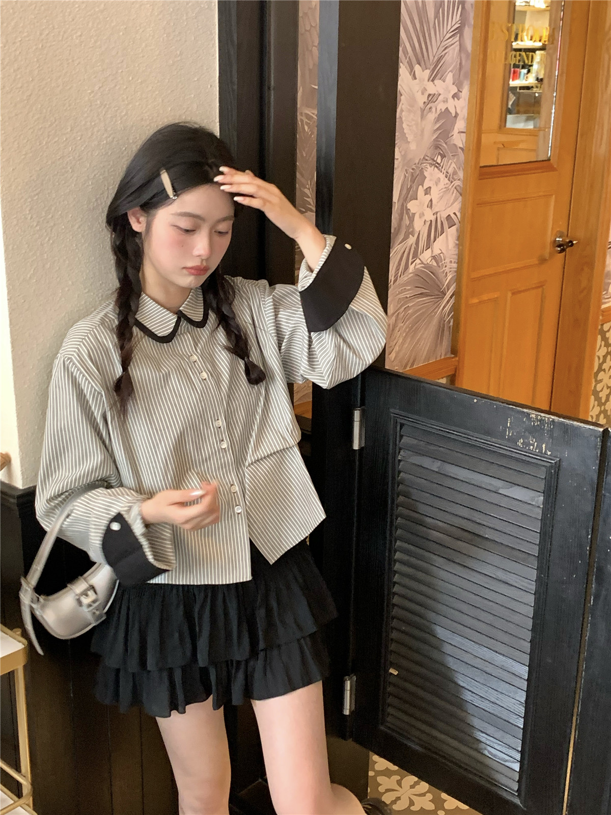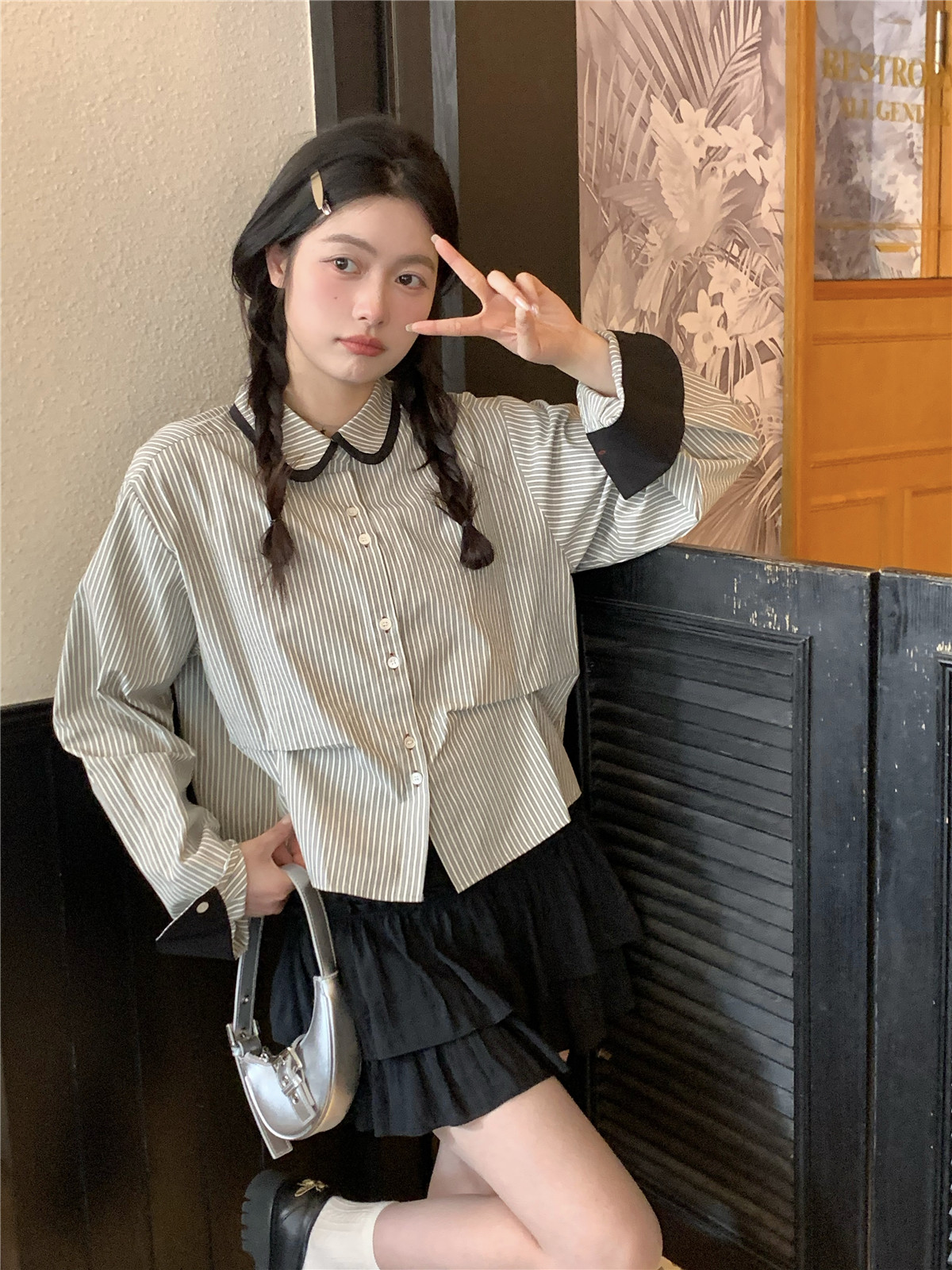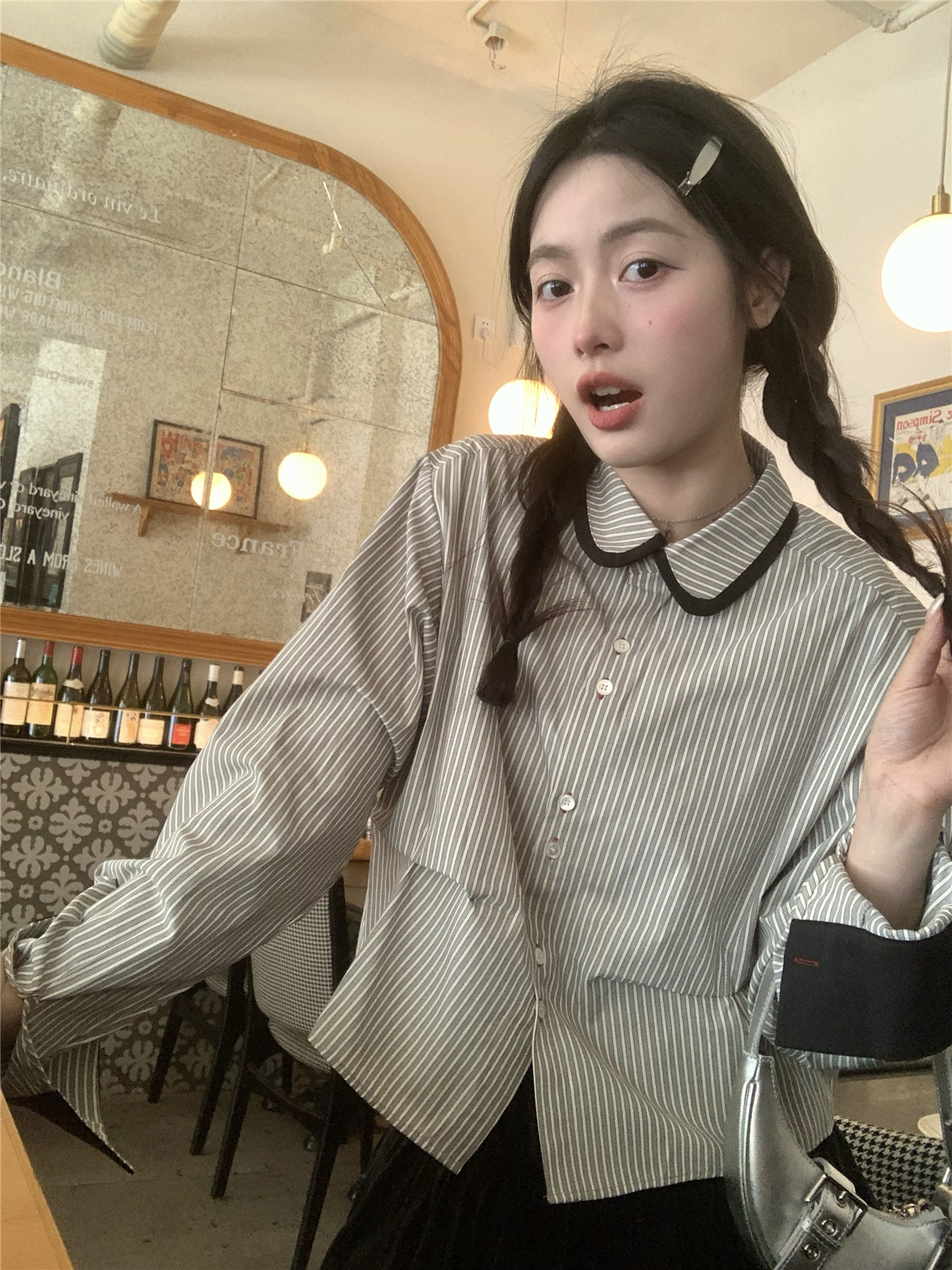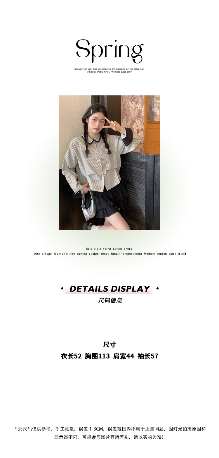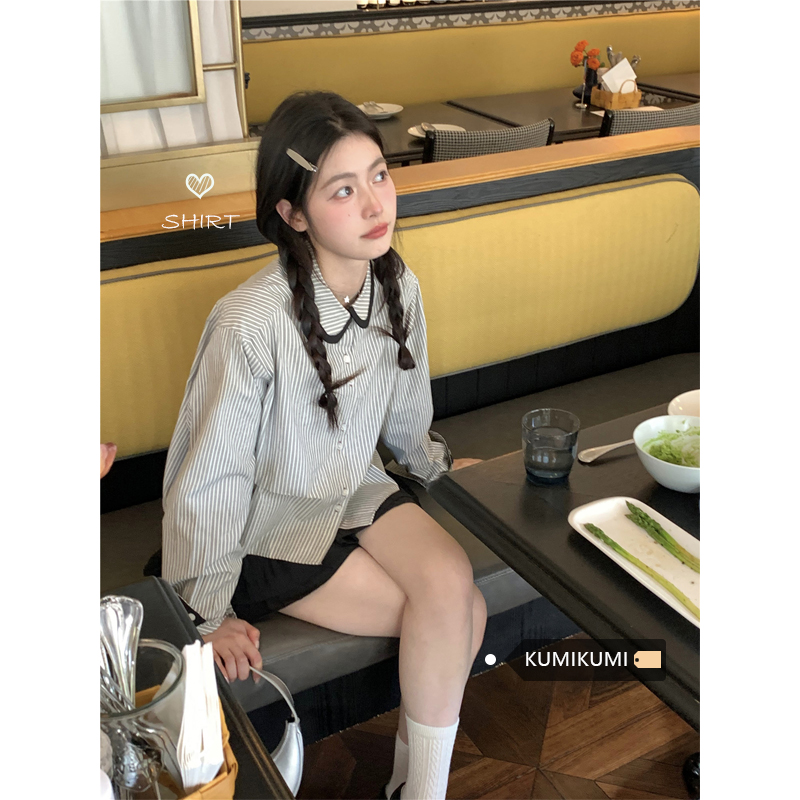 復古小個子小眾娃娃領條紋長袖襯衫女裝秋季寬鬆顯瘦襯衫短款上衣
