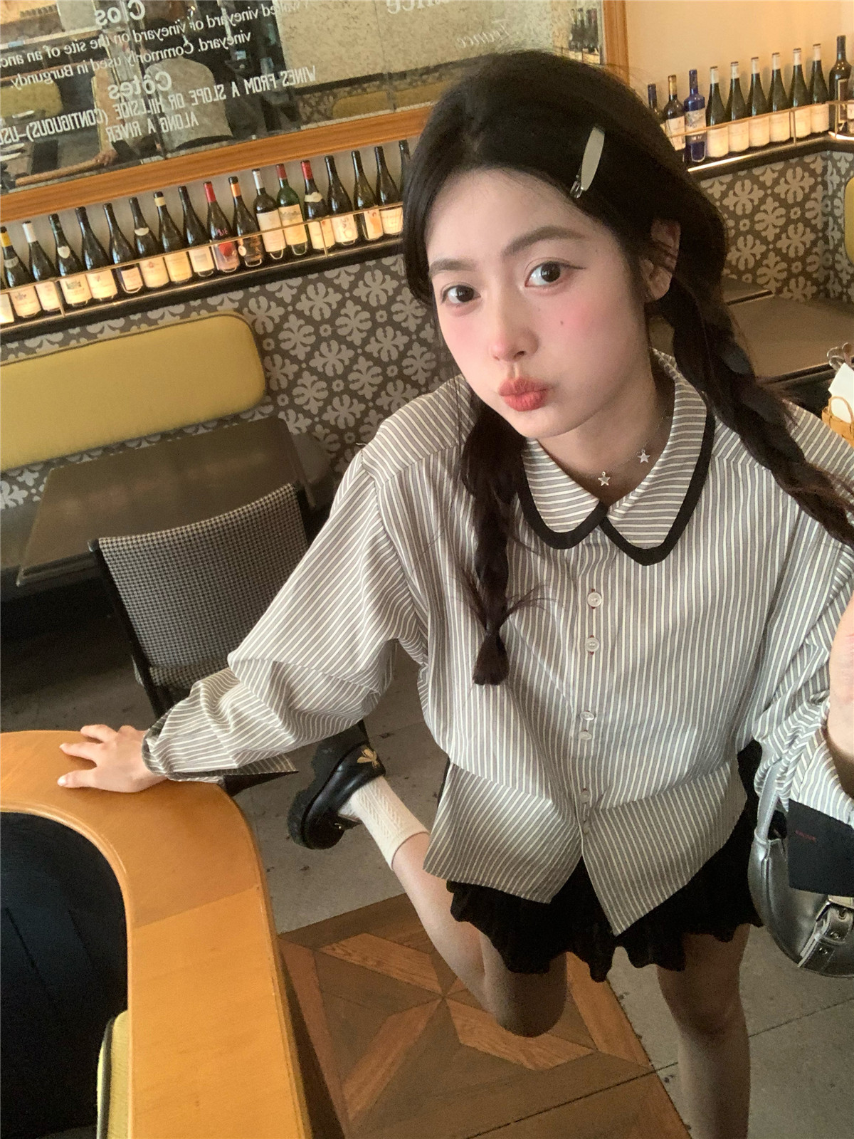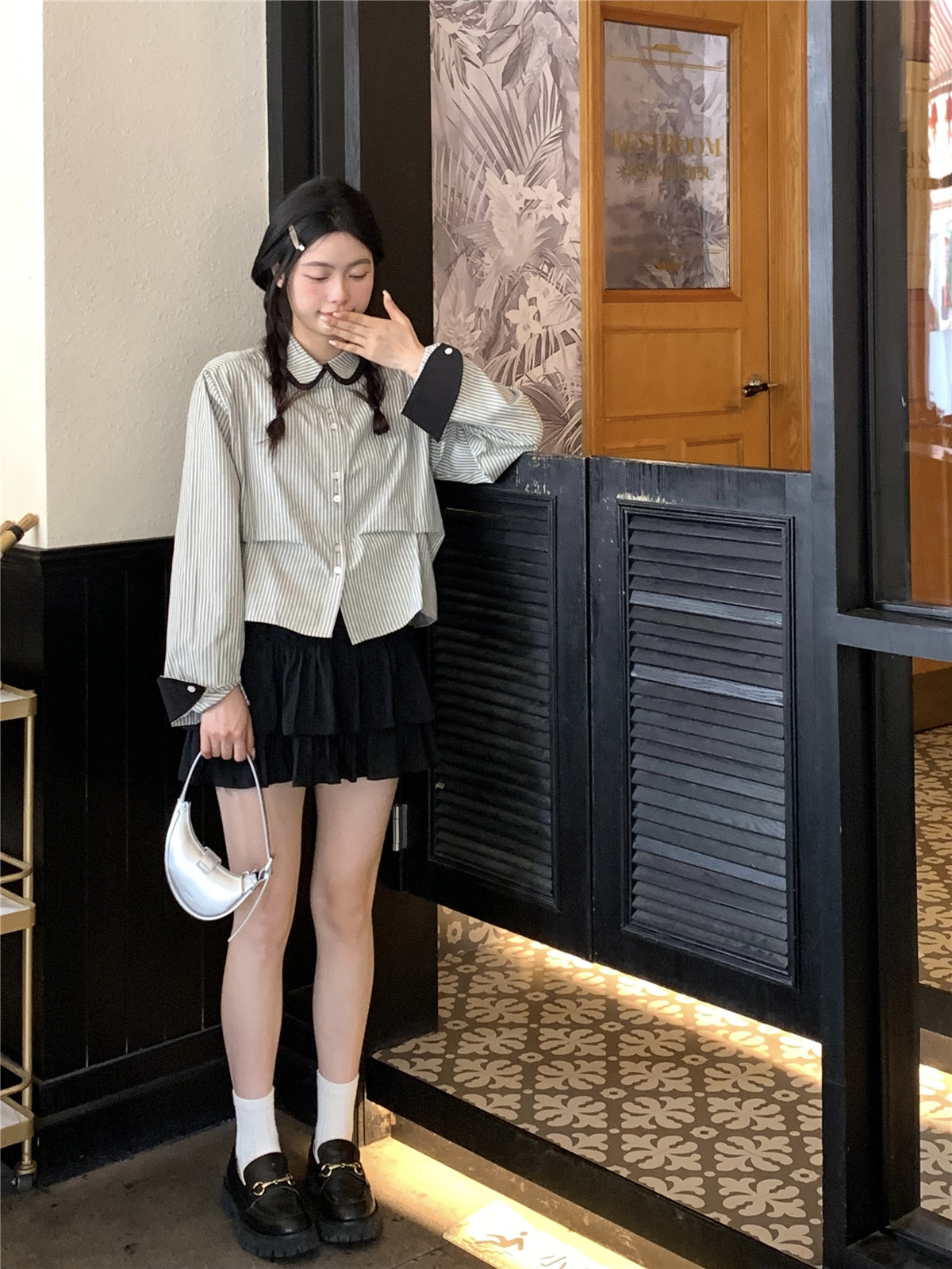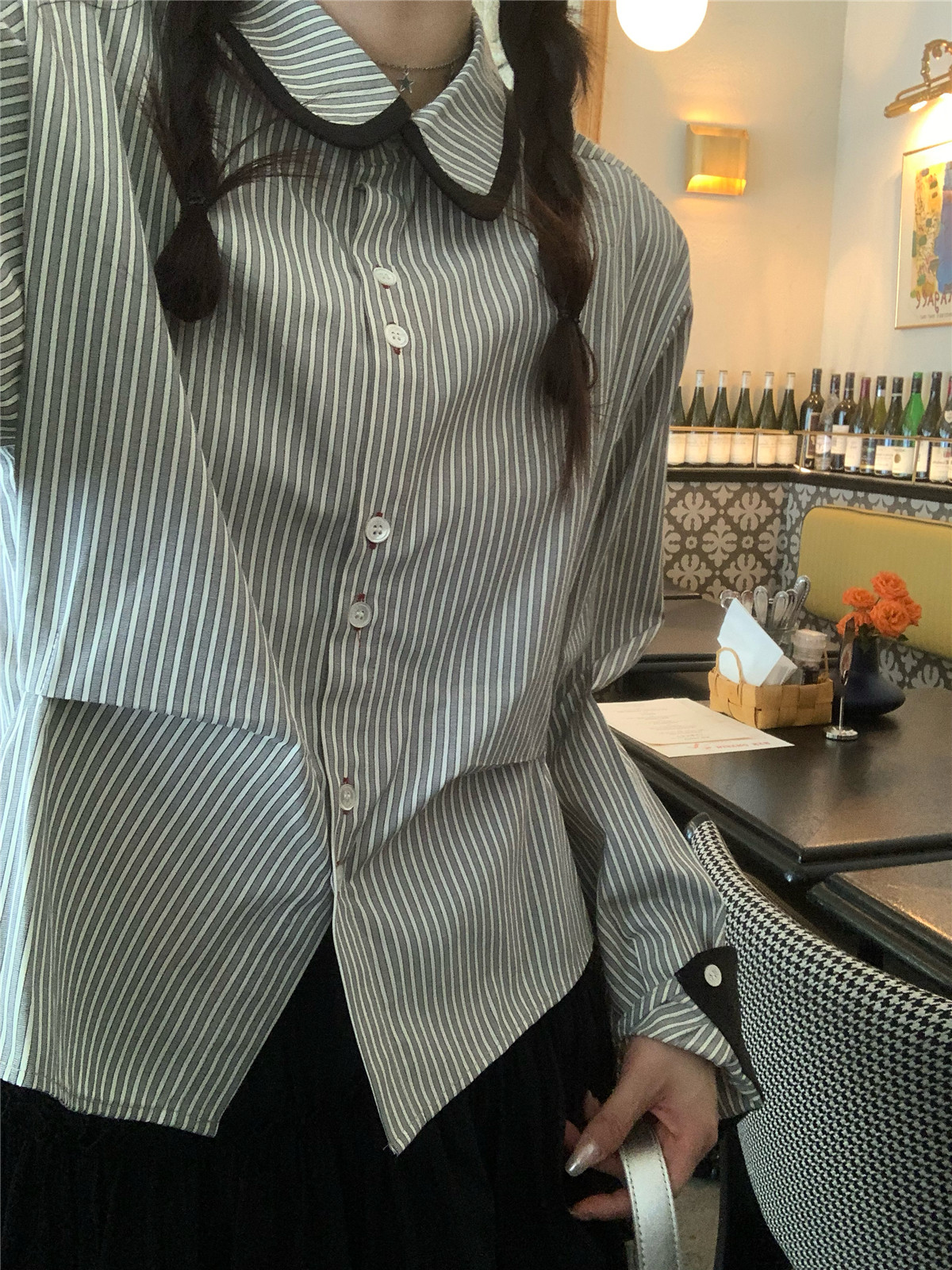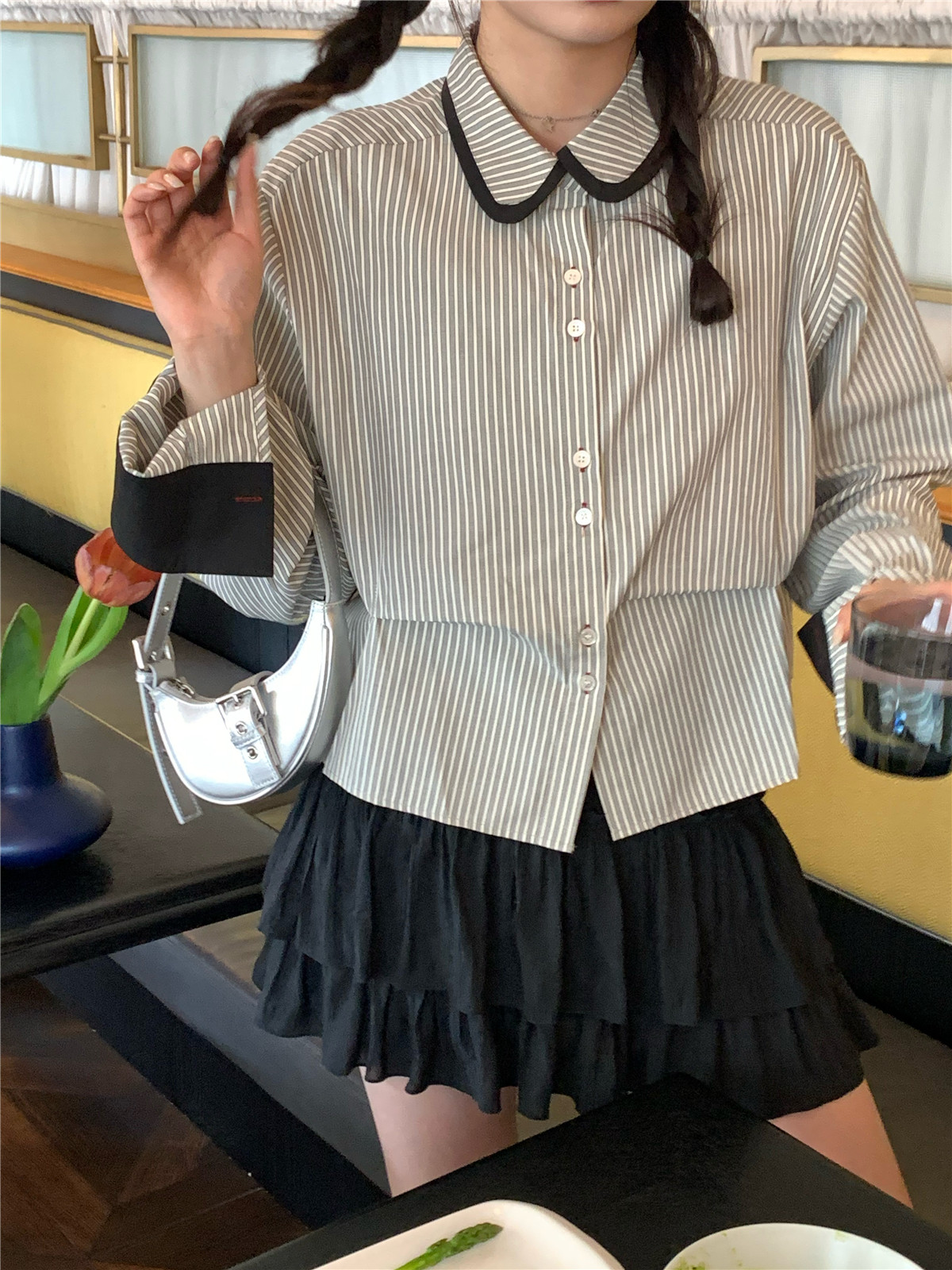 復古小個子小眾娃娃領條紋長袖襯衫女裝秋季寬鬆顯瘦襯衫短款上衣