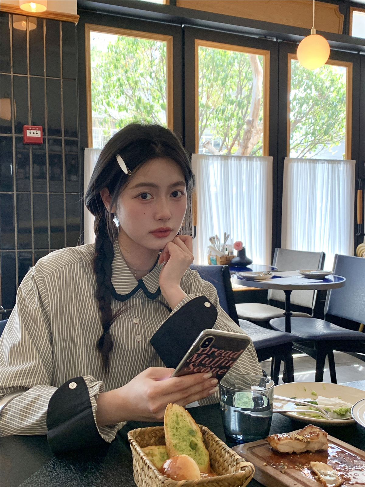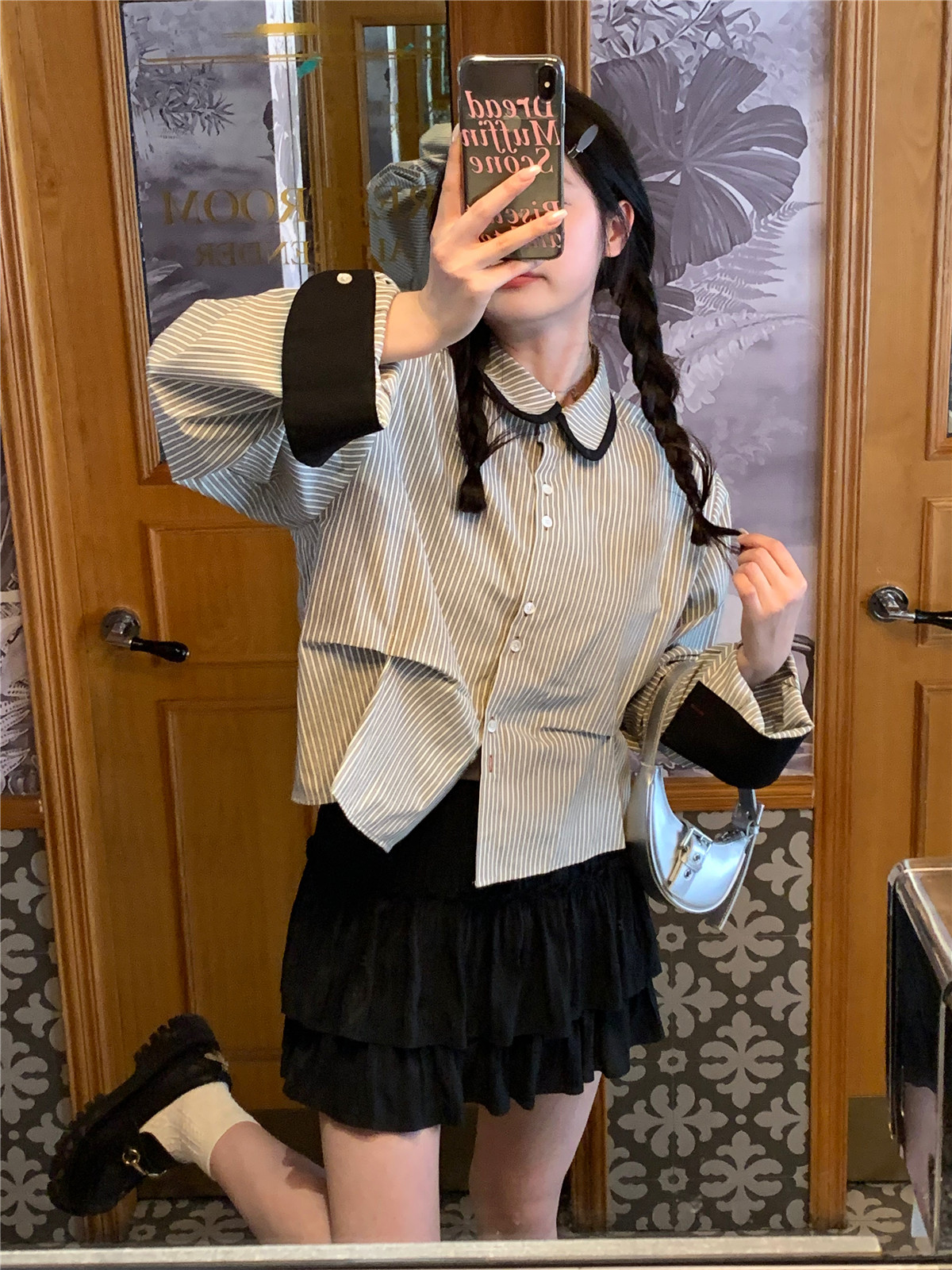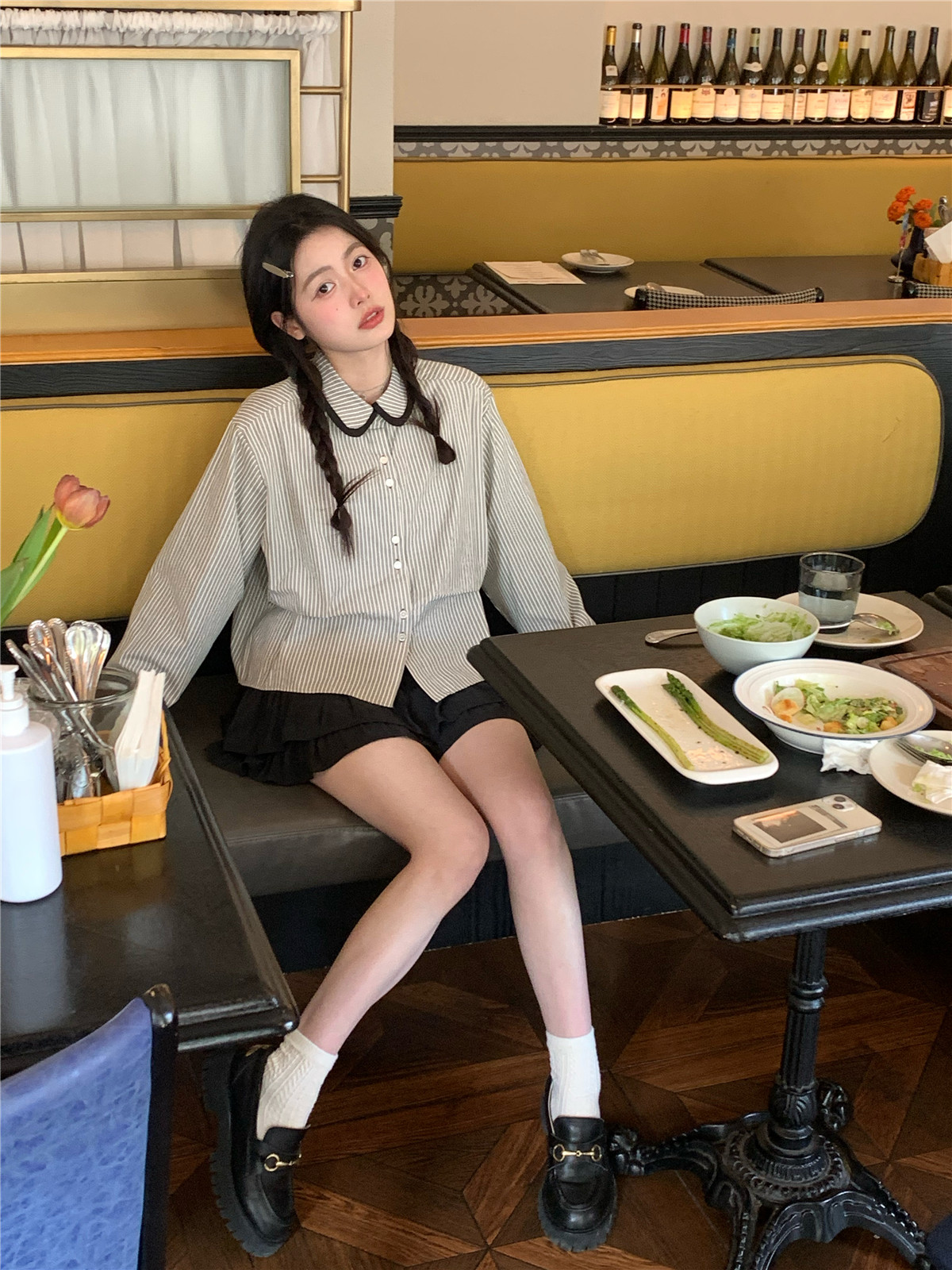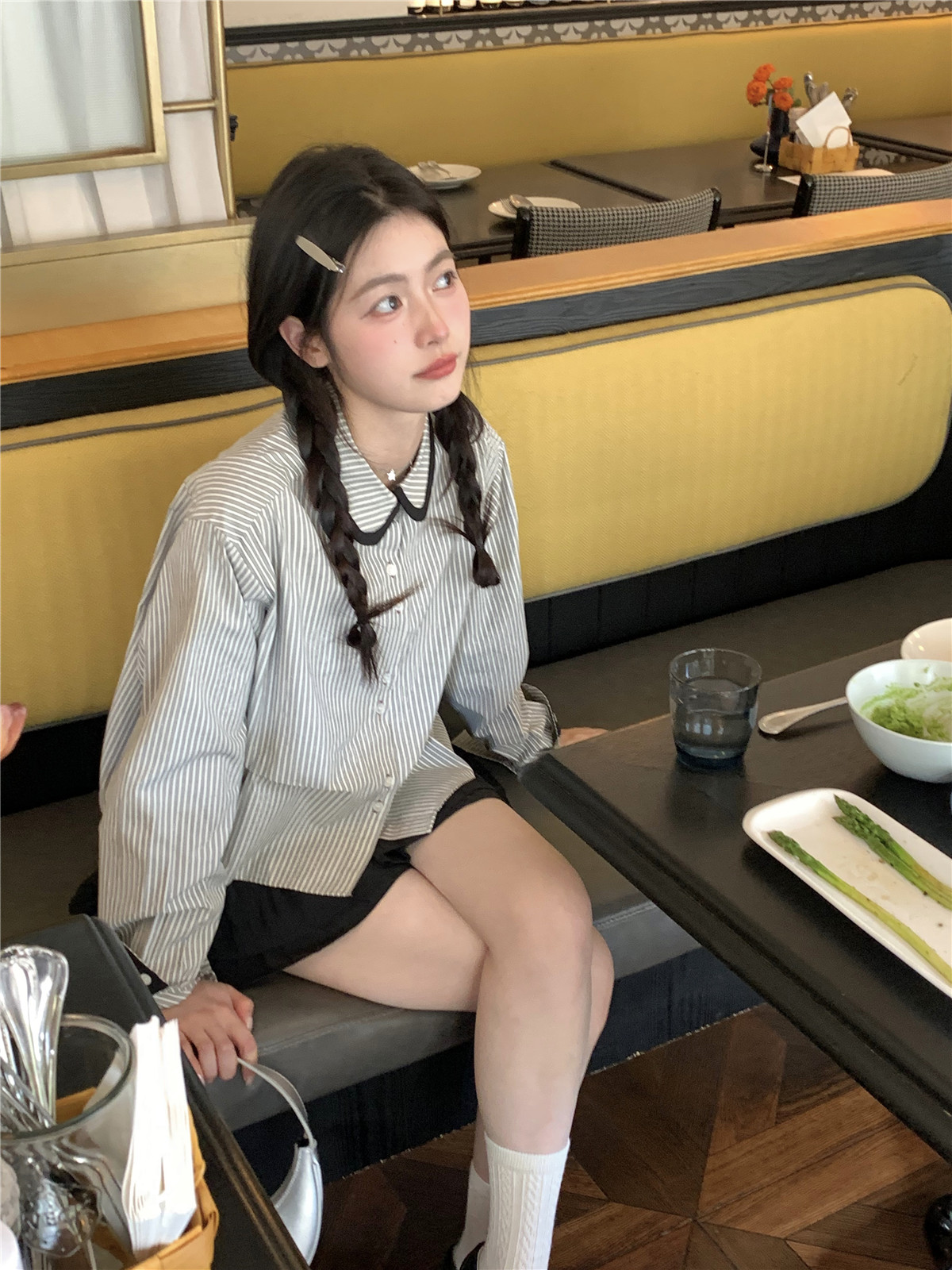 復古小個子小眾娃娃領條紋長袖襯衫女裝秋季寬鬆顯瘦襯衫短款上衣