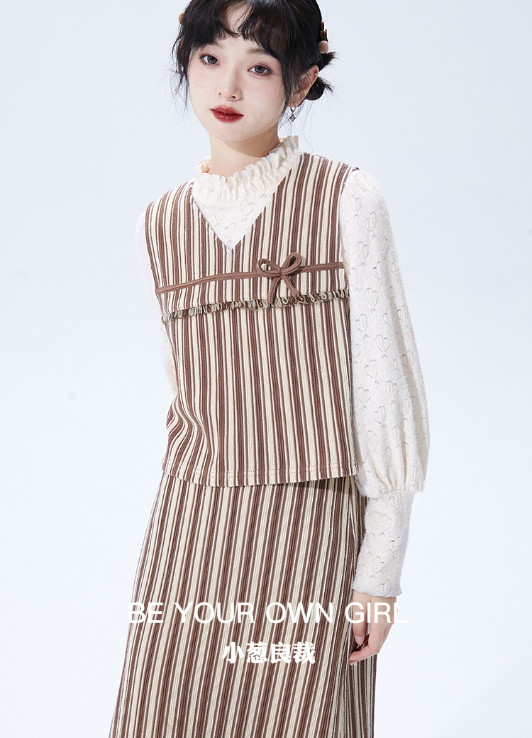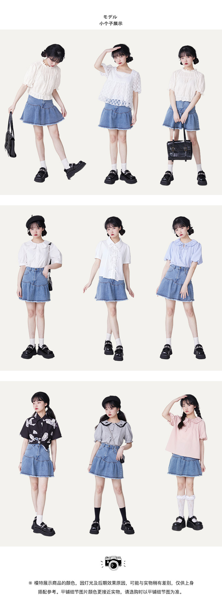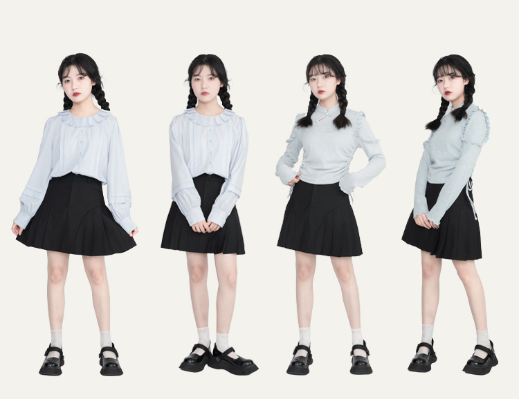 驼色百褶半身裙蓝白色泡泡袖衬衫橘红色磨毛半身裙粉色灯笼袖衬衫 灰色毛呢半身裙