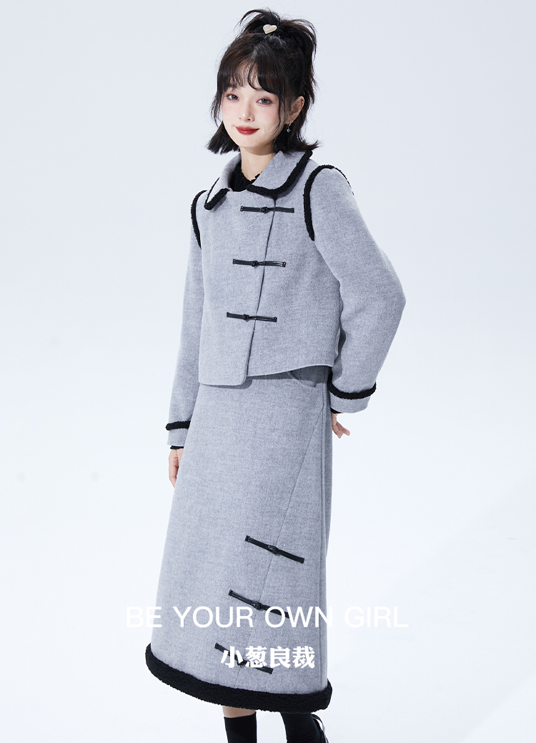 花灰色短款毛呢外套+半裙