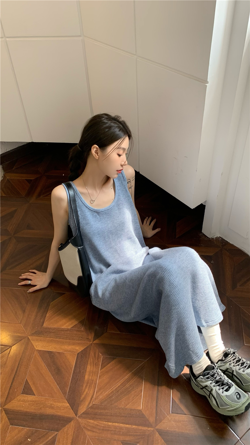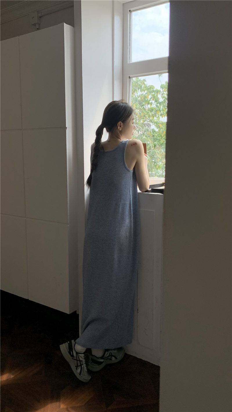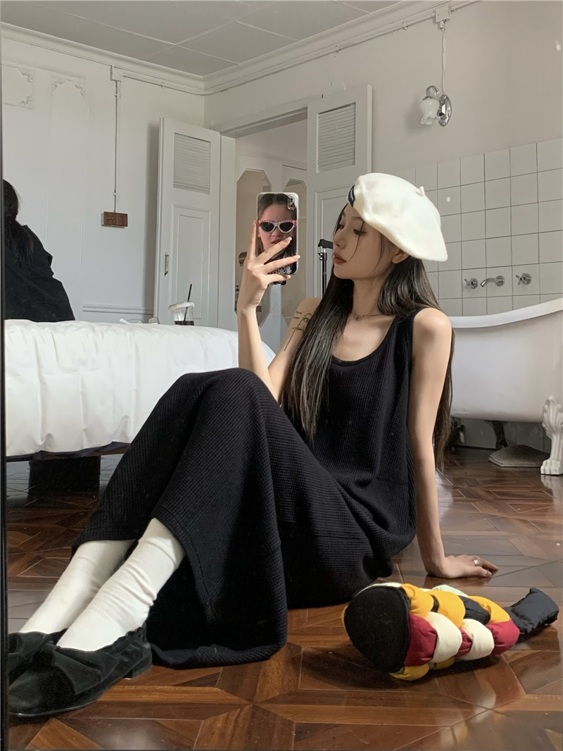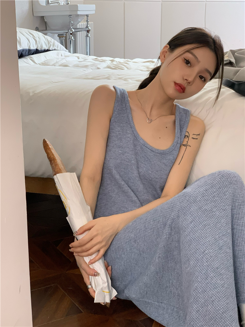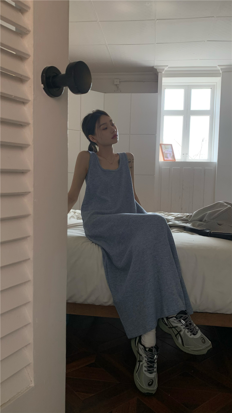 PPHOME夜暮甜曲~華夫格無袖背心洋裝顯瘦吊帶裙寬鬆慵懶風長裙