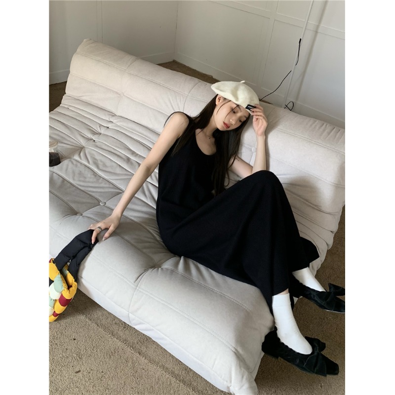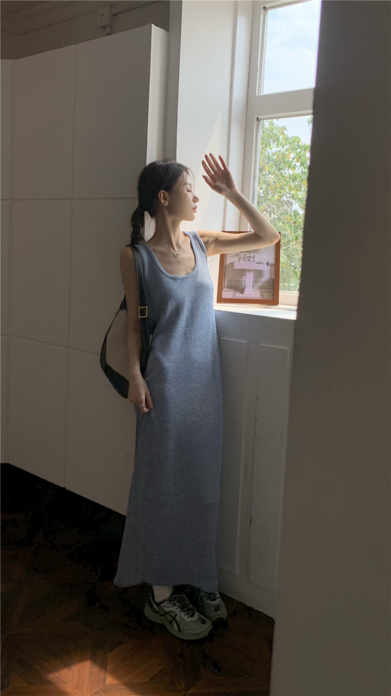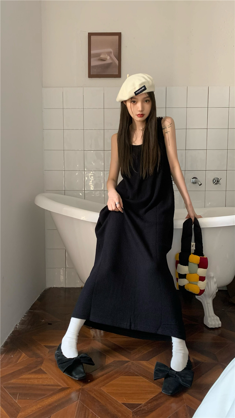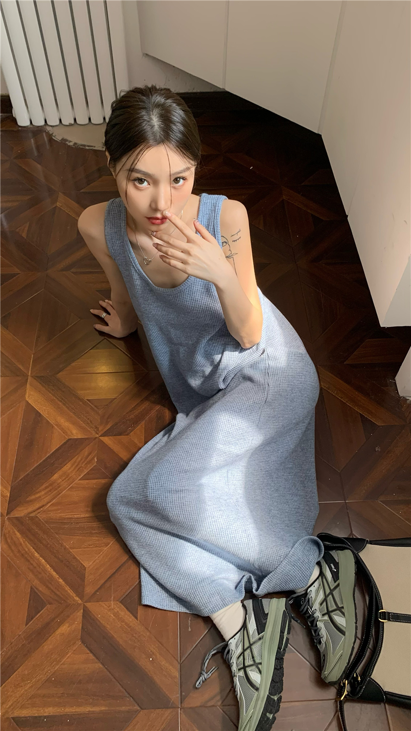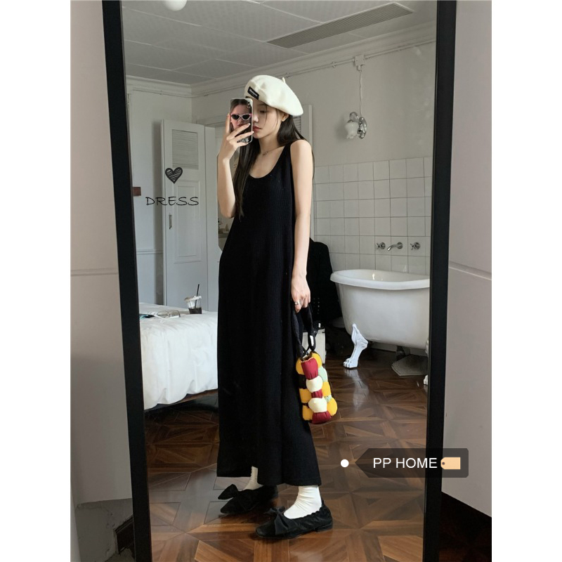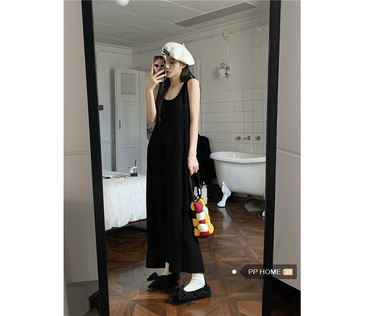 PPHOME夜暮甜曲~華夫格無袖背心洋裝顯瘦吊帶裙寬鬆慵懶風長裙
