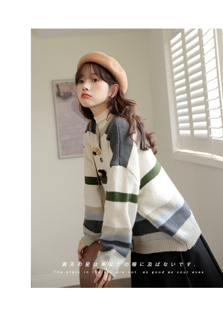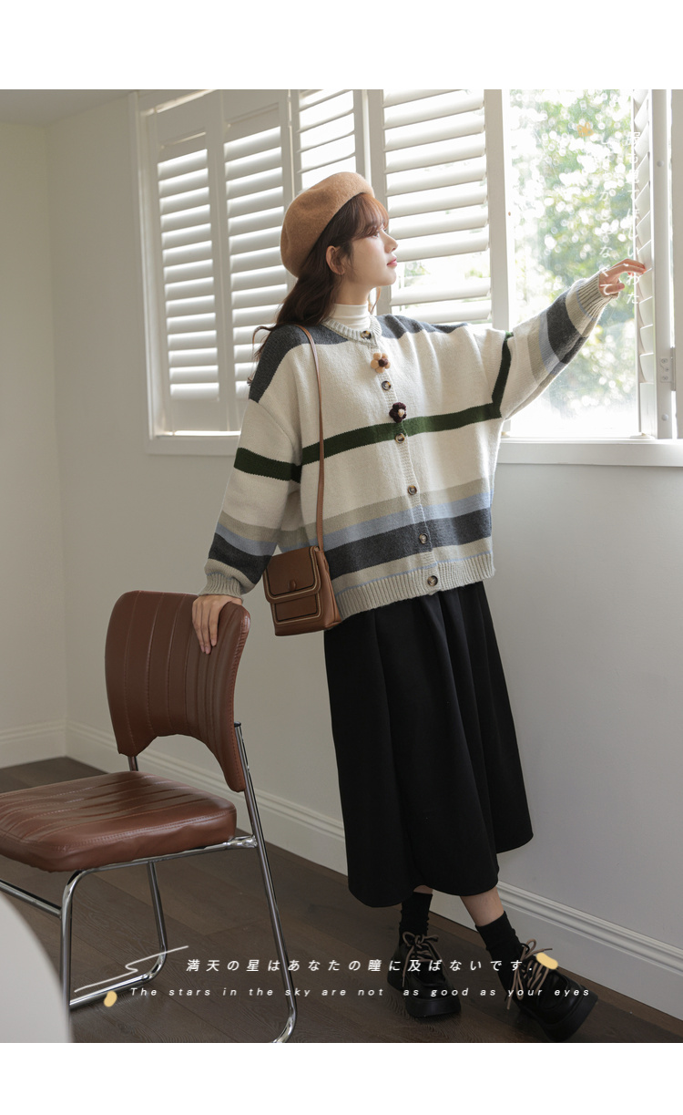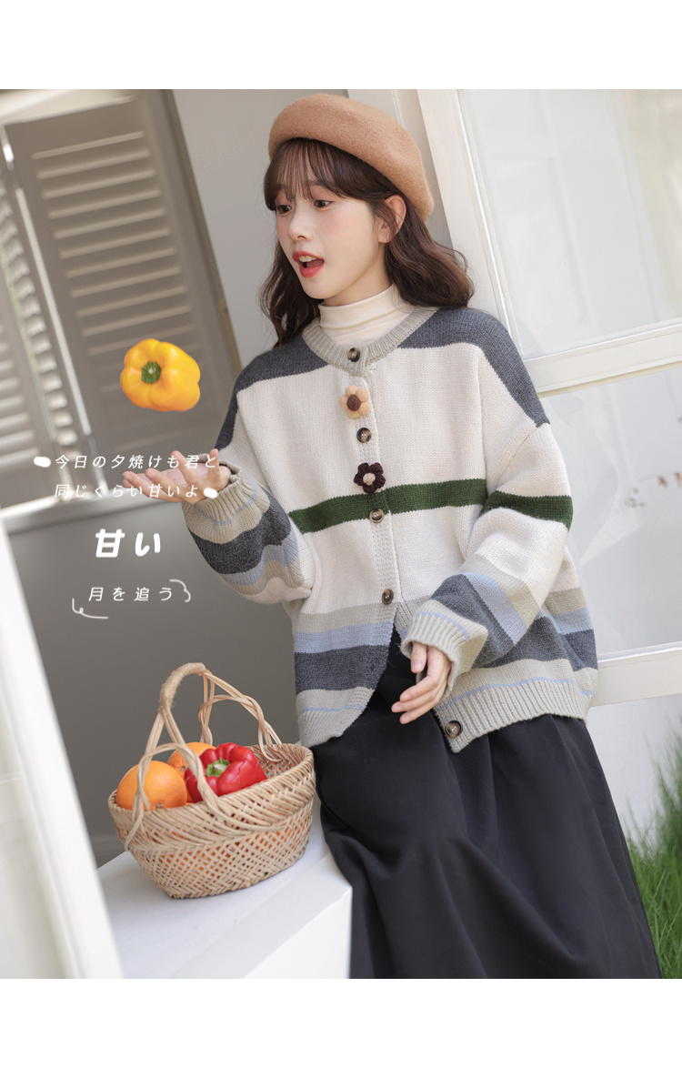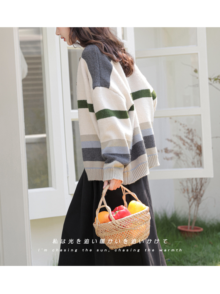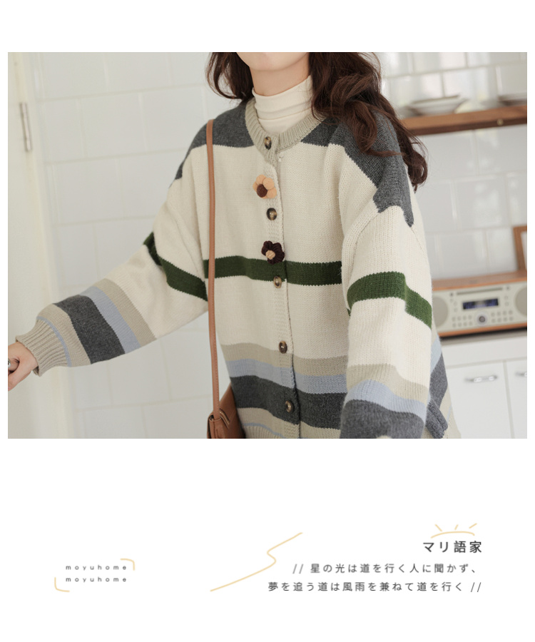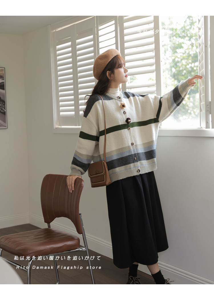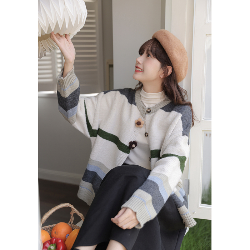 茉語家2023秋季新款日系慵懶復古針織衫高級感條紋長袖毛衣外套女