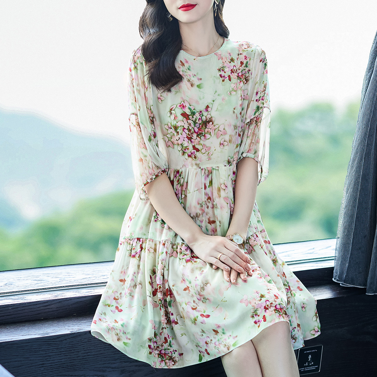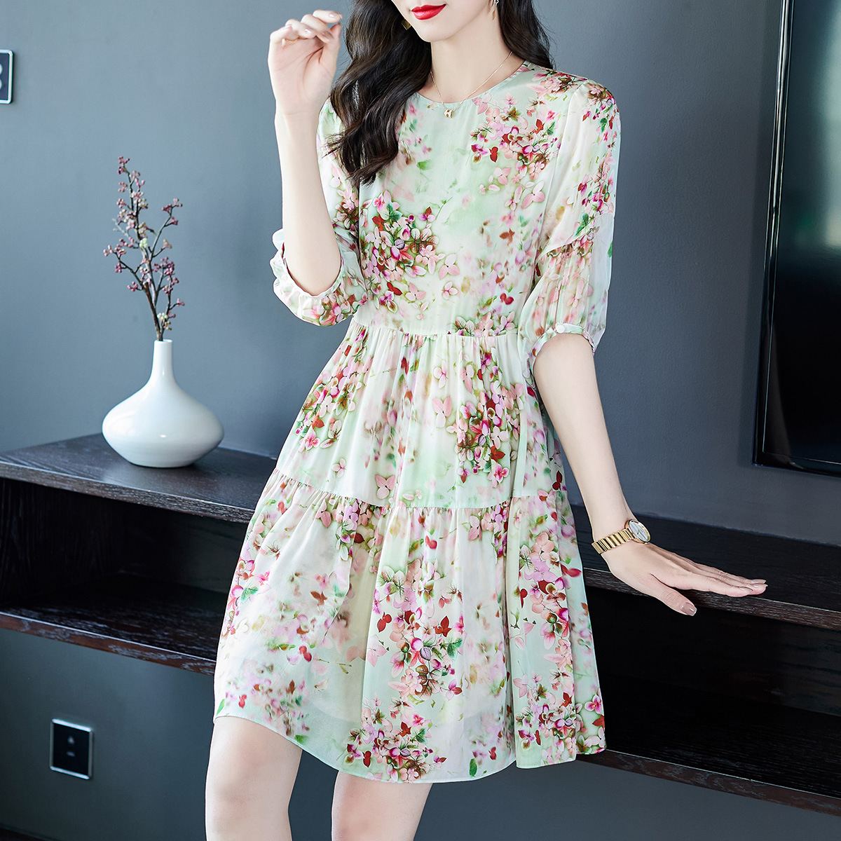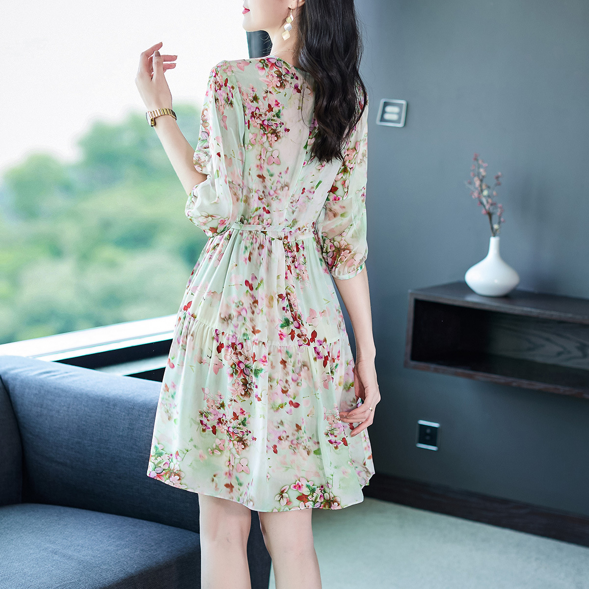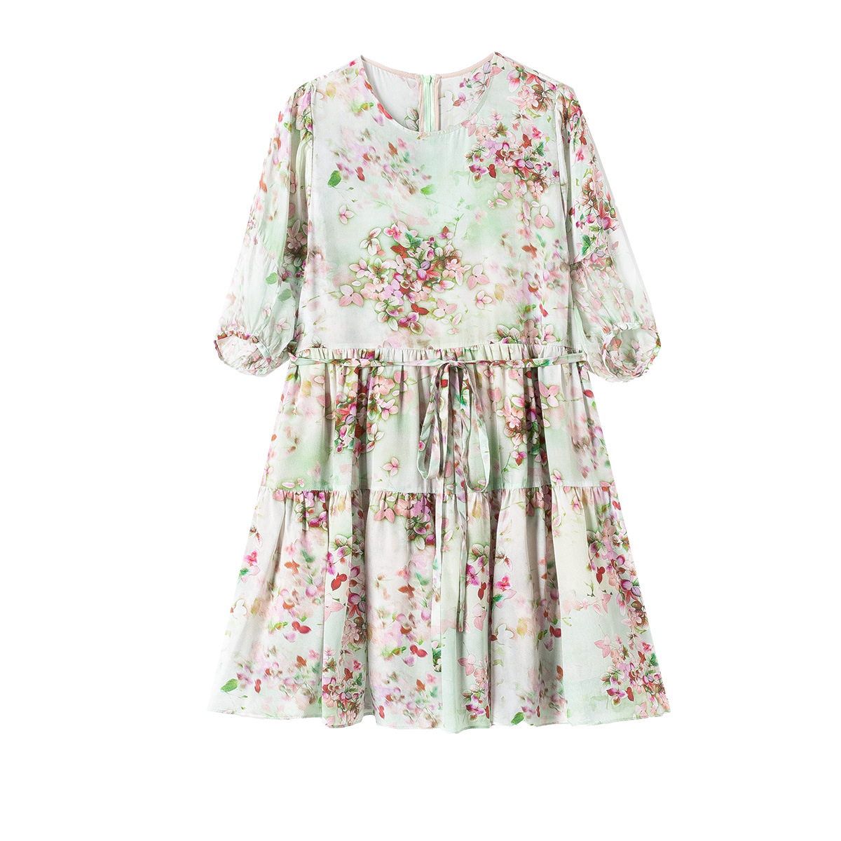 69360十里桃花绿色碎花真丝双绉连衣裙小个子桑蚕丝显瘦系带裙子