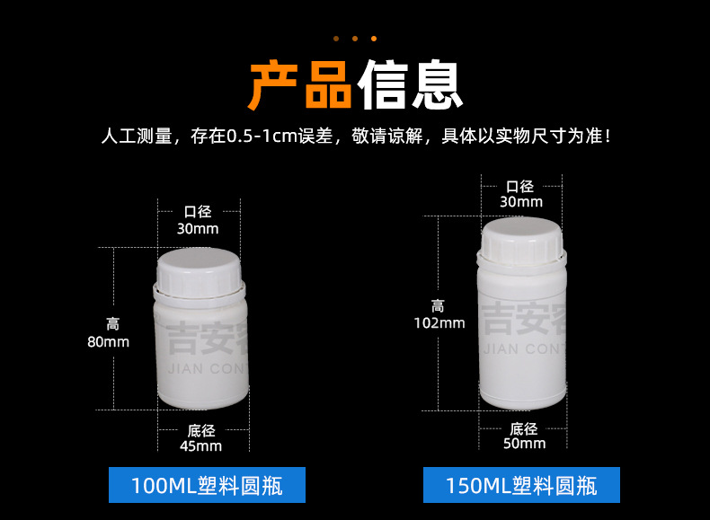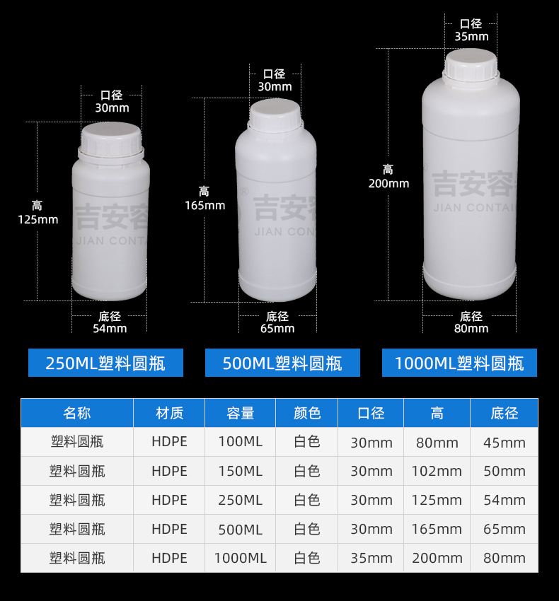 规格 250ML塑料瓶,100ML塑料瓶,500ML塑料瓶,150ML塑料瓶,1L塑料瓶(黑色),1L塑料瓶(奶白),1L塑料瓶(原色)