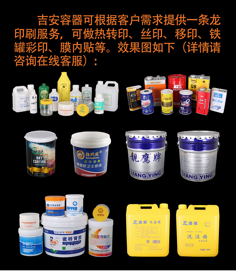东莞市吉安包装容器有限公司创立于2000年8月1日,是中国知名品牌企业。已通过ISO 9001质量管理体系资质认证,加入了中国中空协会,并获得《中国知名品牌》,《质量检验·国家标准合格产品》等荣誉称号。根据材质的不同,我们的产品分为塑料容器、铁质容器、铝材容器、玻璃容器、纸质容器等五大类。按产品的名称分为塑料桶、塑料瓶、包装桶、涂料桶、机油桶、油脂桶、化工罐、胶水瓶、铁桶、铁罐、铝瓶、铝罐、阻隔瓶、 高阻隔瓶等,容量从3ML至1000L多种规格,多种款式。适合包装的产品包括:化学试剂、化工原料、化工助剂、饲料添加剂、油墨、油漆、树脂农药、日用化学品、聚氨脂、胶粘剂,广泛应用于化工、建筑、食品、医疗、生物等各领域。