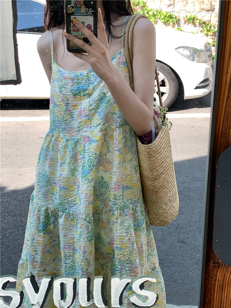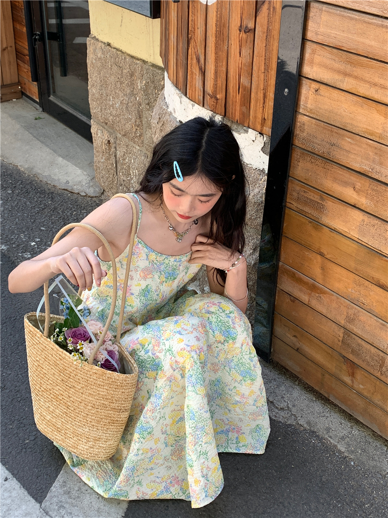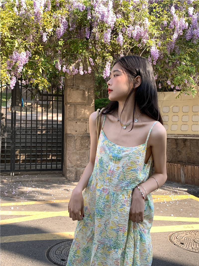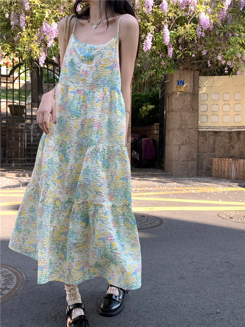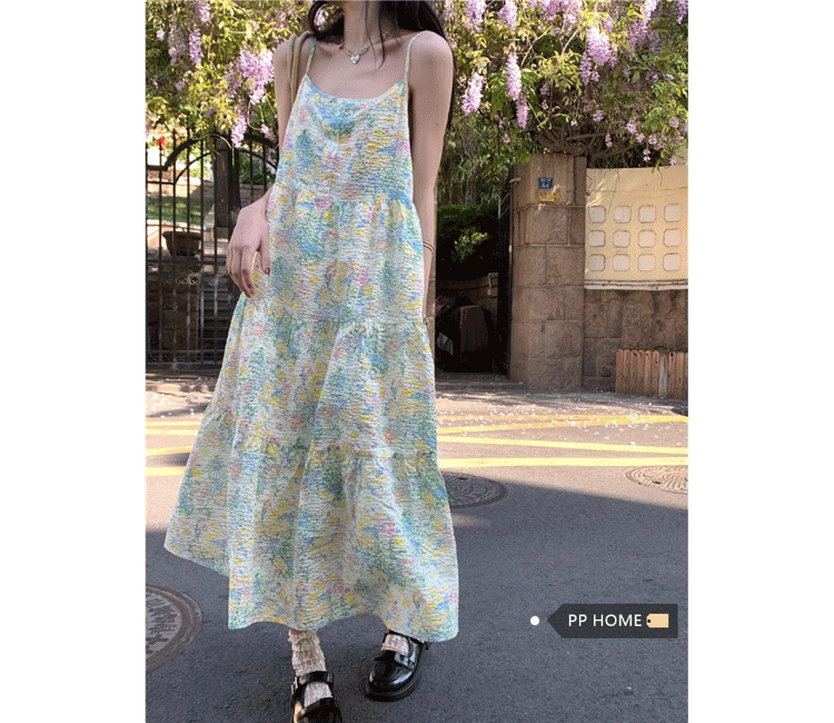 PPHOME純甜公主~法式碎花無袖吊帶裙洋裝女甜美小清新中長裙子