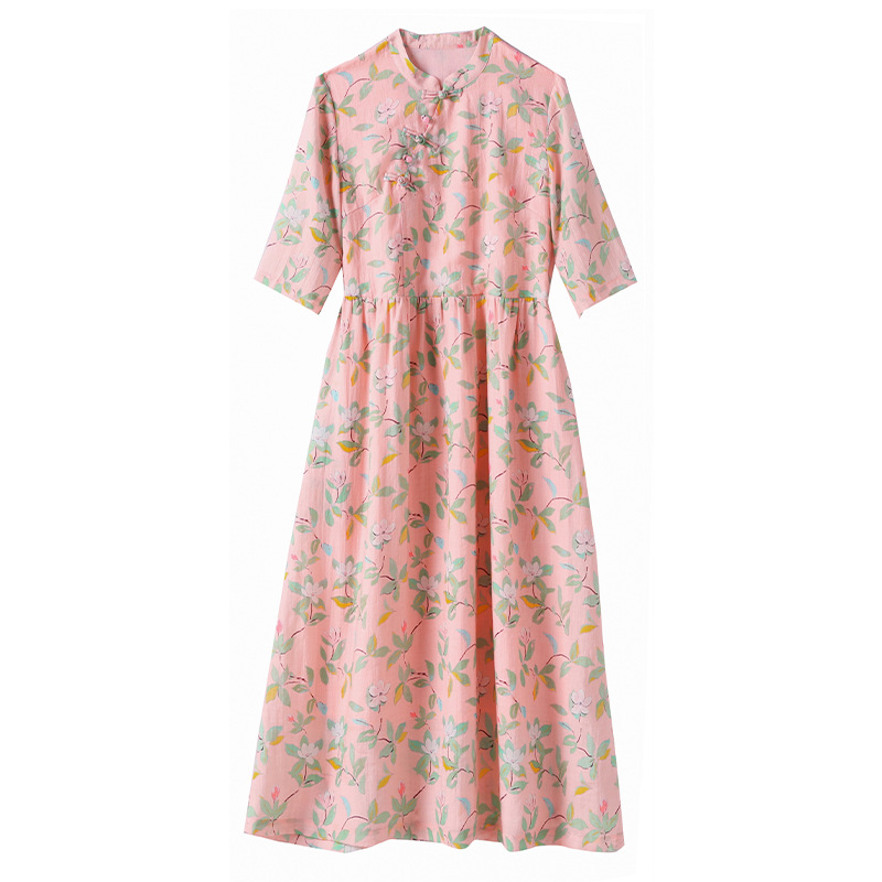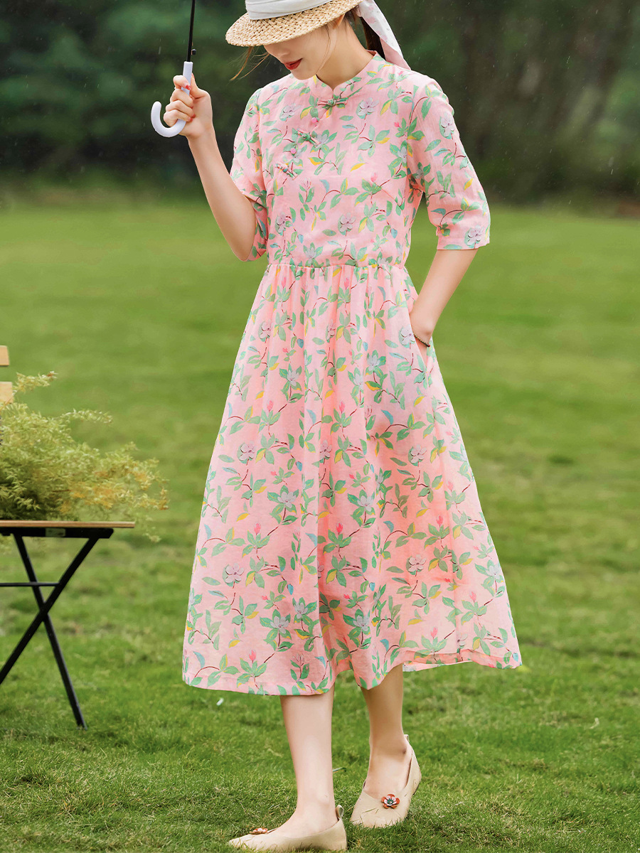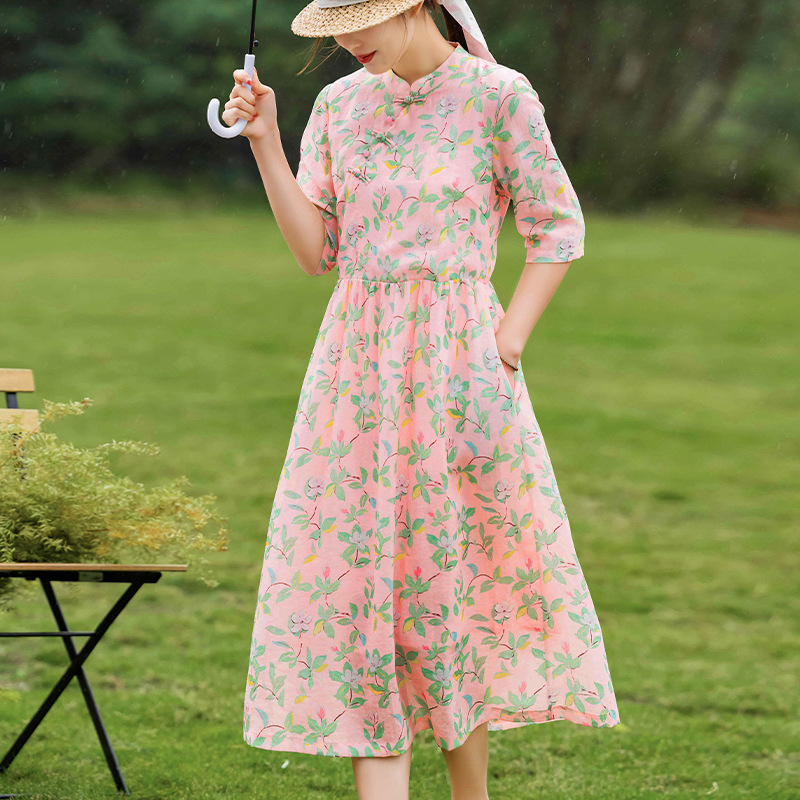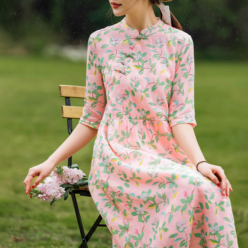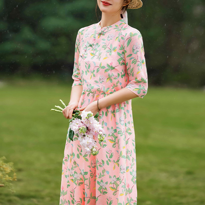 2023夏季新款高端苎麻碎花连衣裙改良式旗袍领文艺田园风树叶印花