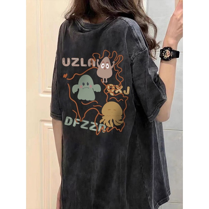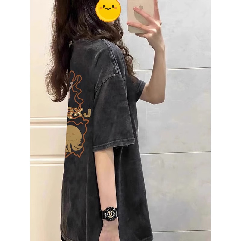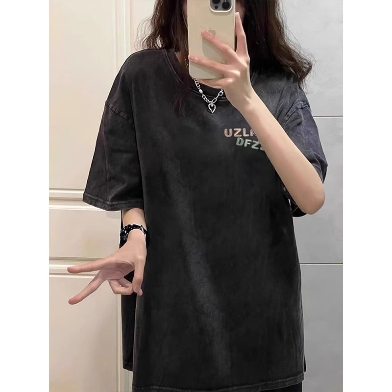 美式復古潮牌正肩短袖t恤女夏季設計感小眾寬鬆做舊水洗甜酷上衣