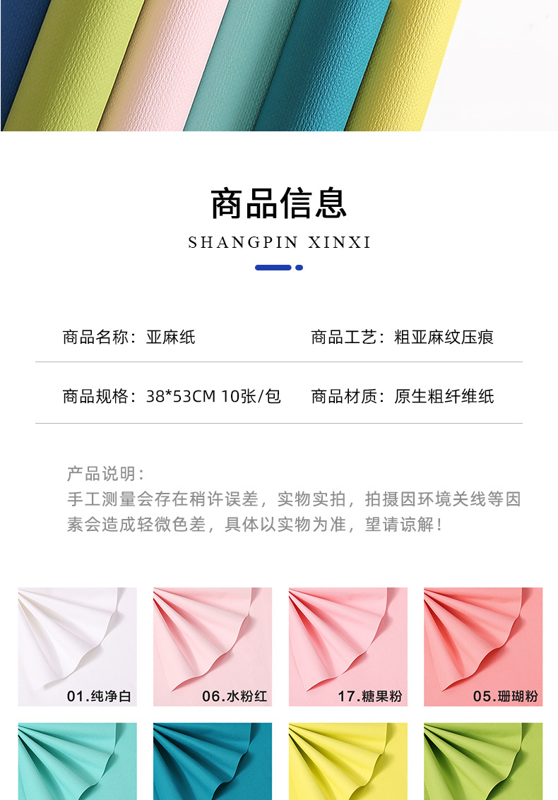 颜色 纯净白 (亚麻纸 10张) 38*53CM,水粉红 (亚麻纸 10张) 38*53CM,糖果粉 (亚麻纸 10张) 38*53CM,珊瑚粉 (亚麻纸 10张) 38*53CM,松石绿 (亚麻纸 10张) 38*53CM,法蓝 (亚麻纸 10张) 38*53CM,豆蔻黄 (亚麻纸 10张) 38*53CM,青芽绿 (亚麻纸 10张) 38*53CM,冷淡灰 (亚麻纸 10张) 38*53CM,青灰 (亚麻纸 10张) 38*53CM,白桦灰 (亚麻纸 10张) 38*53CM,爽朗绿 (亚麻纸 10张) 38*53CM,绅士灰 (亚麻纸 10张) 38*53CM,海棠红 (亚麻纸 10张) 38*53CM,紫罗兰 (亚麻纸 10张) 38*53CM,公主蓝 (亚麻纸 10张) 38*53CM,拿铁棕 (亚麻纸 10张) 38*53CM,郁金黑 (亚麻纸 10张) 38*53CM,欢喜红 (亚麻纸 10张) 38*53CM,沙尘灰 (亚麻纸 10张) 38*53CM
