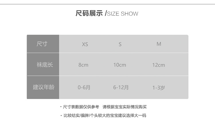 童袜尺码 XS码0-6个月,S码6-12个月,M码1-3岁
