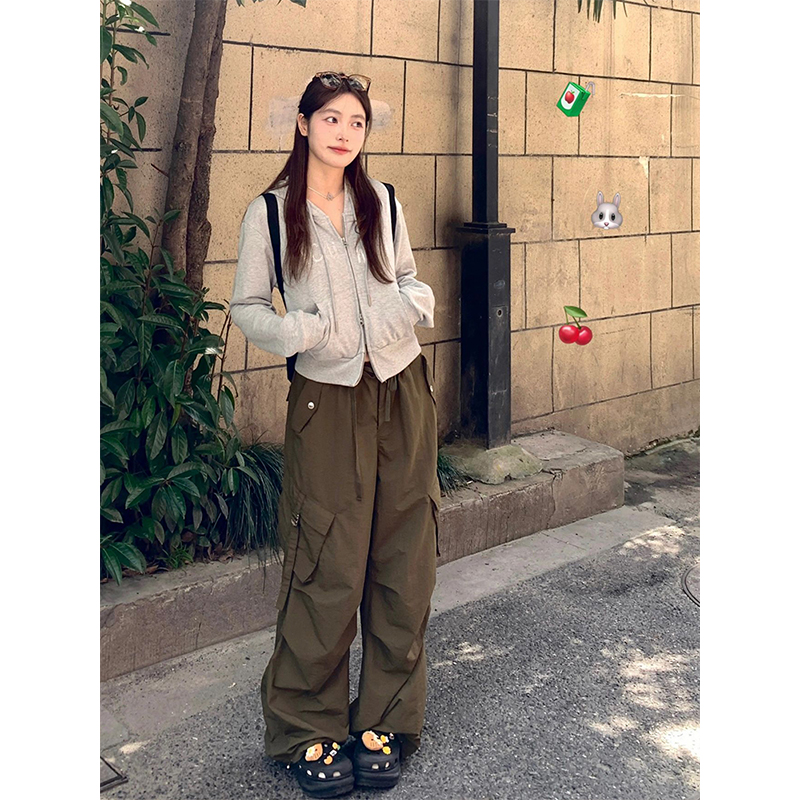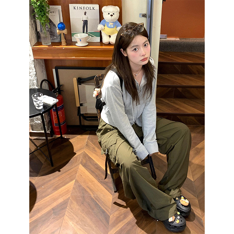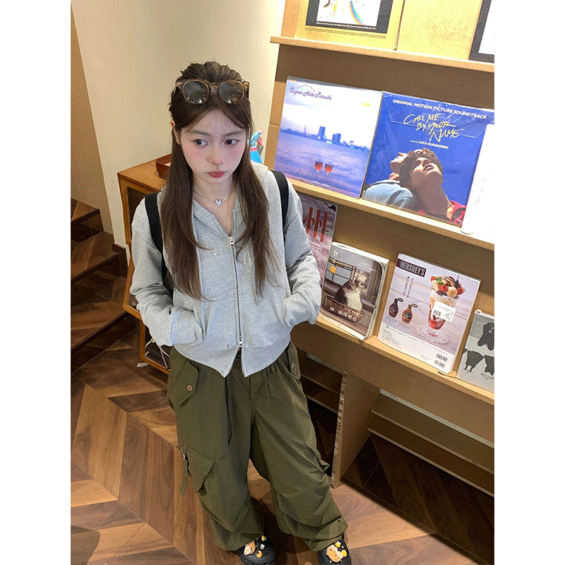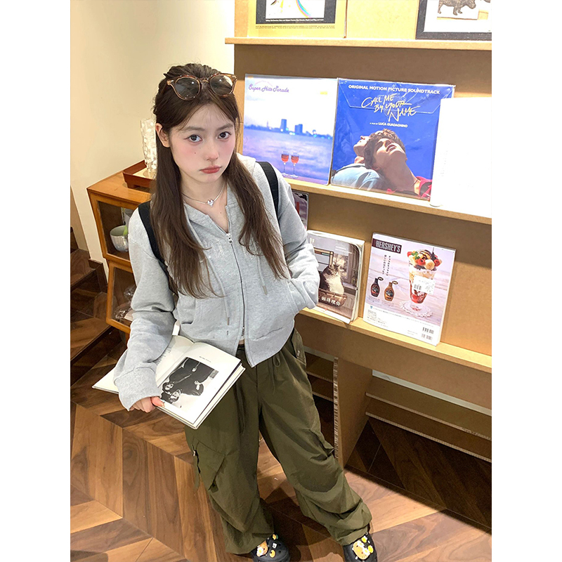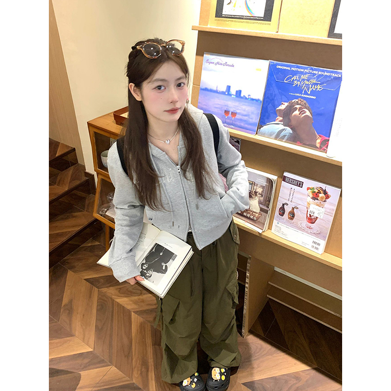 灰色雙拉鍊連帽運動衫女2023早秋新款燙鑽長袖開衫修身顯瘦短款外套
