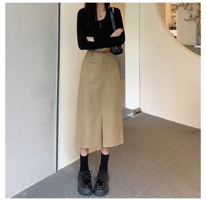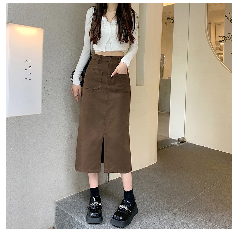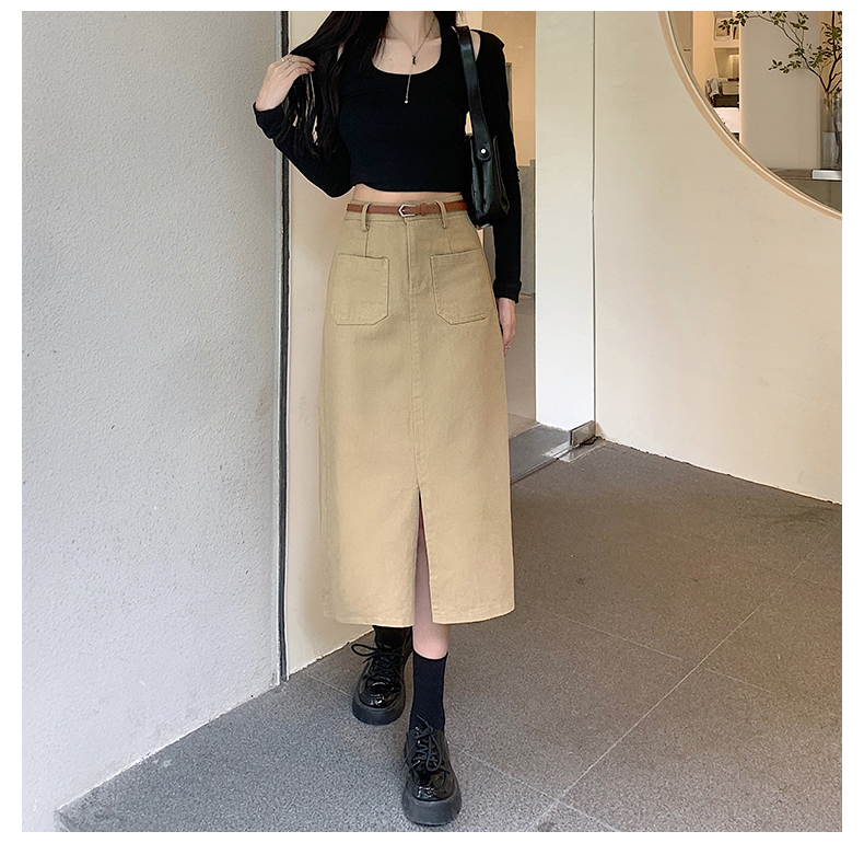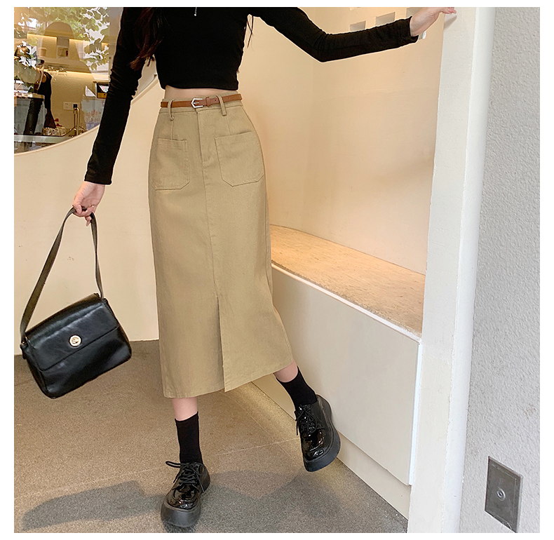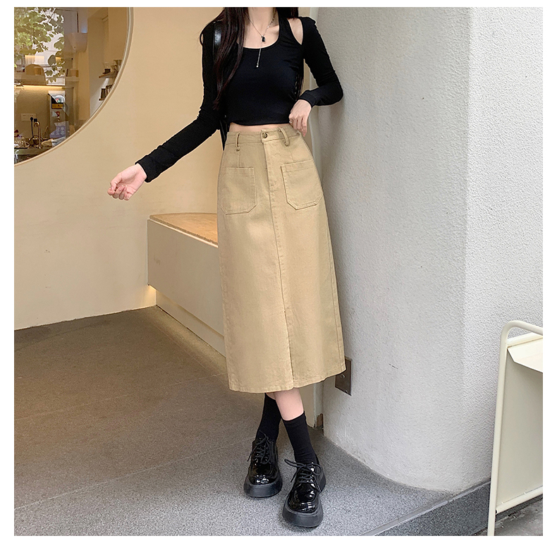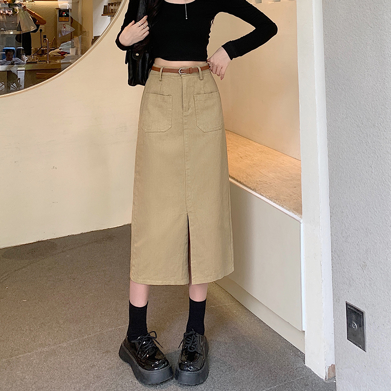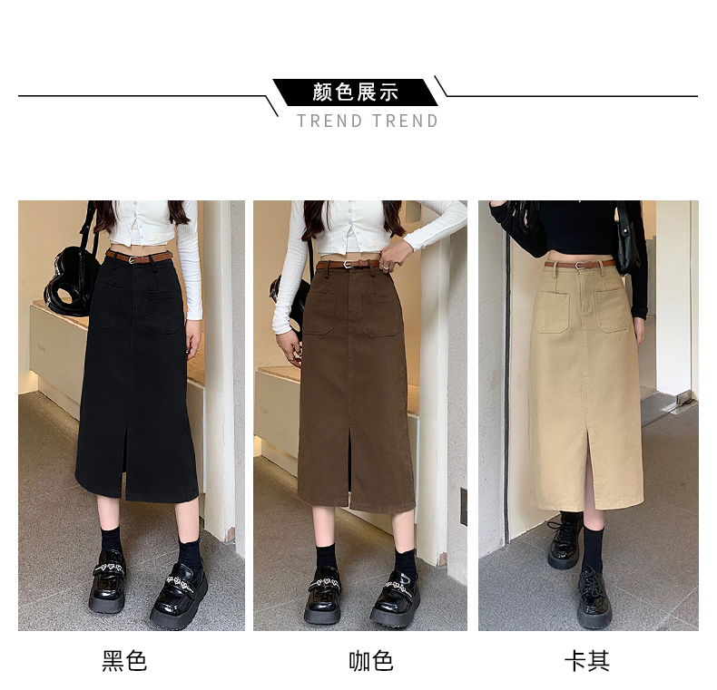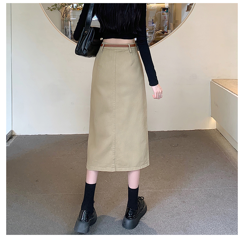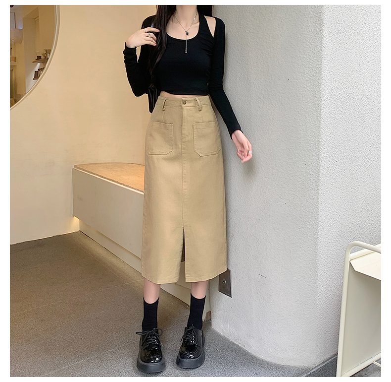 開叉一步牛仔裙卡其色半身裙女春夏中長版直筒包臀a字裙2023新款