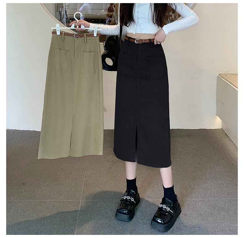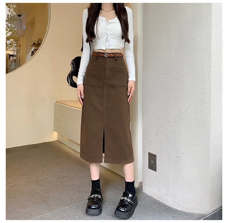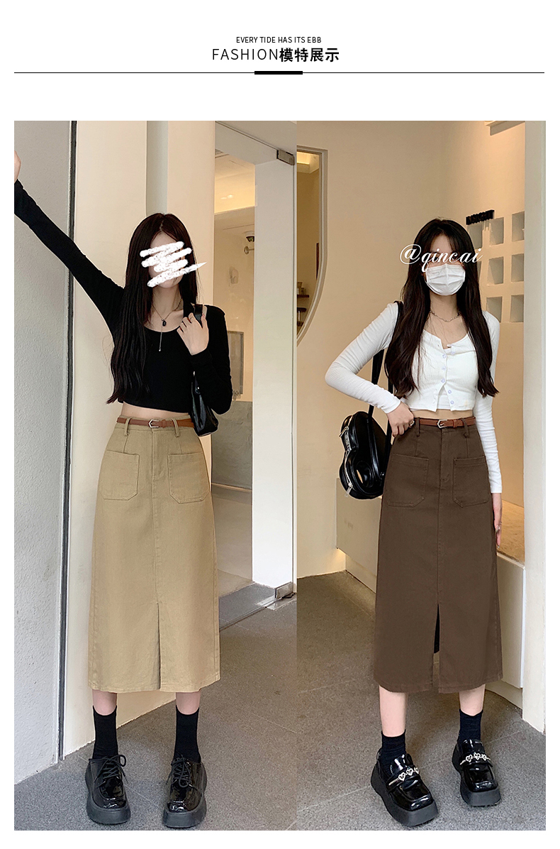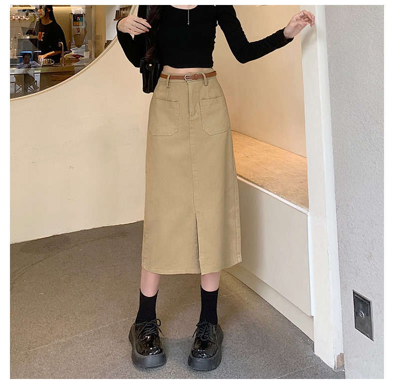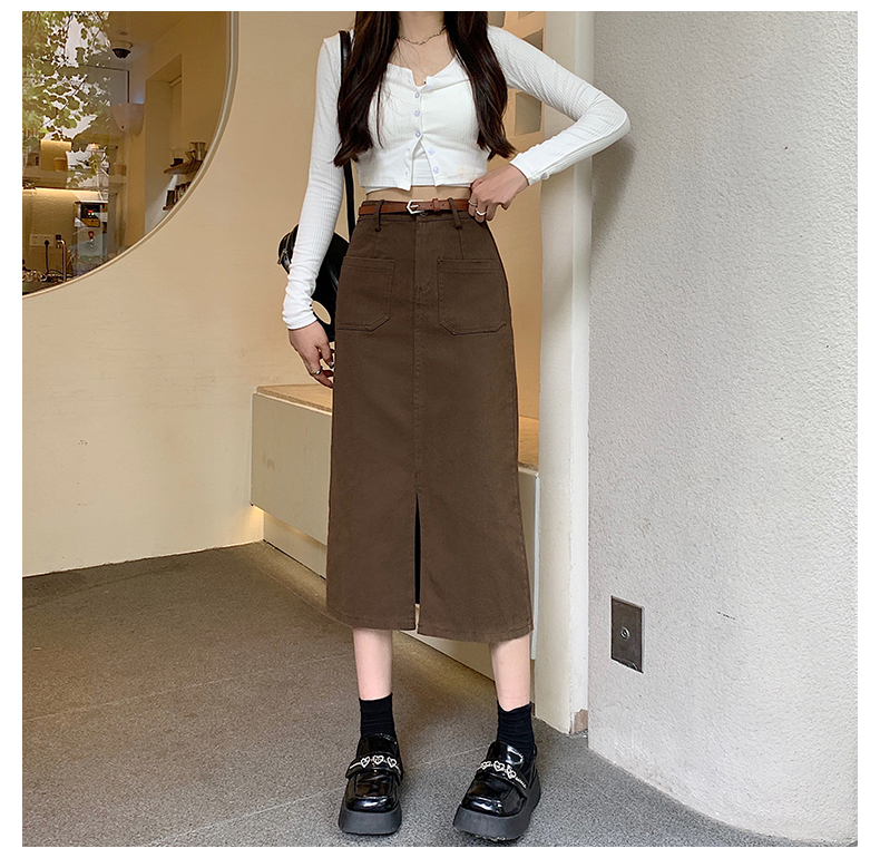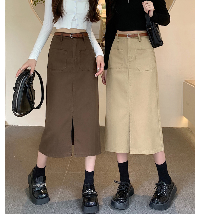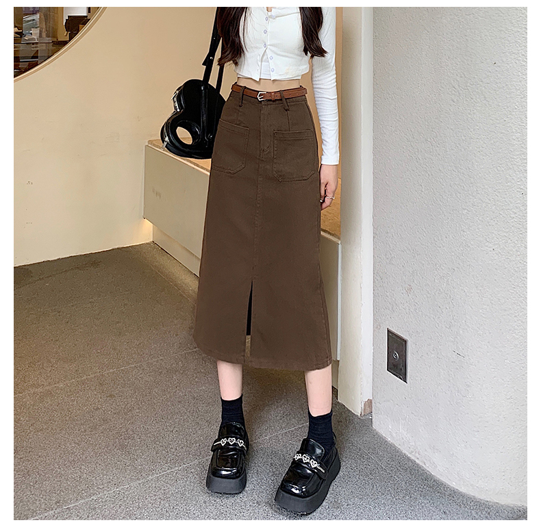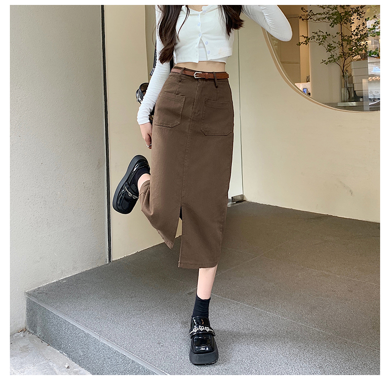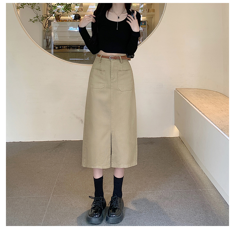 開叉一步牛仔裙卡其色半身裙女春夏中長版直筒包臀a字裙2023新款