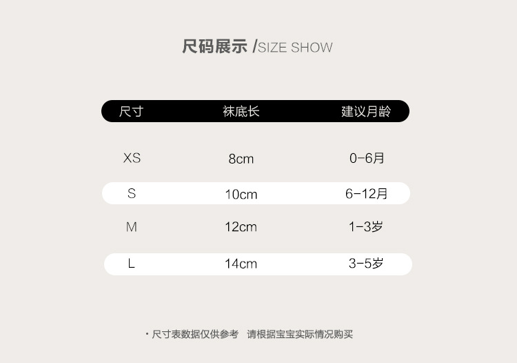 童袜尺码 XS 0-6个月,S 6-12个月,M 1-3岁,L 3-5岁