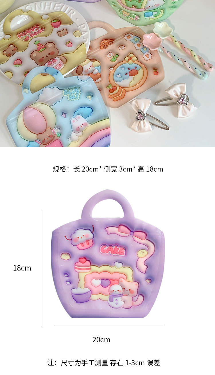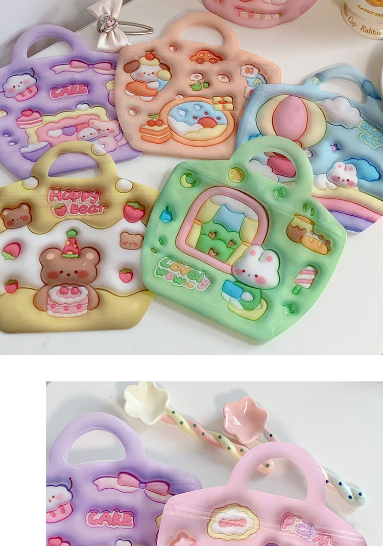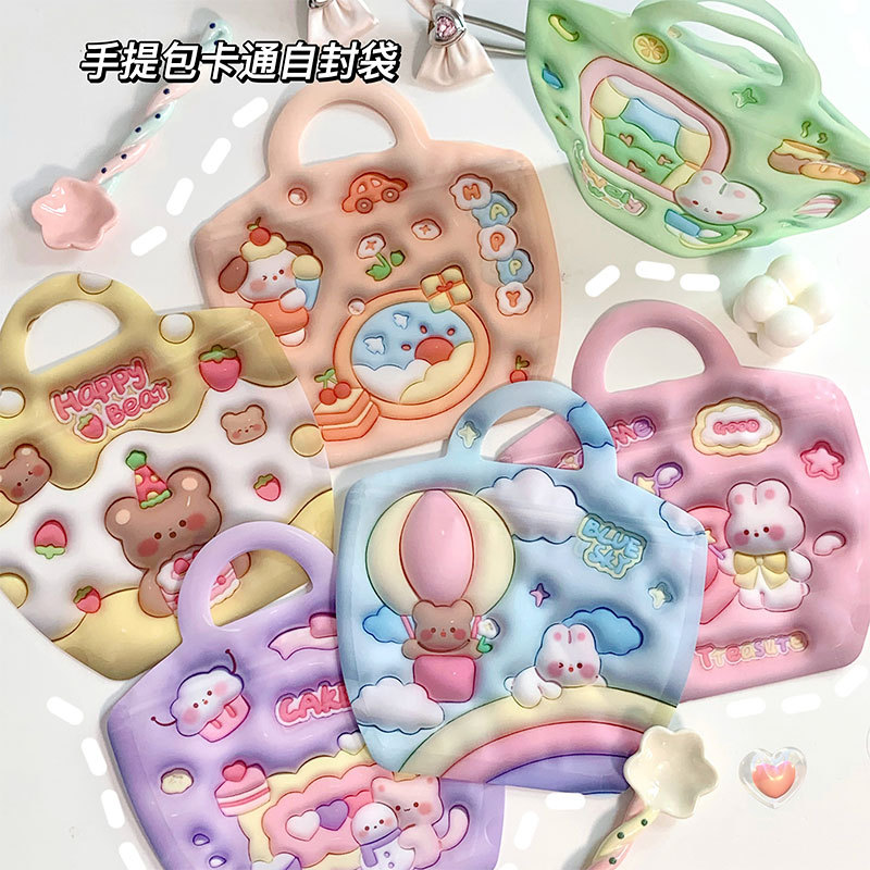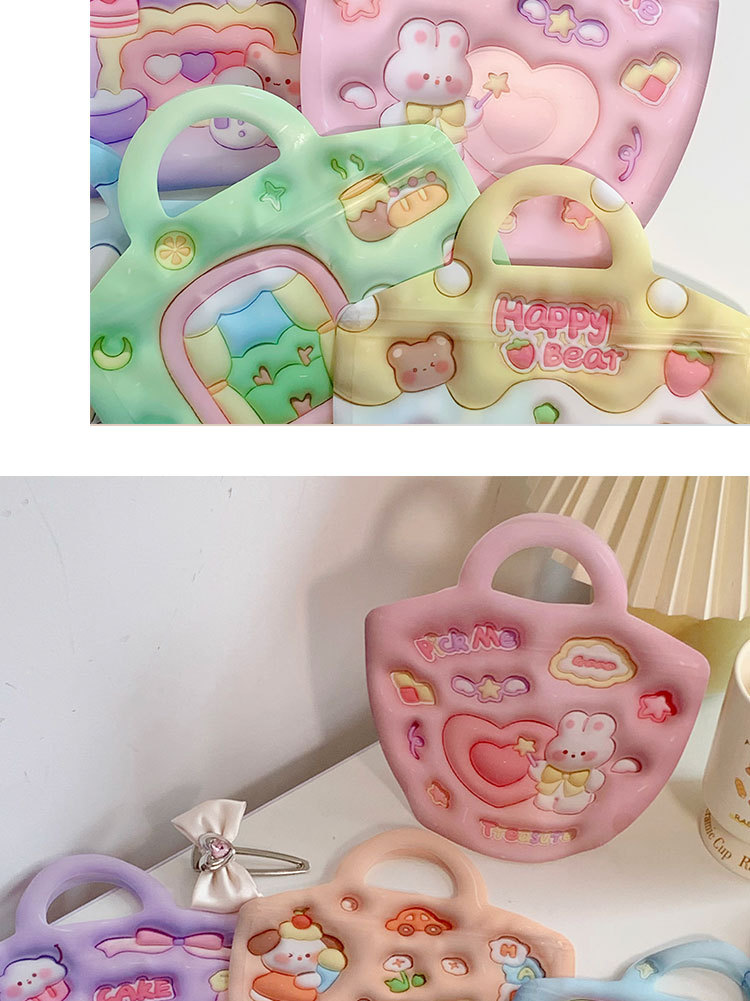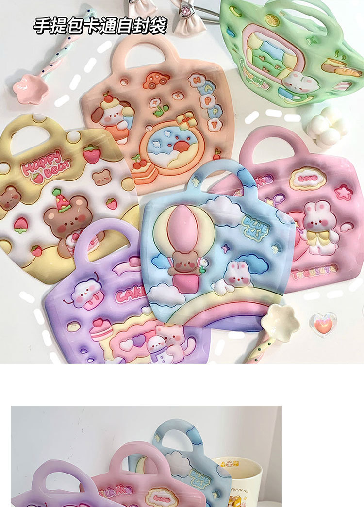 颜色 手提自封袋粉色爱心魔法小兔系列(3款混发),手提自封袋紫色雪人小猫系列(3款混发),手提自封袋草莓花园小狗系列(3款混发),手提自封袋春天钓鱼记系列(3款混发),自封袋立体图案-绿色背包系列(3款混发),自封袋立体图案-橙色背包系列(3款混发)