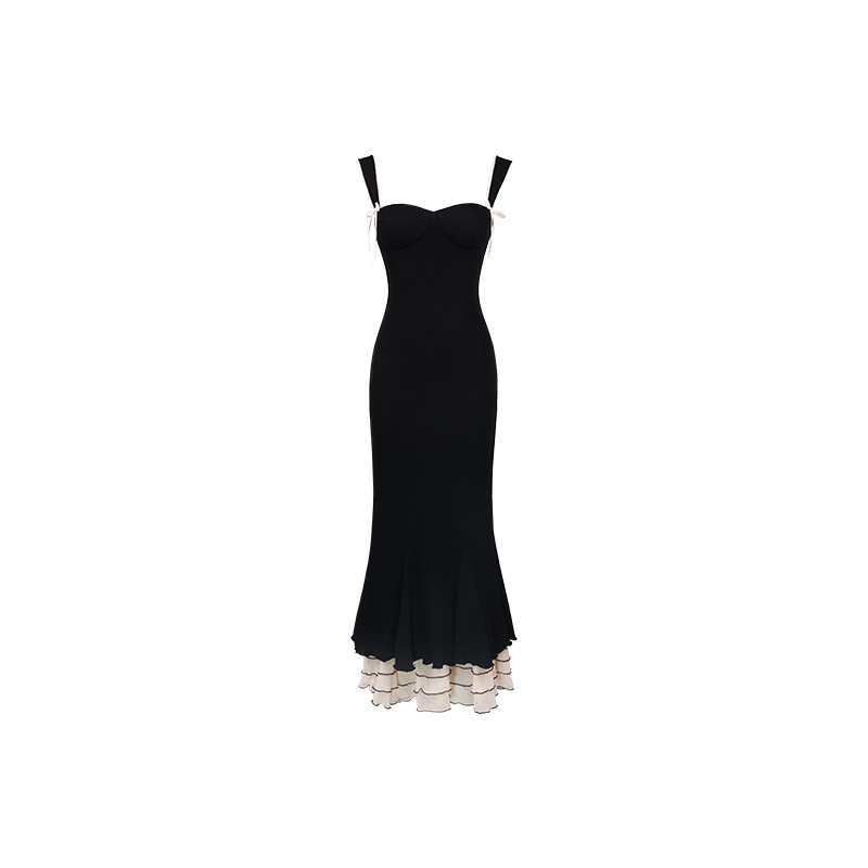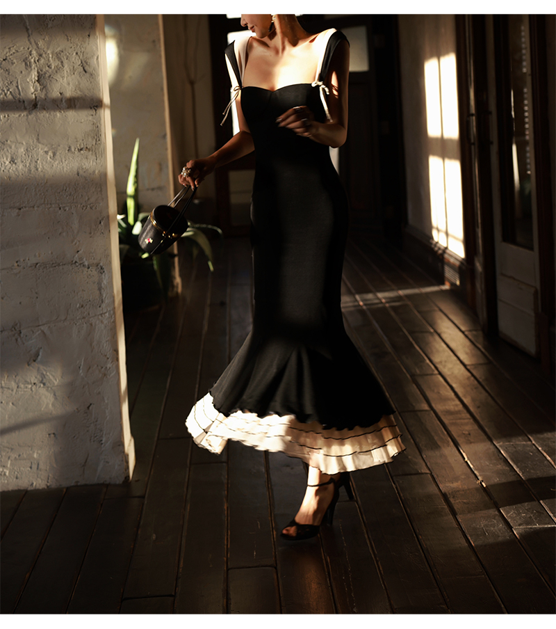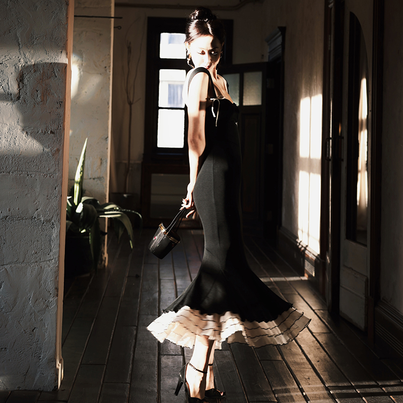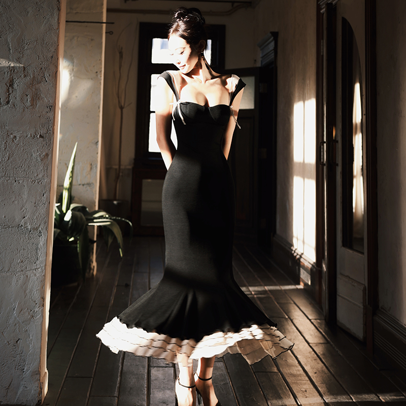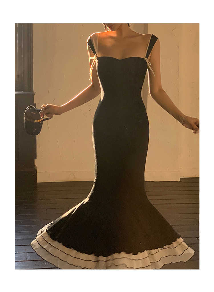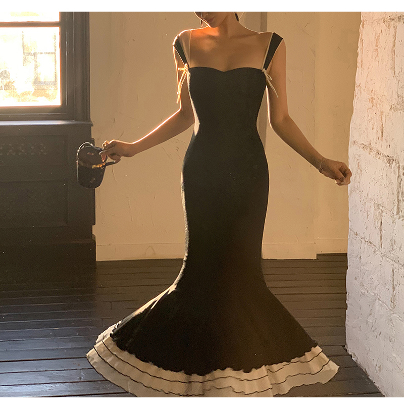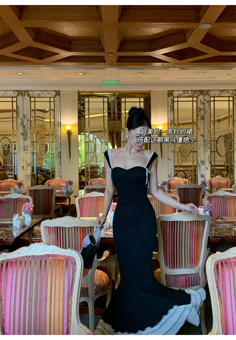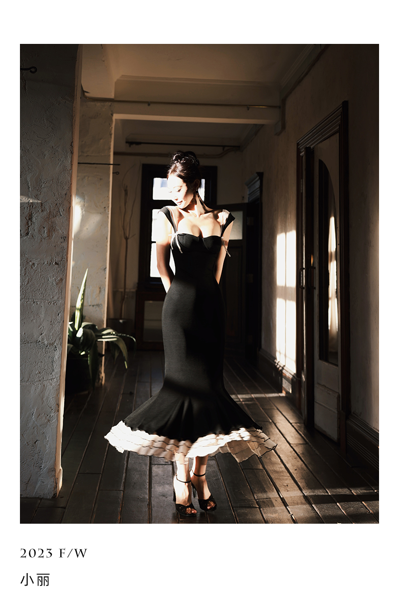小麗XIAOLI黑夜頌歌醋酸針織吊帶包臀連衣長裙秋冬高級顯瘦魚尾裙