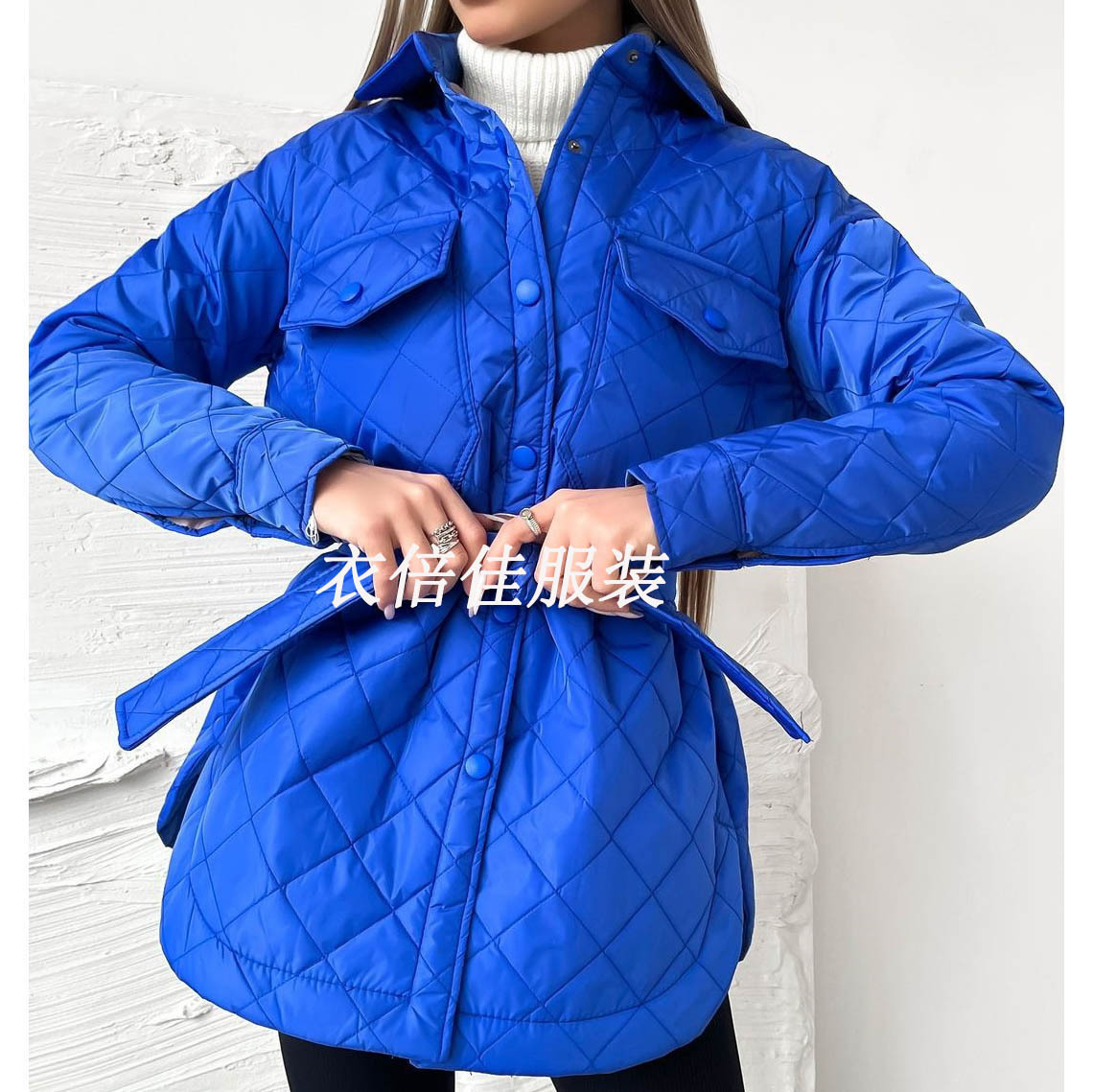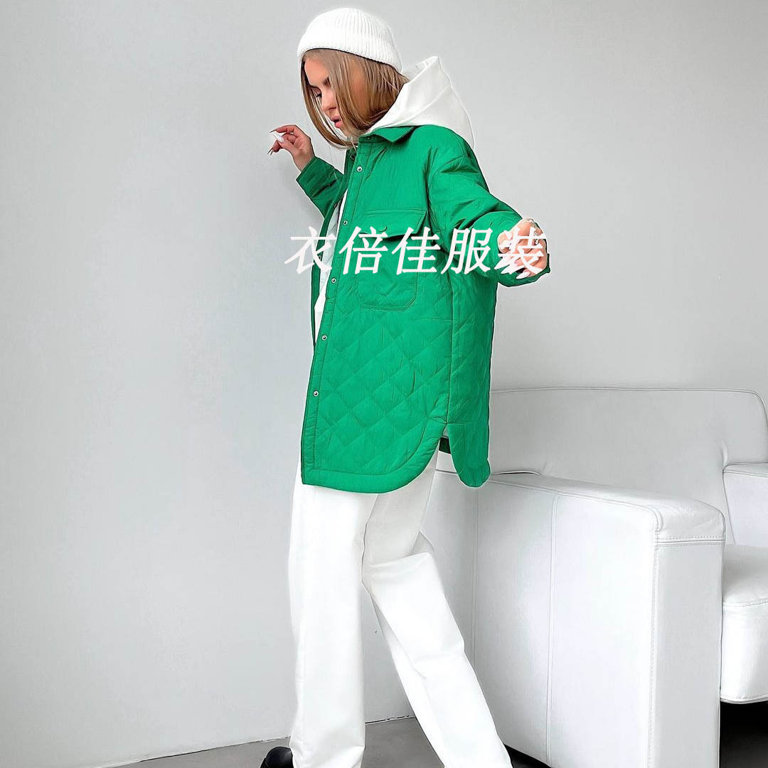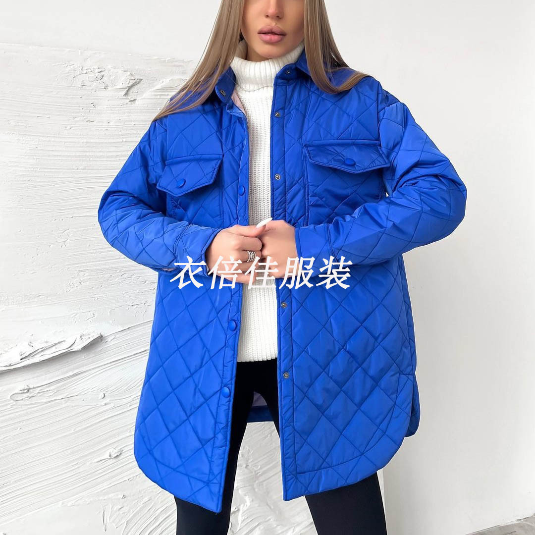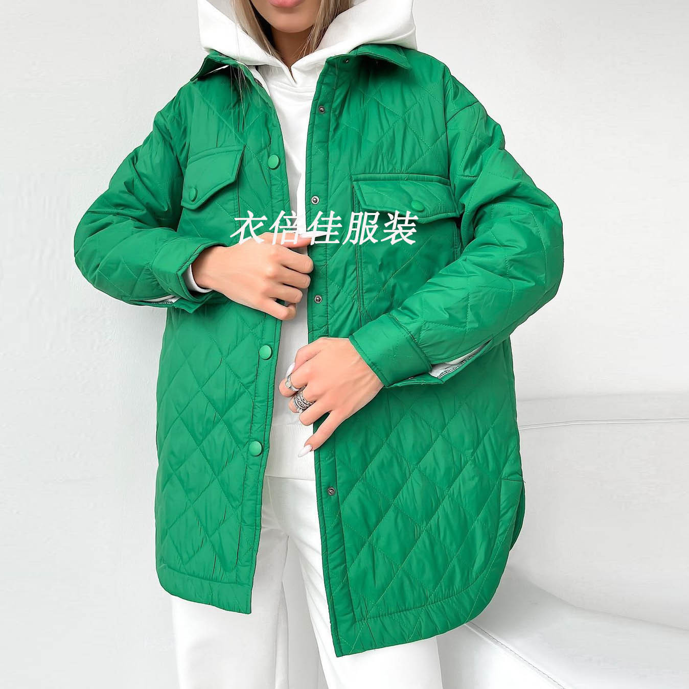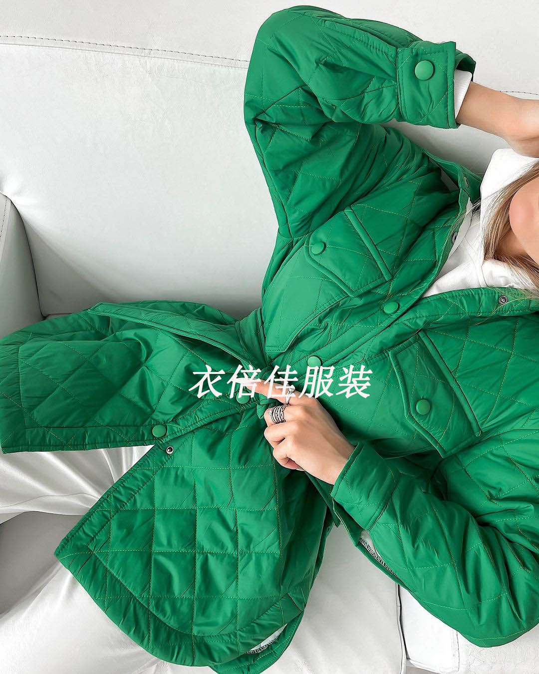 长款排扣翻领宽松保暖菱格棉服新款2022秋冬百搭加厚棉衣女欧美