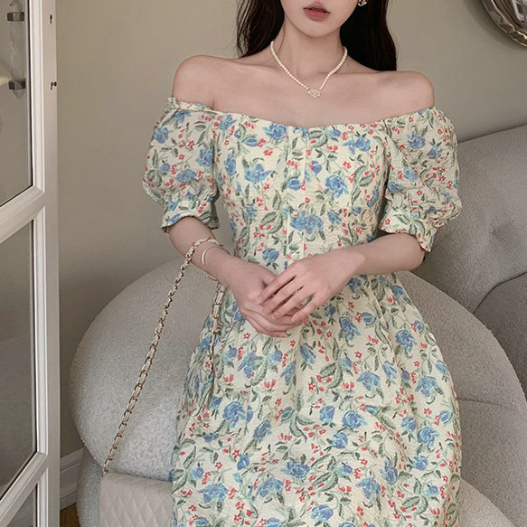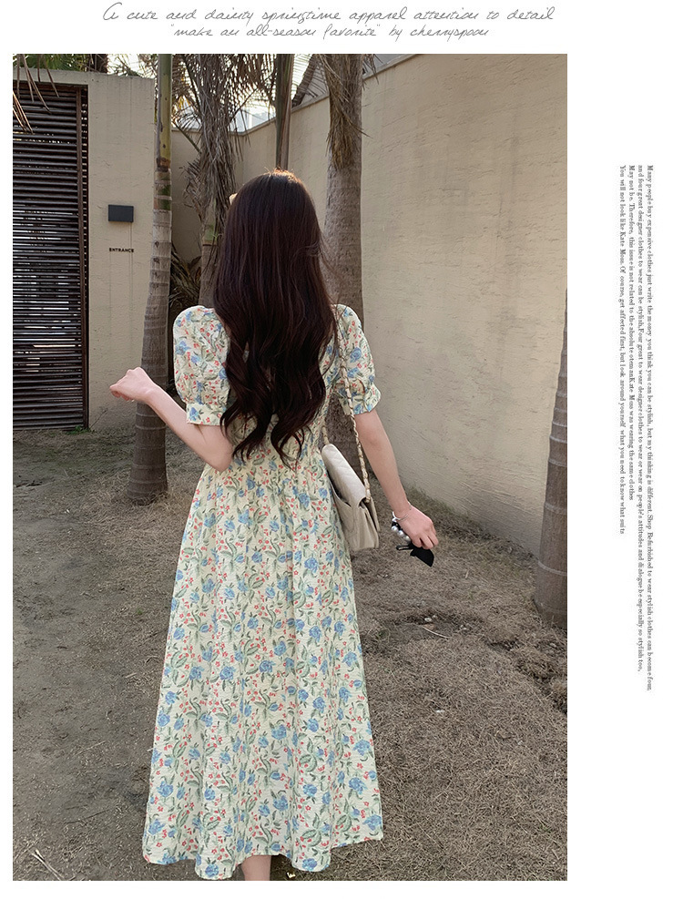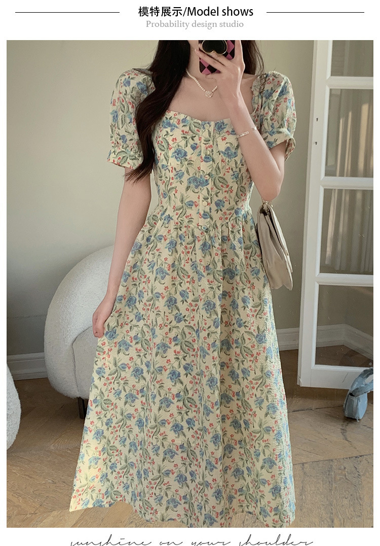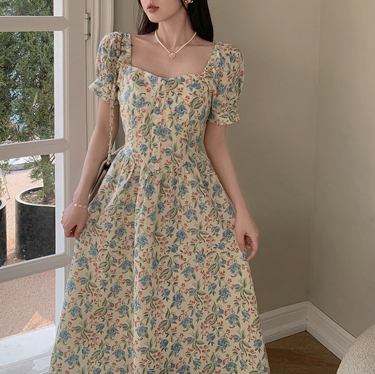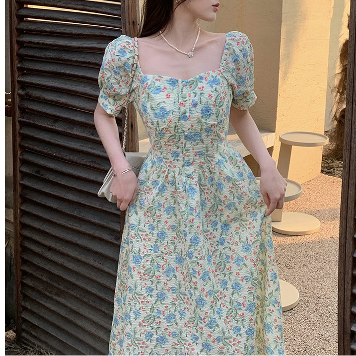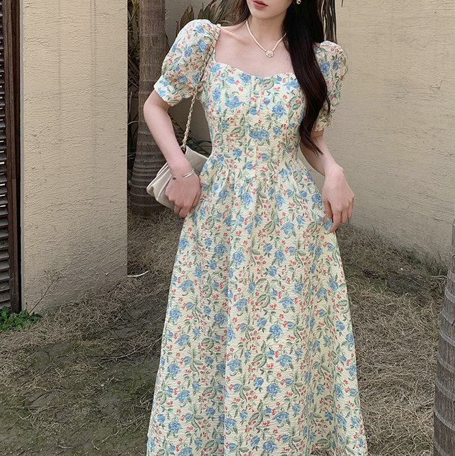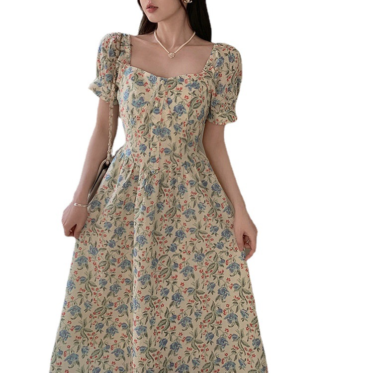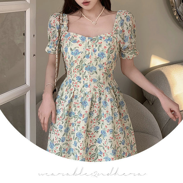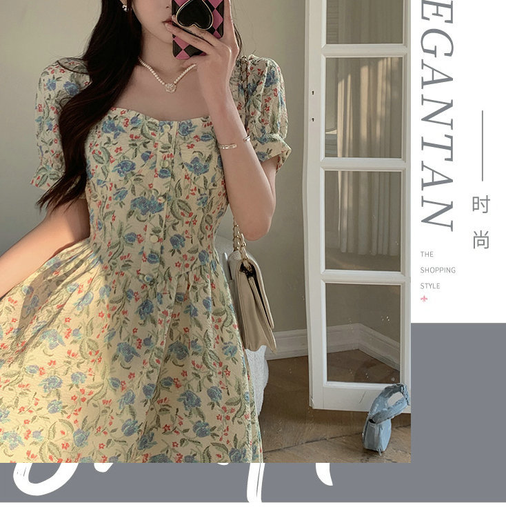 法式设计感小众方领泡泡袖碎花公主裙夏季显瘦气质百搭连衣裙子女