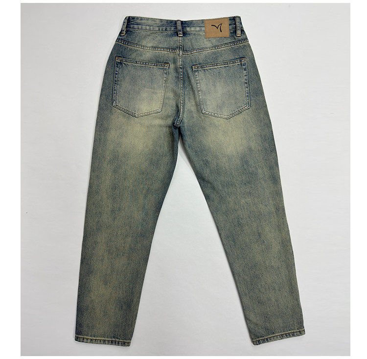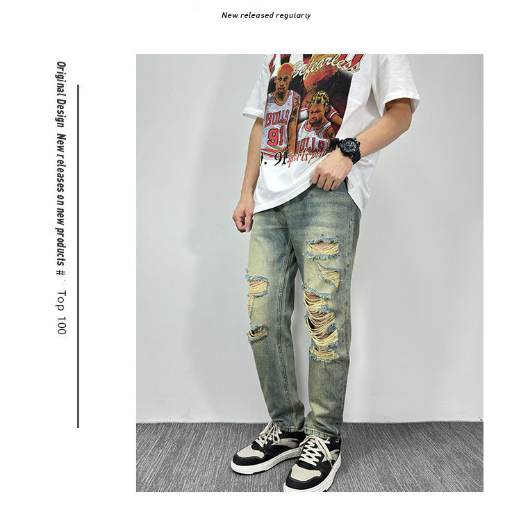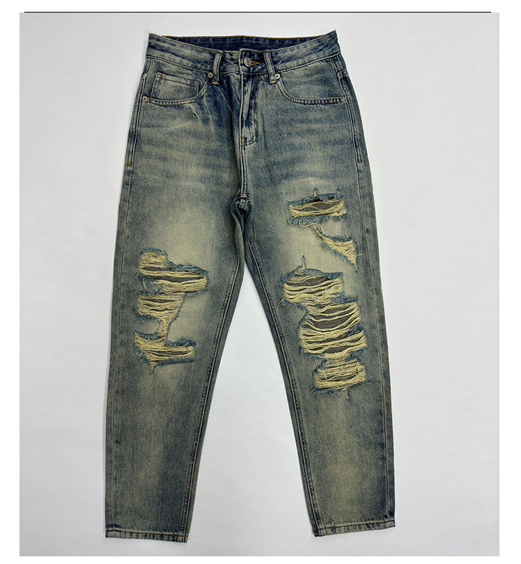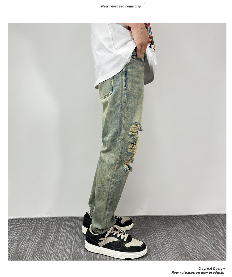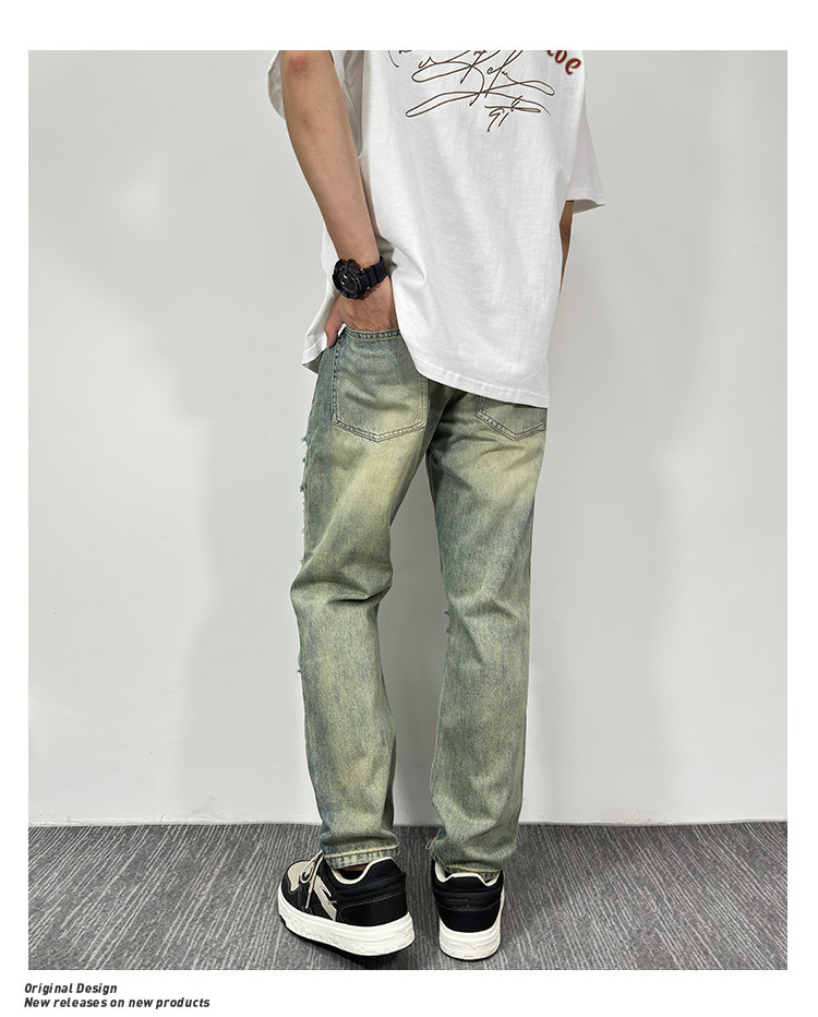 黃泥色牛仔褲男破洞潮牌美式高街寬鬆直筒夏季薄款復古原創新款褲