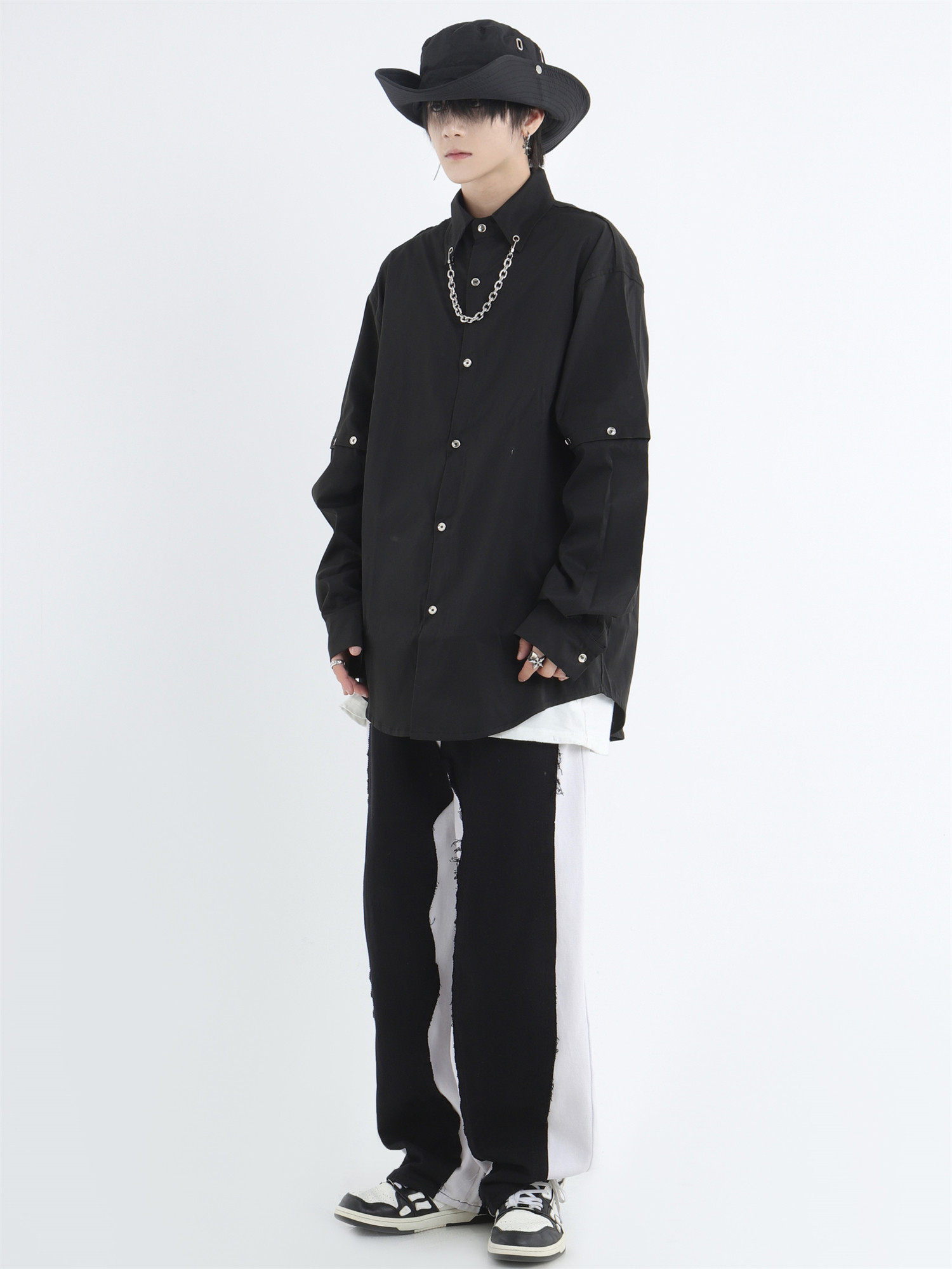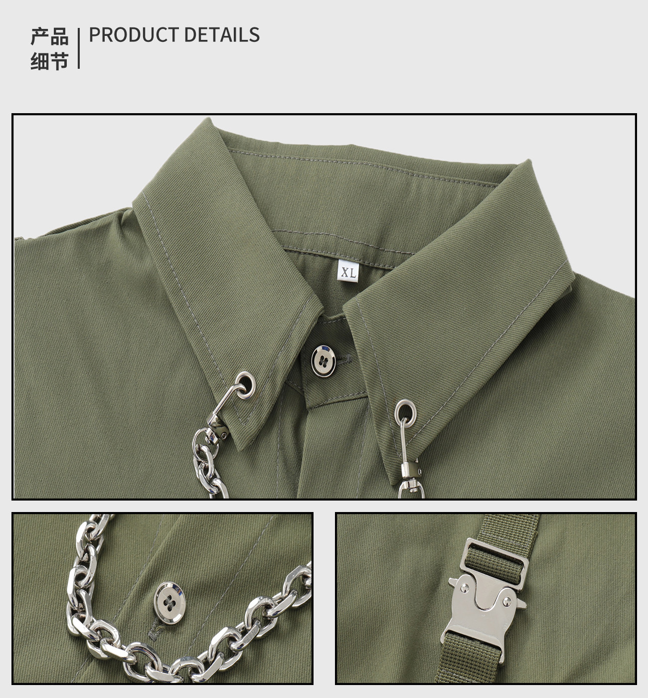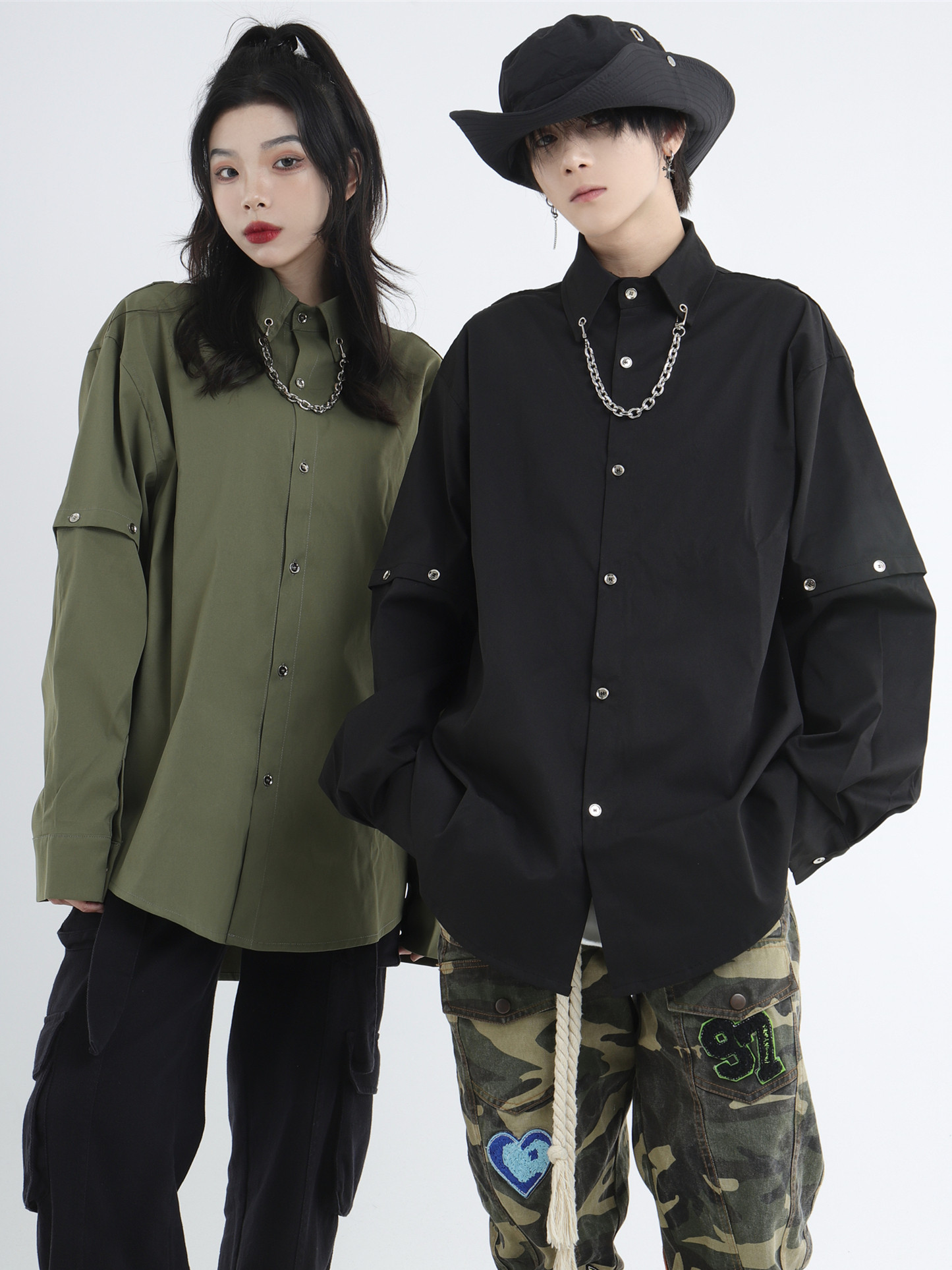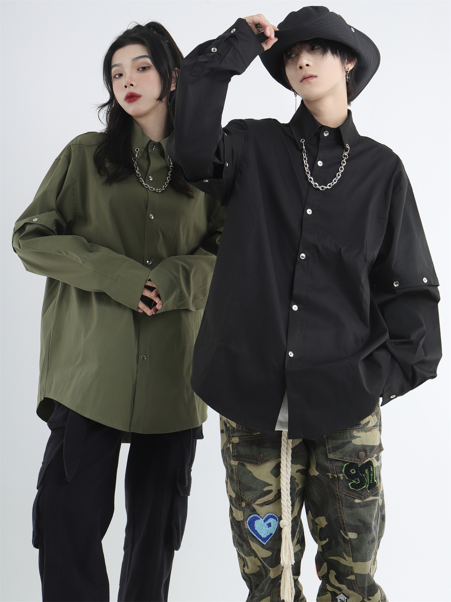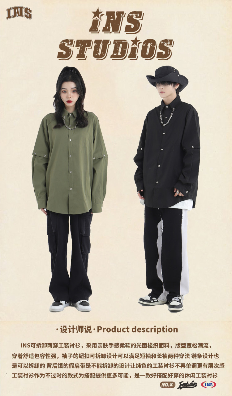 INSstudios 可拆卸兩穿工裝襯衫自制國潮情侶嘻哈美式長袖襯衫男