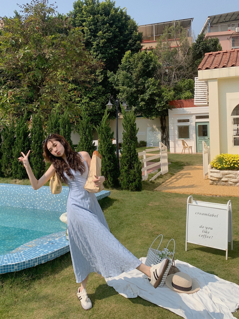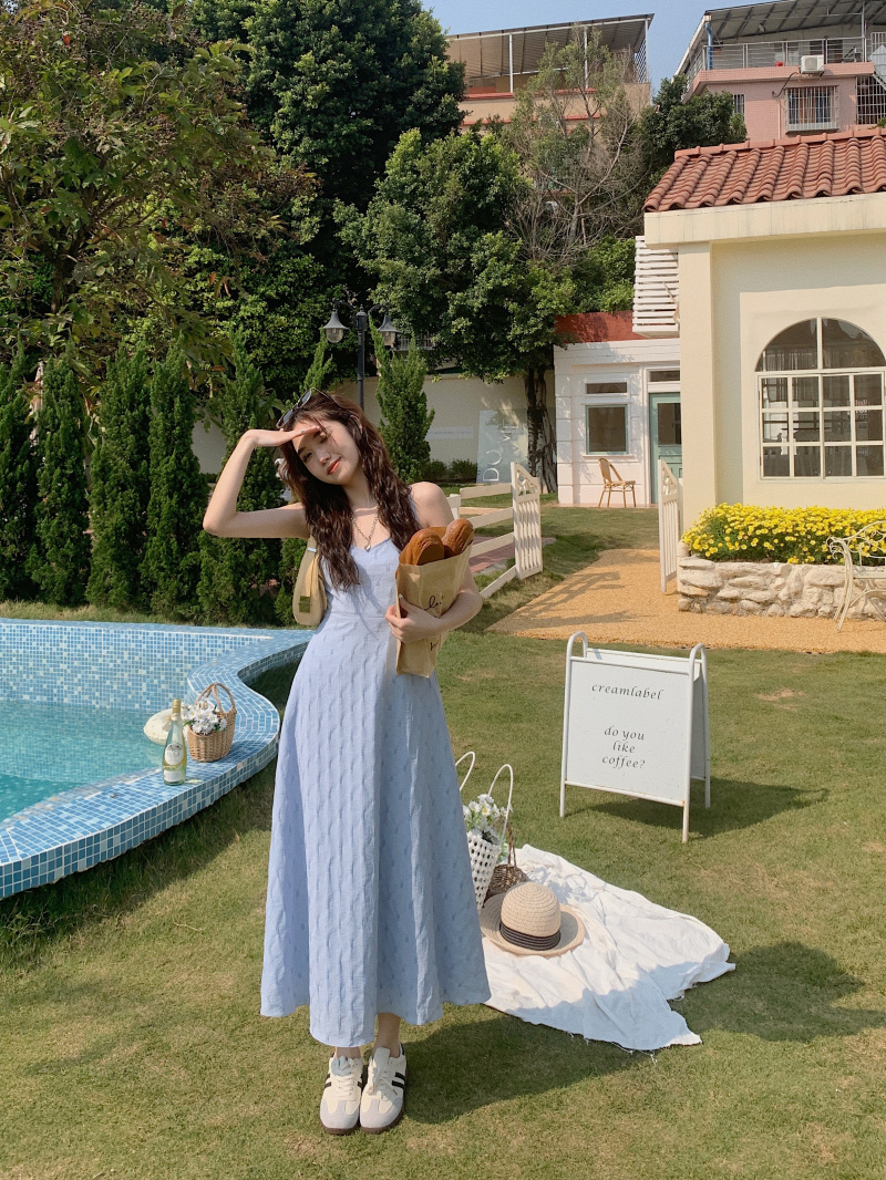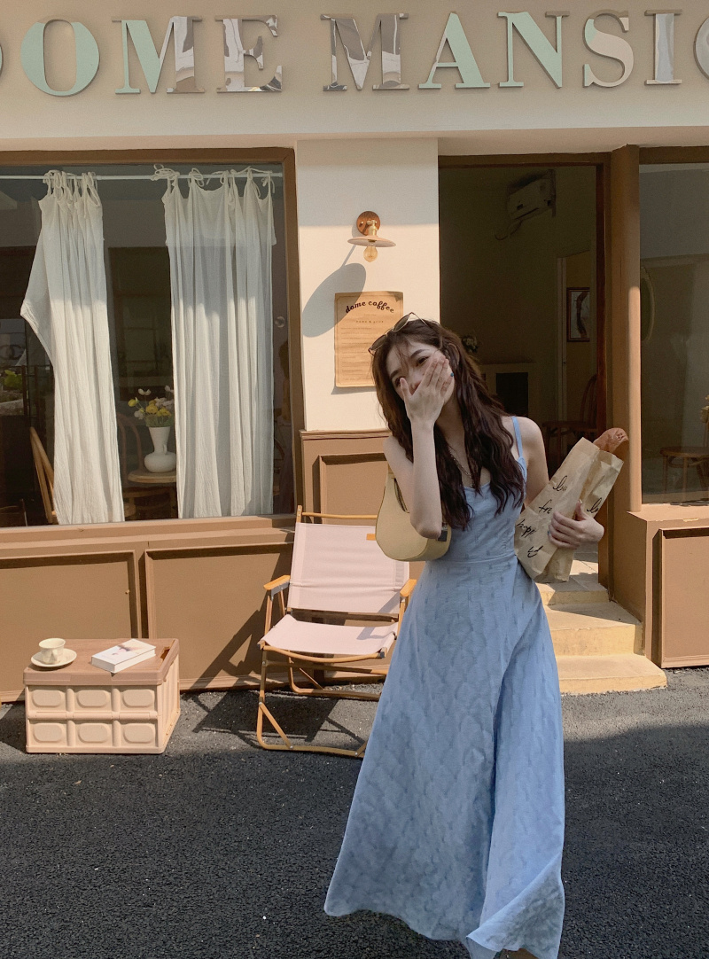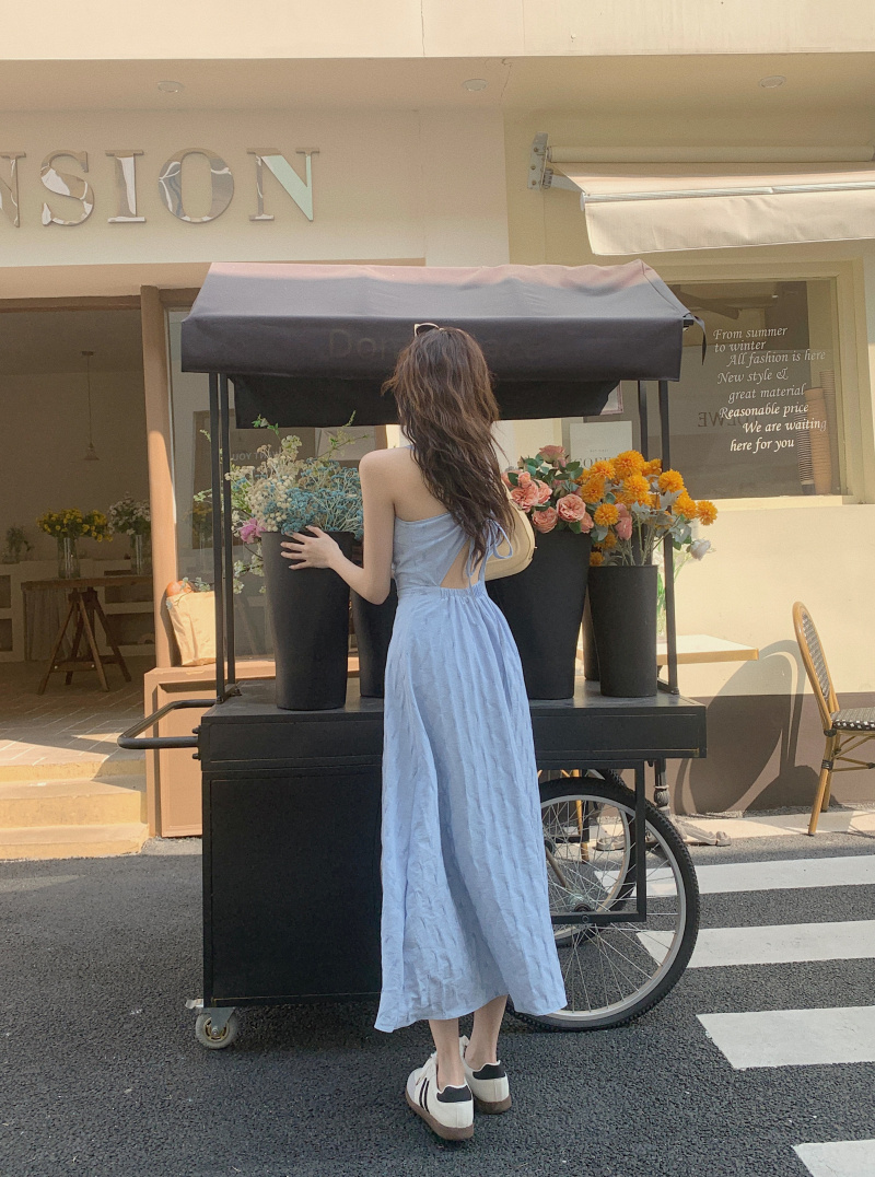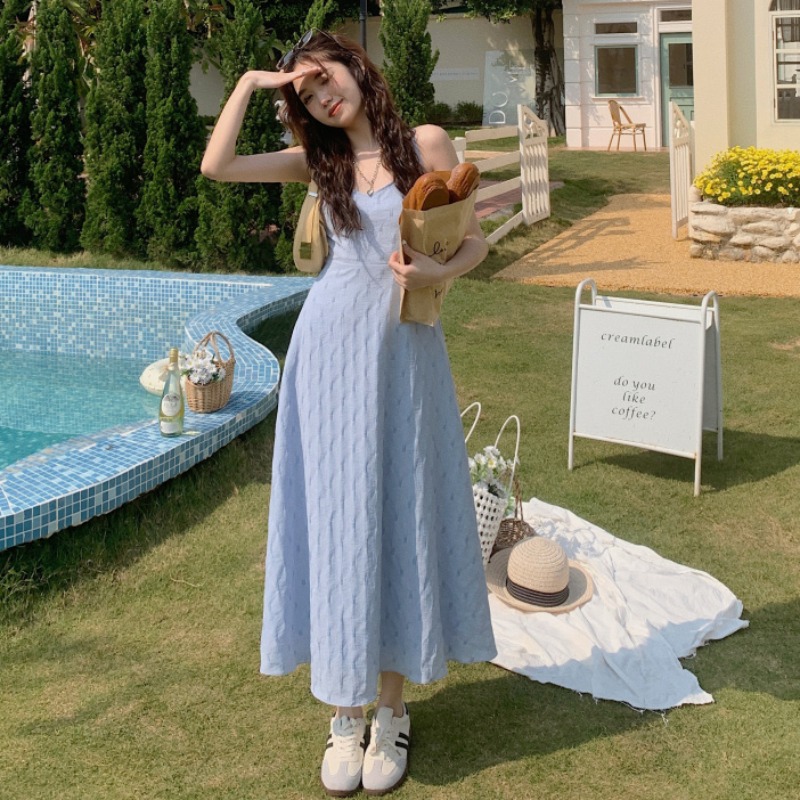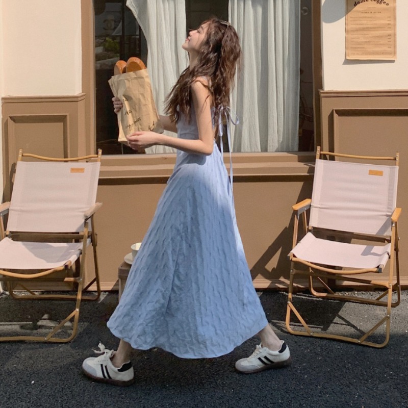 海邊度假風一字肩藍色吊帶洋裝女夏季高級感純欲露背收腰長裙子