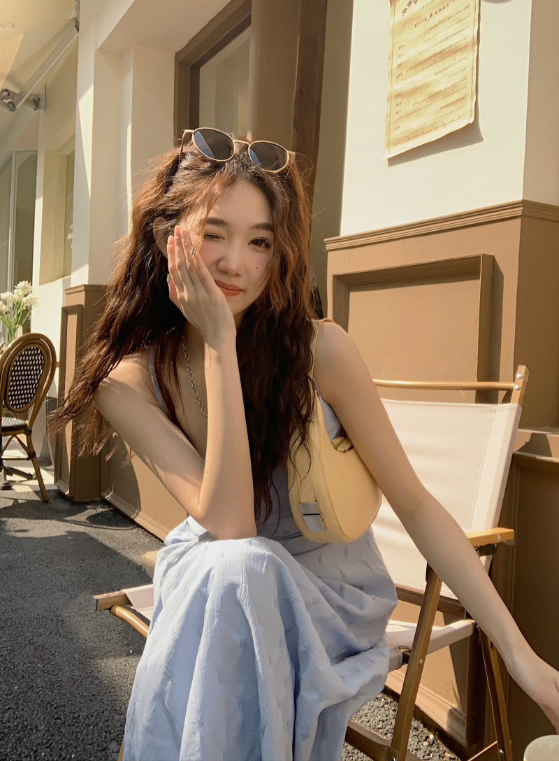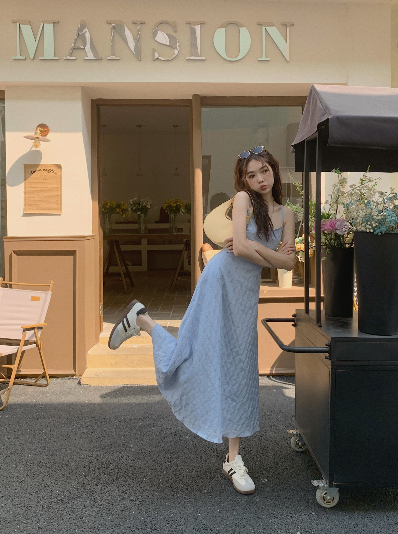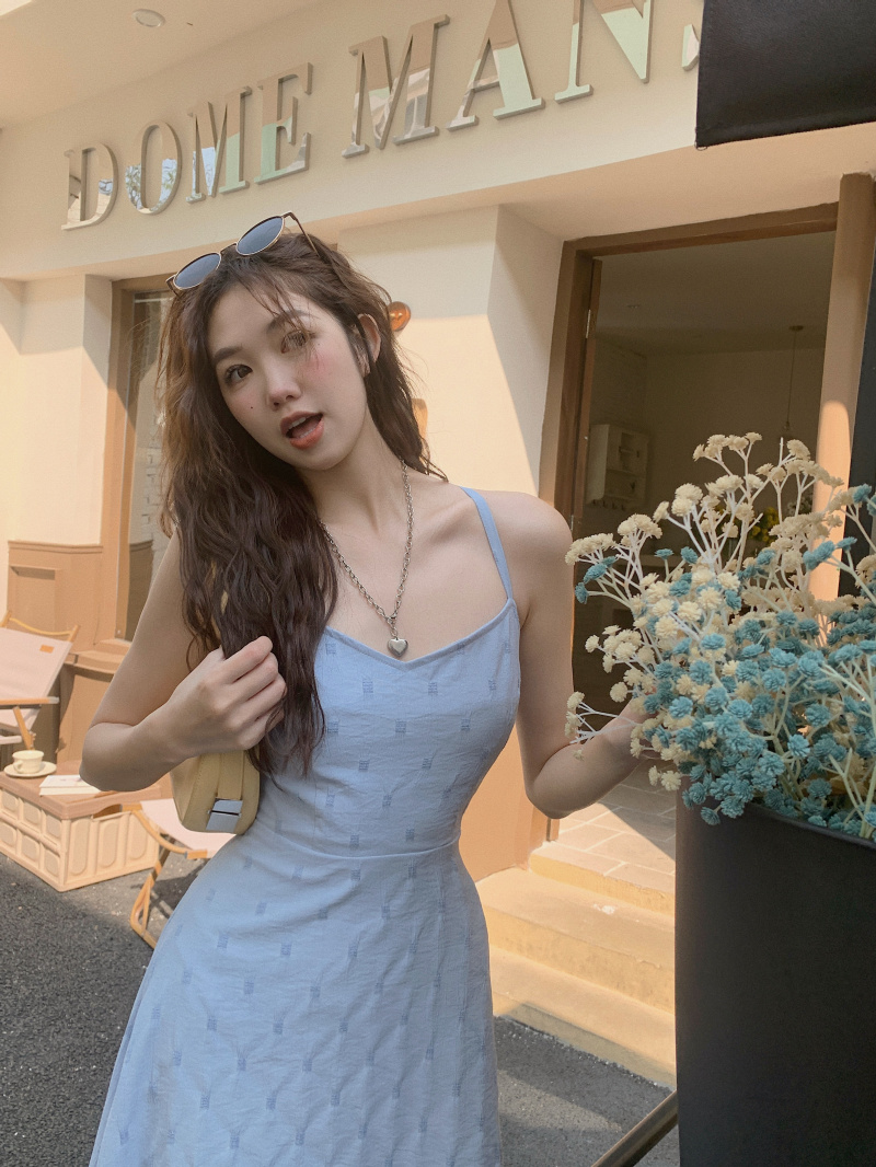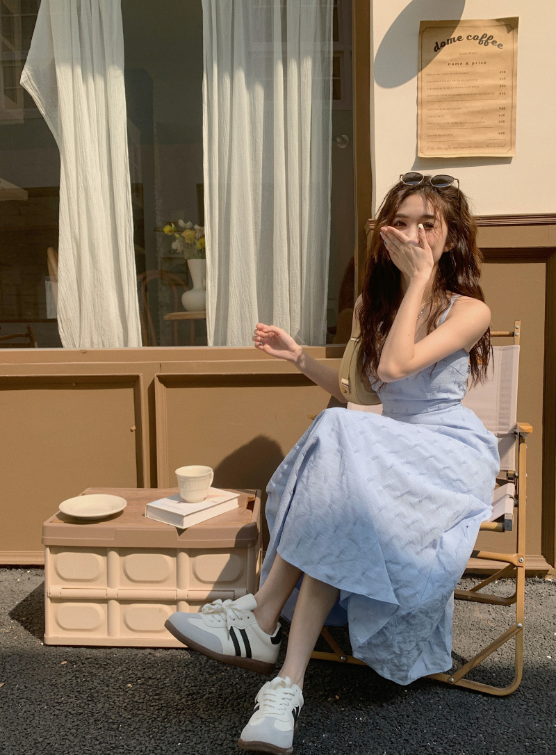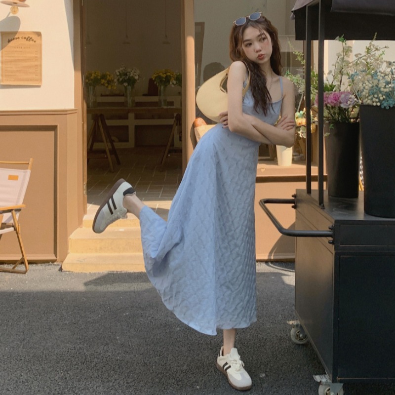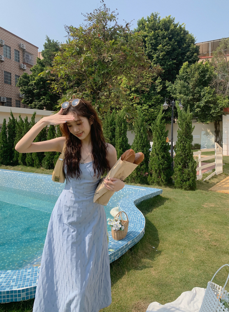 海邊度假風一字肩藍色吊帶洋裝女夏季高級感純欲露背收腰長裙子