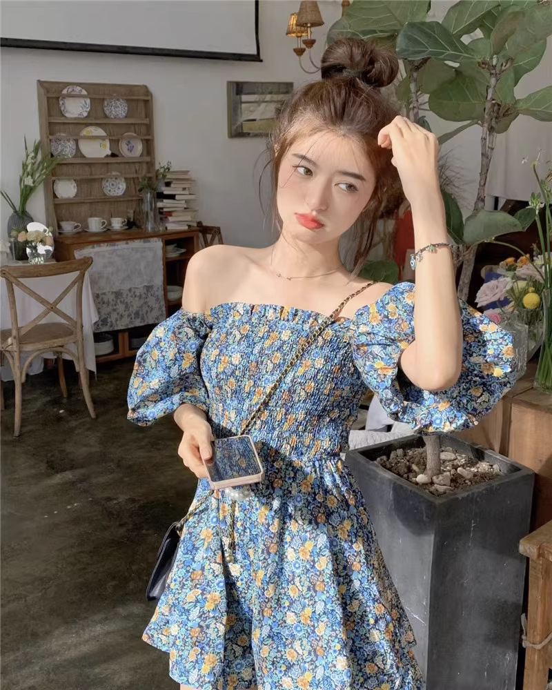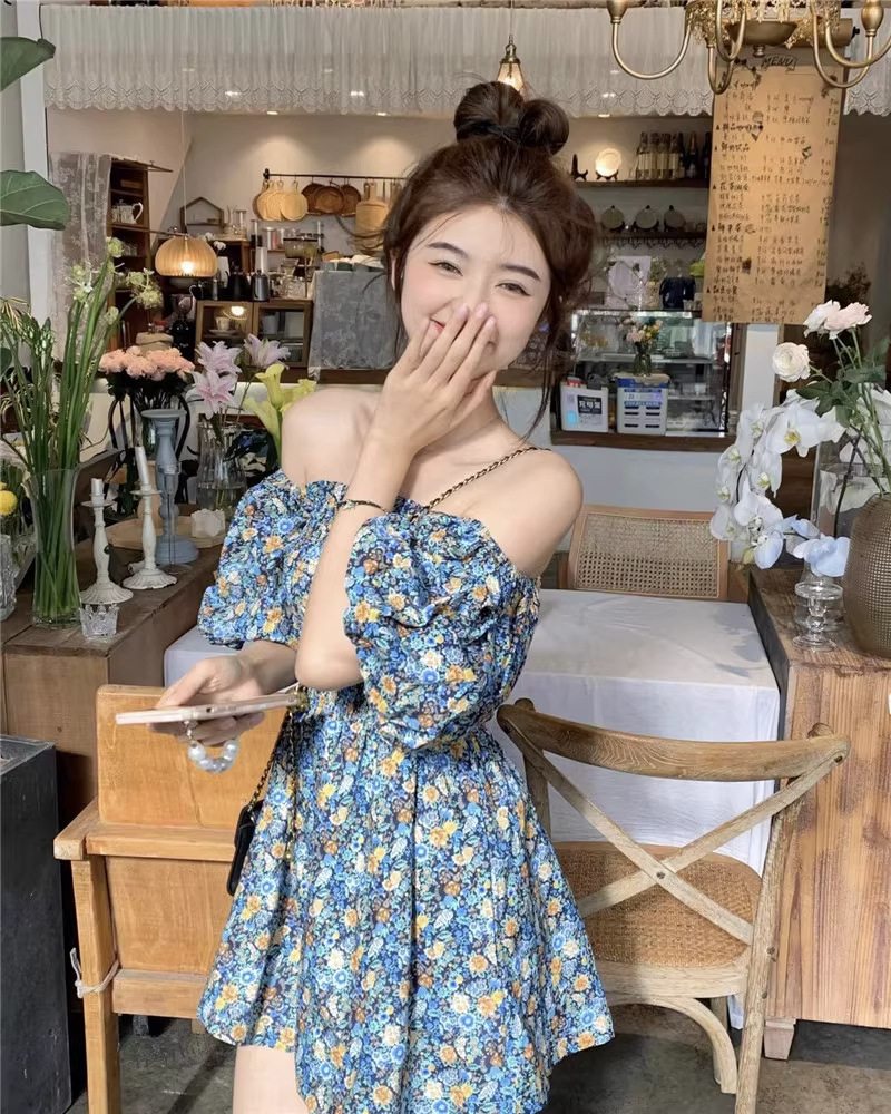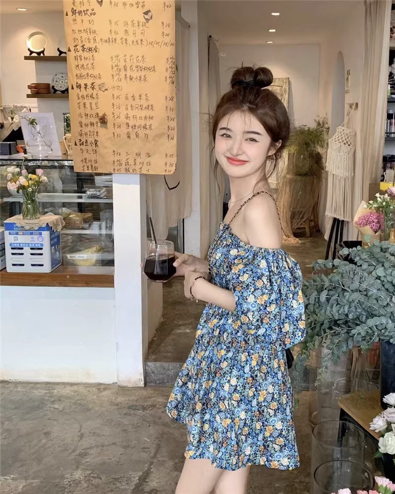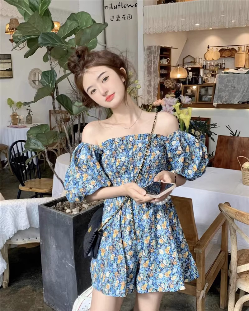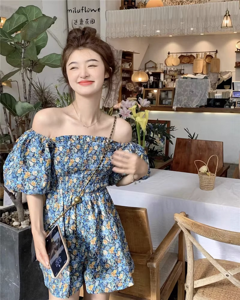 矮小个子时尚套装夏一字肩收腰连衣裤裙短款碎花连体裤休闲两件套
